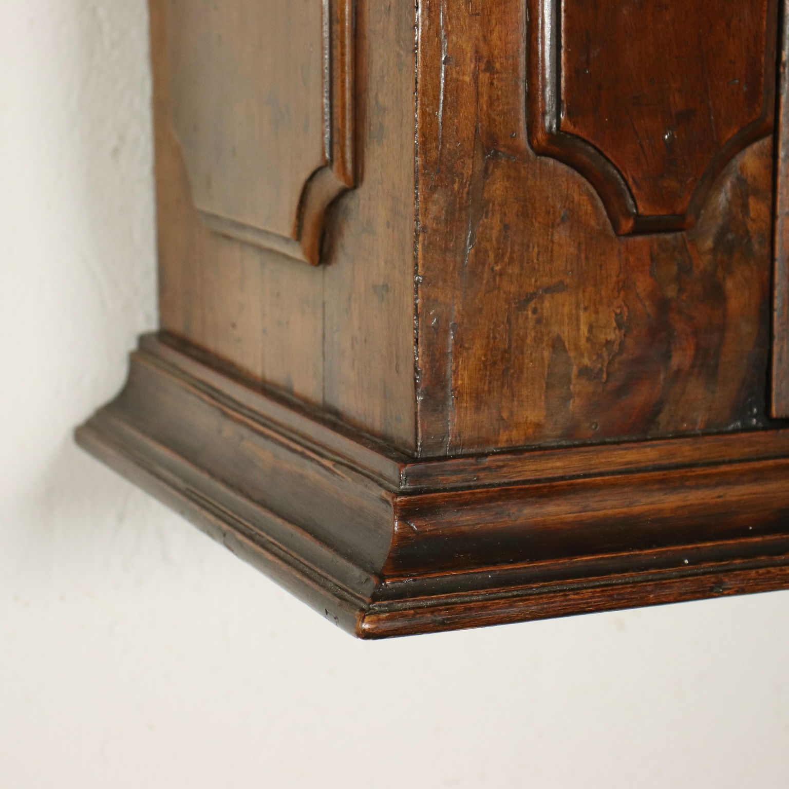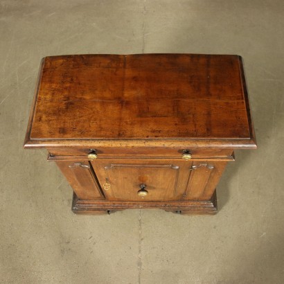 Descrizione Mobiletto con pensile barocco emiliano, sorretto da piedi a mensola, la parte inferiore sul fronte presenta un'anta sormontata da un cassetto; il pensile presenta un'anta. In noce, il fronte e i fianchi sono intagliati con le caratteristiche formelle, cornicetta intagliata posta sottopiano.