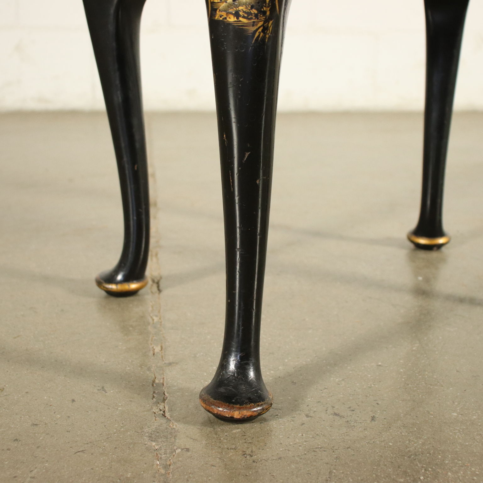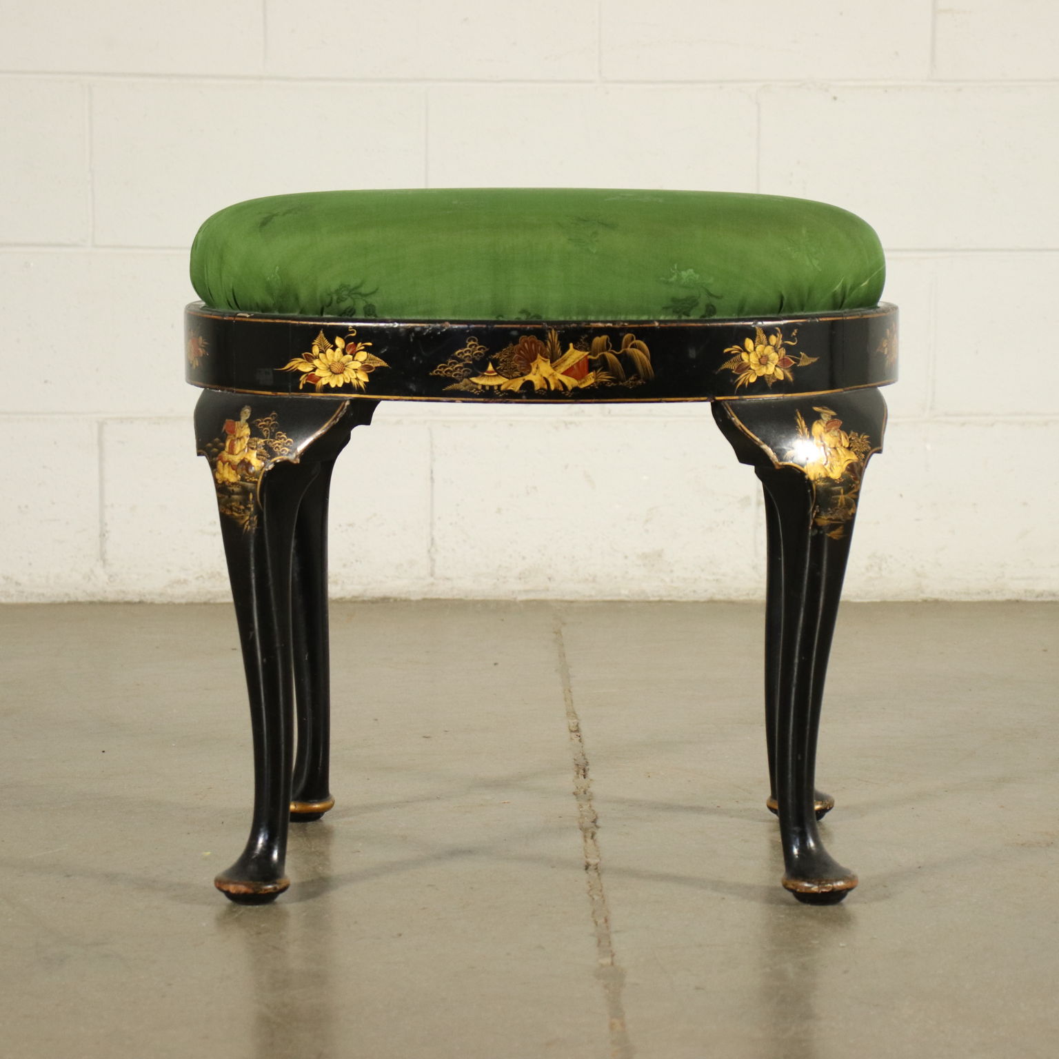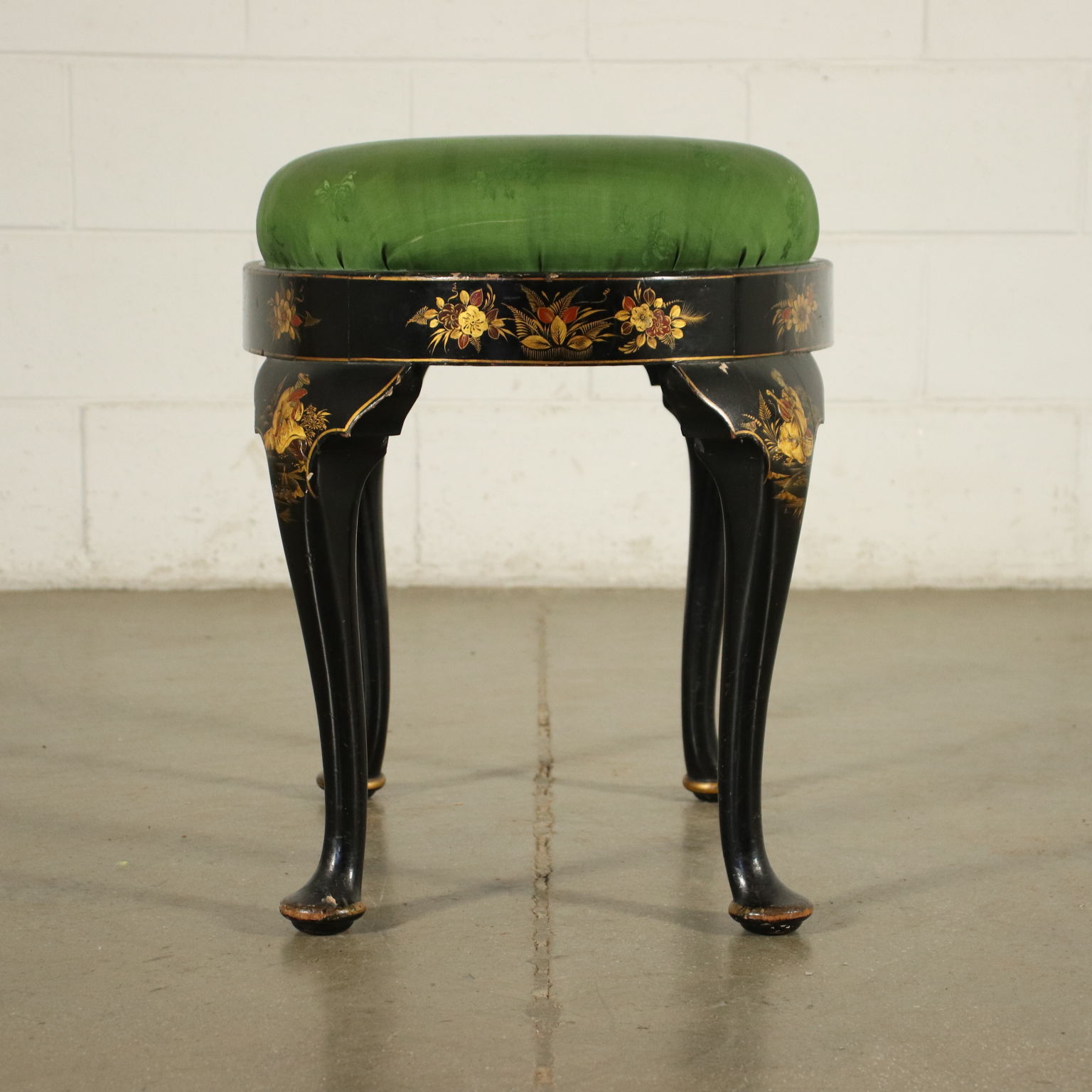 Sgabello inglese sorretto da quattro gambe a cabriole, è interamente laccato e decorato con motivi floreali e paesaggi in stile chinoiserie, così come le figure raffigurate nella parte superiore delle gambe, in abiti orientali.