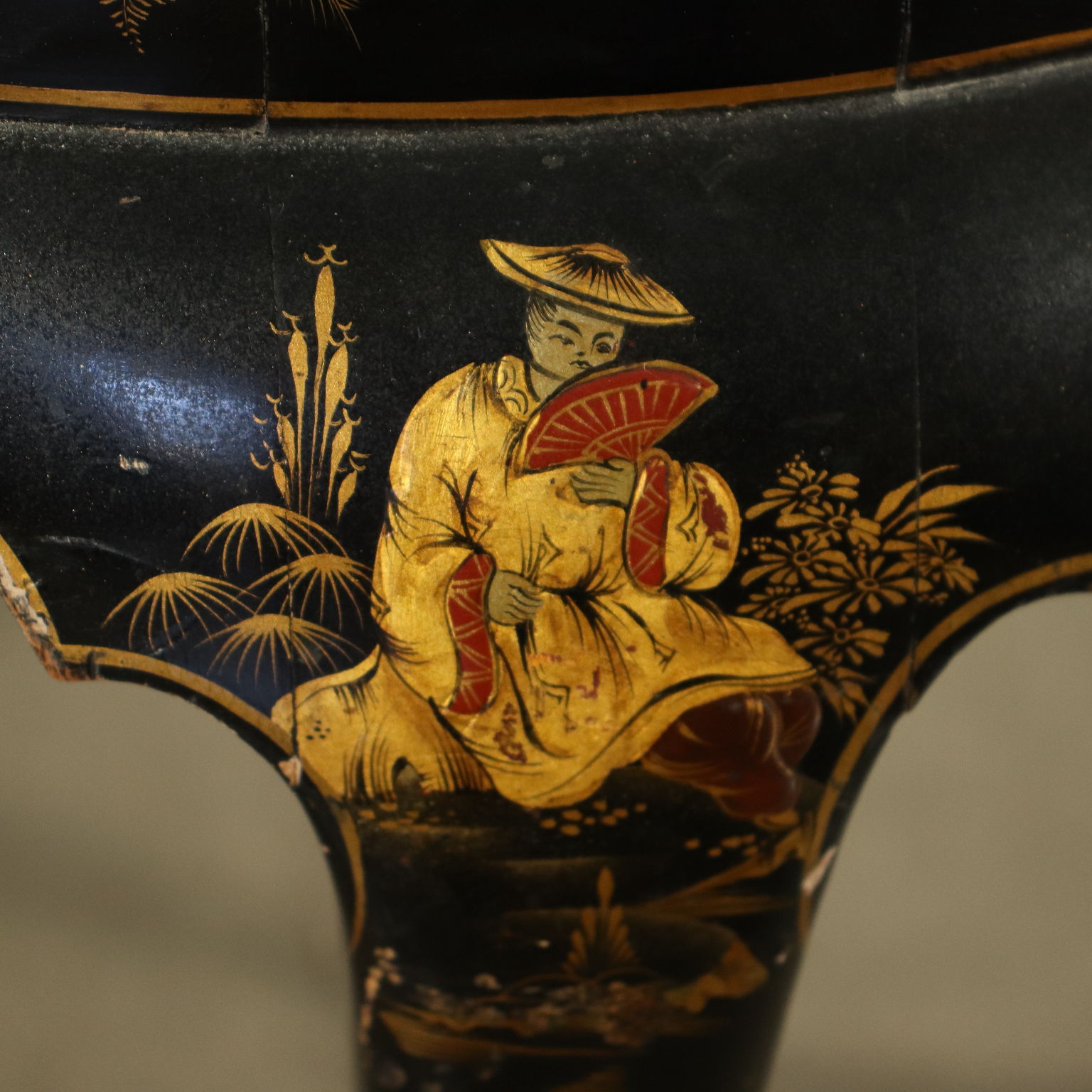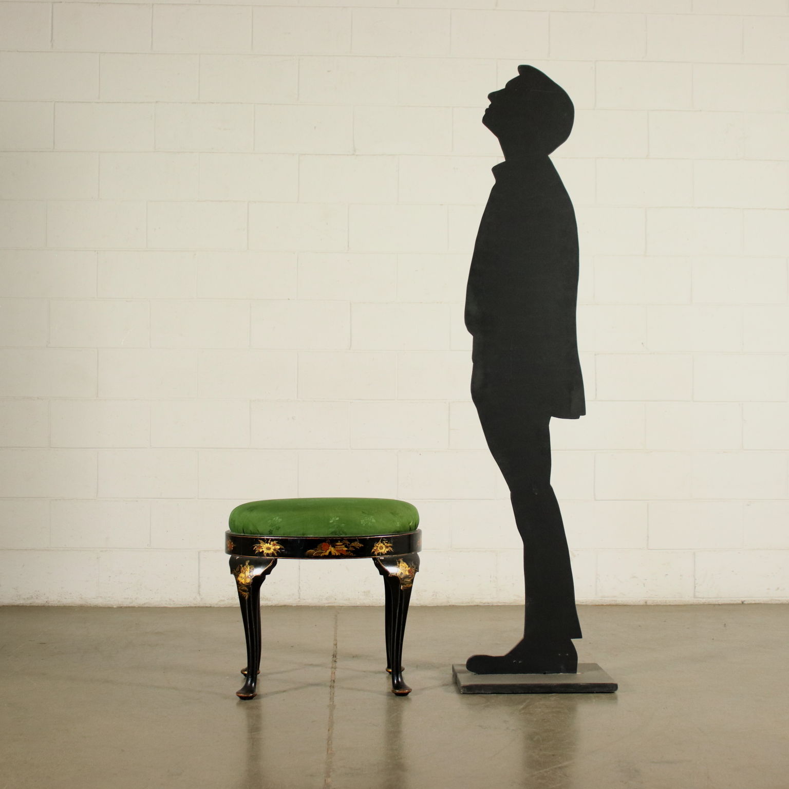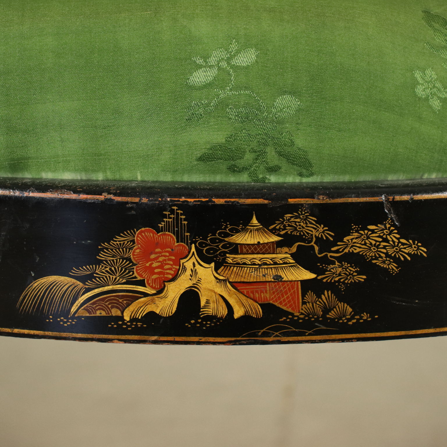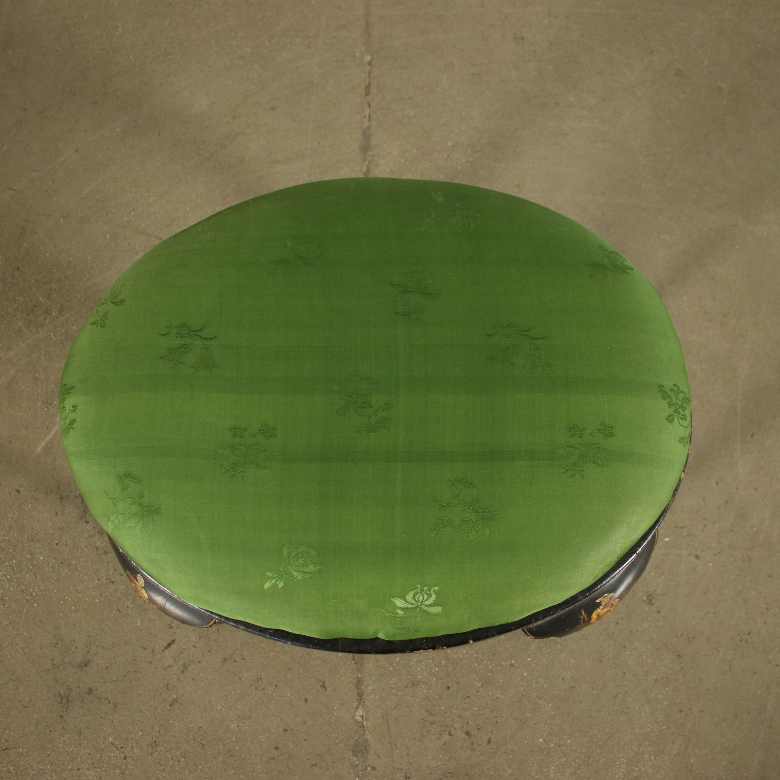 Sgabello inglese sorretto da quattro gambe a cabriole, è interamente laccato e decorato con motivi floreali e paesaggi in stile chinoiserie, così come le figure raffigurate nella parte superiore delle gambe, in abiti orientali.