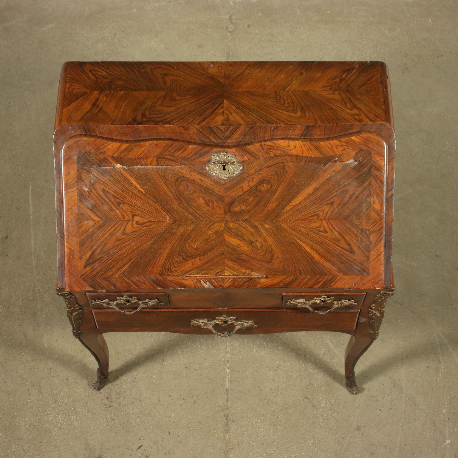 Ribaltina rococò francese a giorno, sorretta da gambe mosse, sul fronte presenta un cassetto più due dalle dimensioni ridotte, sormontati da un'anta apribile a ribalta e celante scarabattolo con piano scrittoio in marocchino e con cassetti a scalare e vano centrale. Impiallacciato in bois de violette quadripartito, gli interni sono in rovere; ornato con applicazioni bronzee nelle bocchette, nelle maniglie, sui montanti e nelle scarpette bronzee.