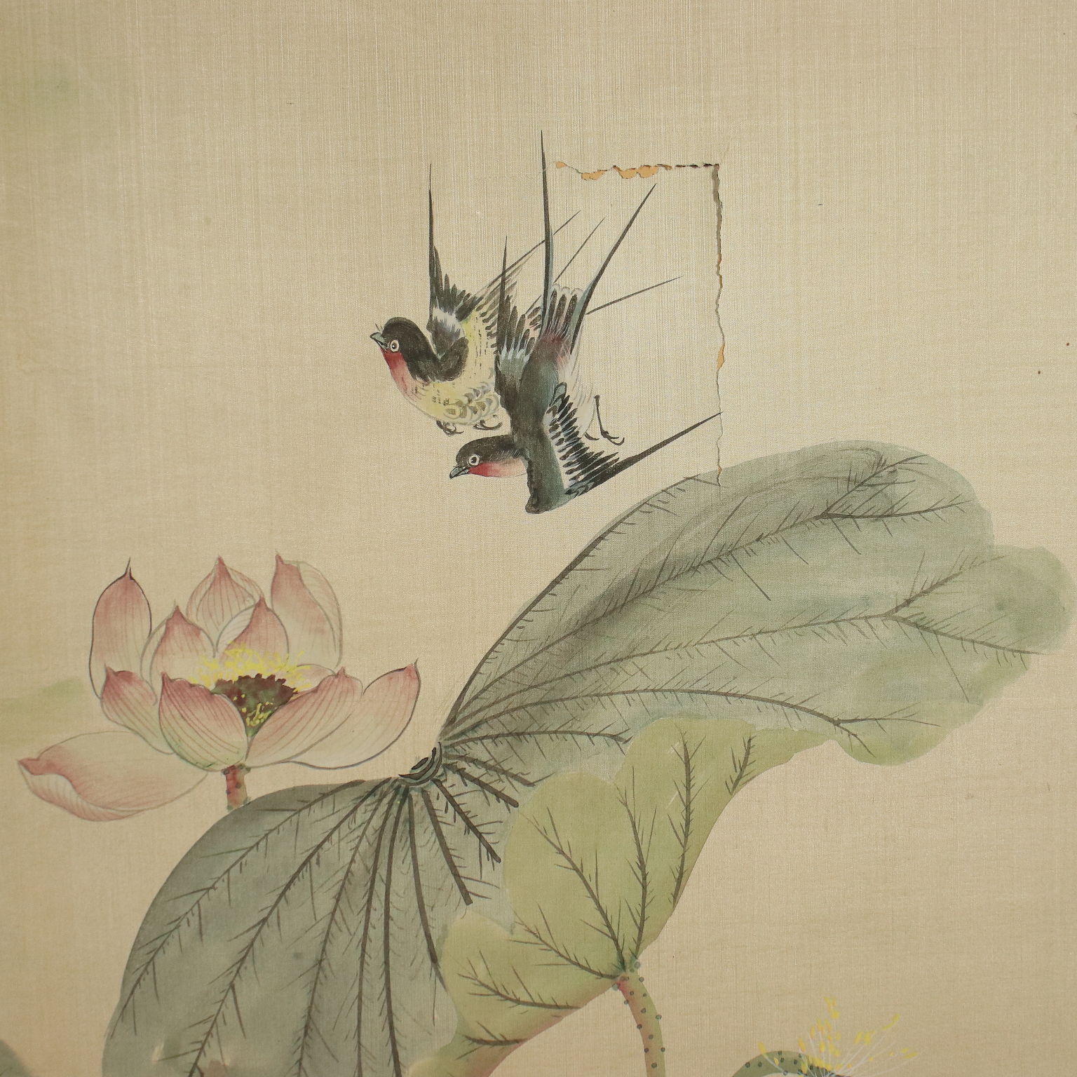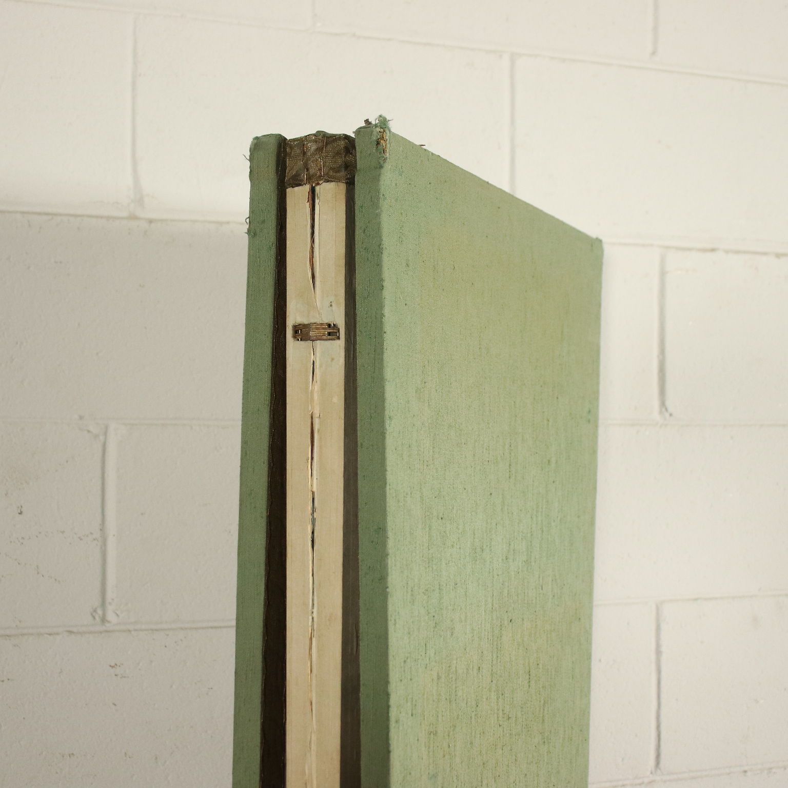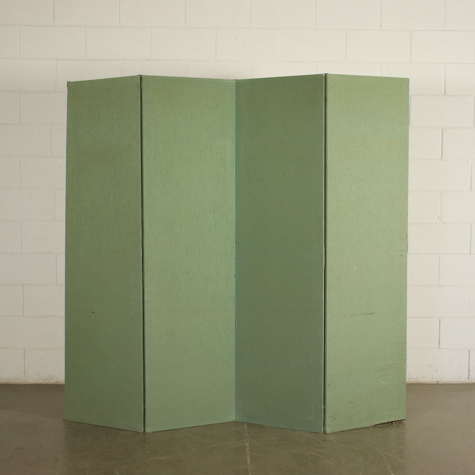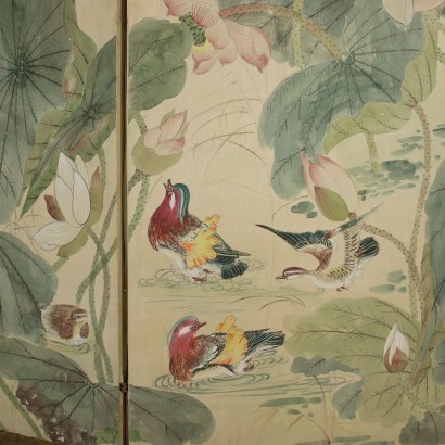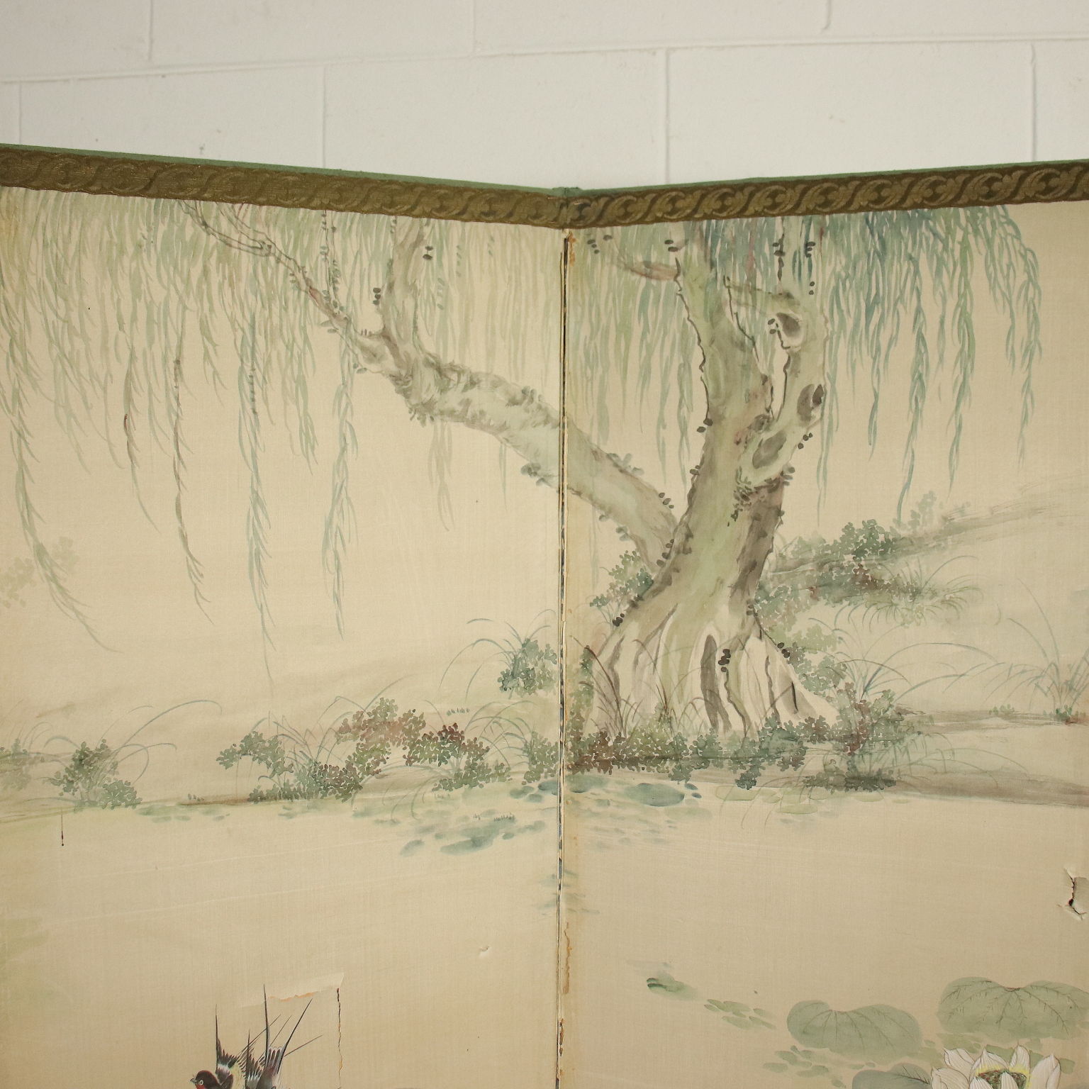 Separé costituito da quattro pannelli rivestiti in tessuto dipinto con motivi orientali, raffiguranti paesaggio lacustre e volatili.