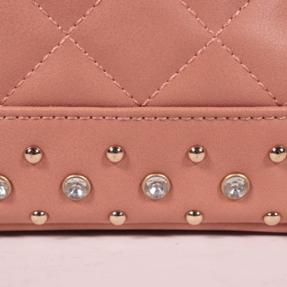 Borsa a mano dotata di tracolla a catena, in tessuto trapuntato rosa antico, con decorazione di borchie e strass sul fondo. Particolari i manici in metallo dorato, rivestiti nel medesimo tessuto della borsa. Interno capiente, dotato di tre tasche.