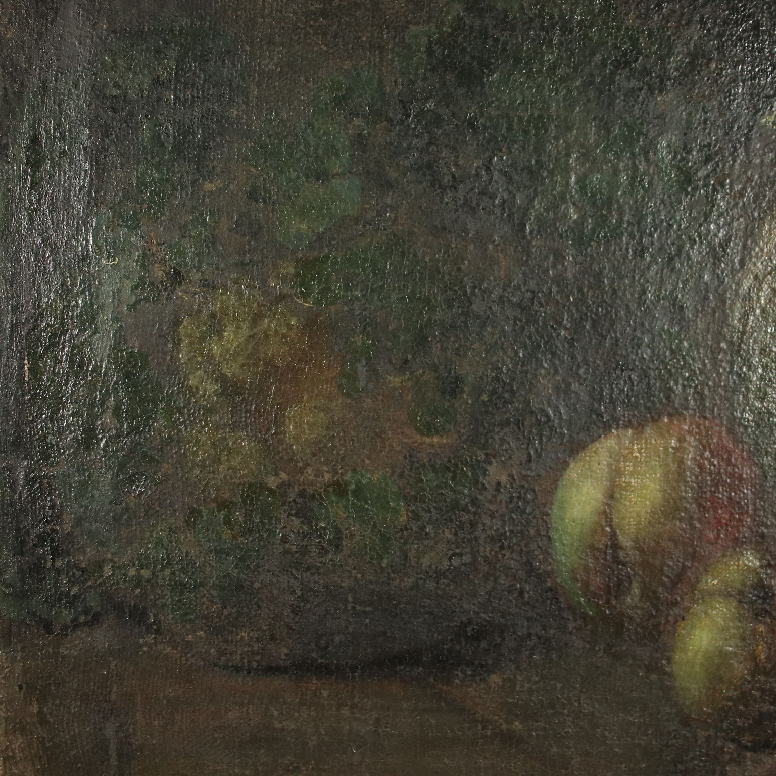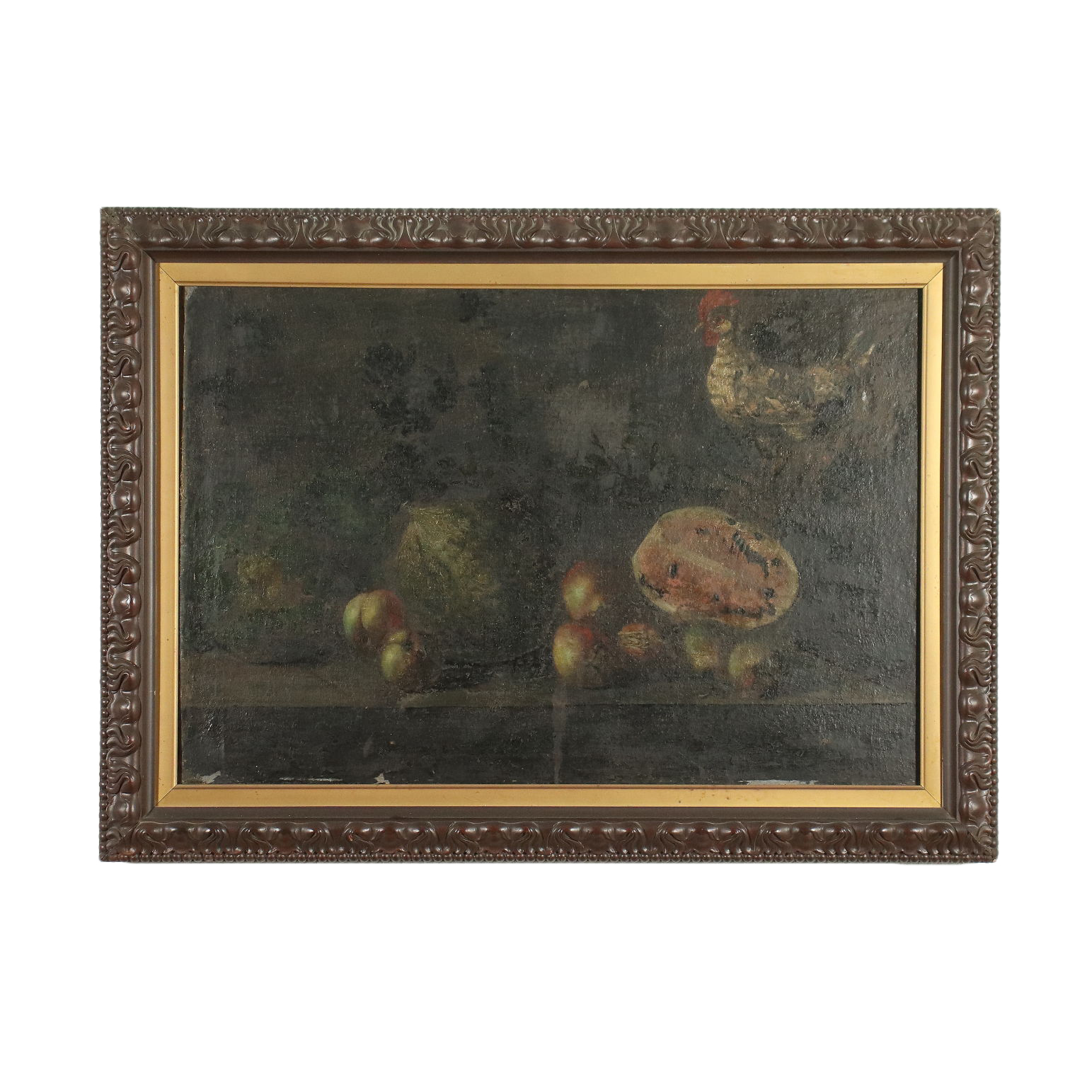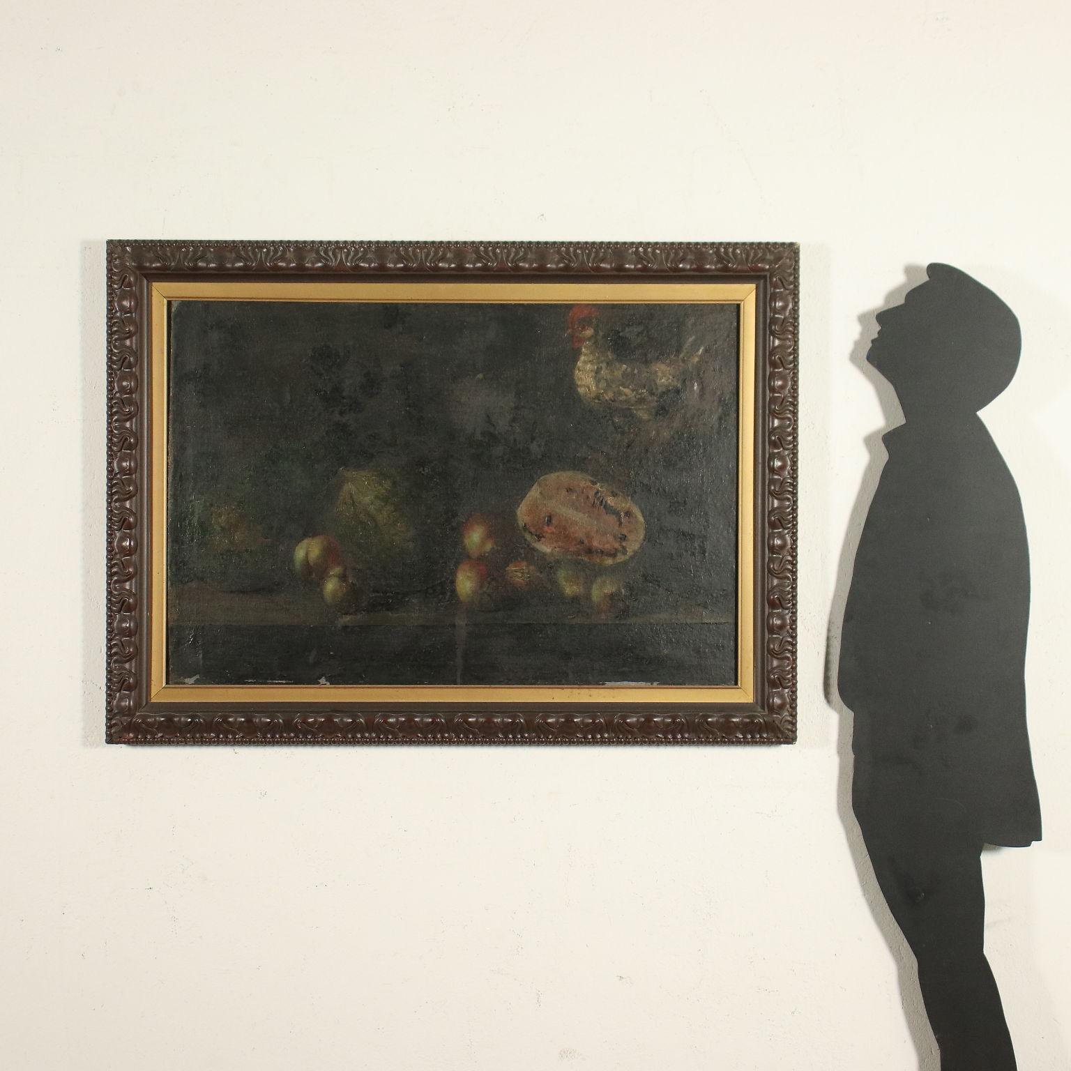 Olio su tela. Scuola italiana. La composizione presenta un insieme di frutta (anguria, pere, pesche e melograni) e verdura (una grande zucca e dei cavolfiori a sinistra) poggiati liberamente su un ripiano; a destra, probabilmente in piedi sulla scaletta del pollaio che si intuisce appena, spicca una fiera gallinella. La composizione, già ritelata e restaurata, necessita di pulizia e restauro per lievi cadute di colore. E' presentata in cornice in stile.