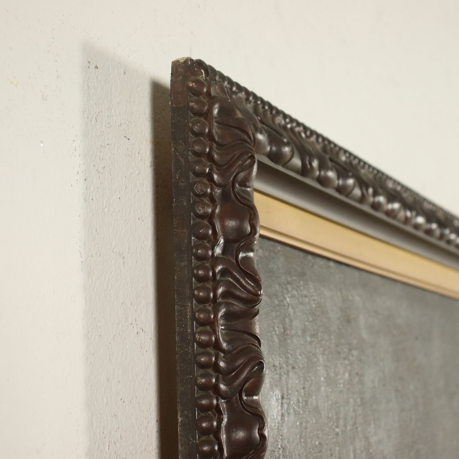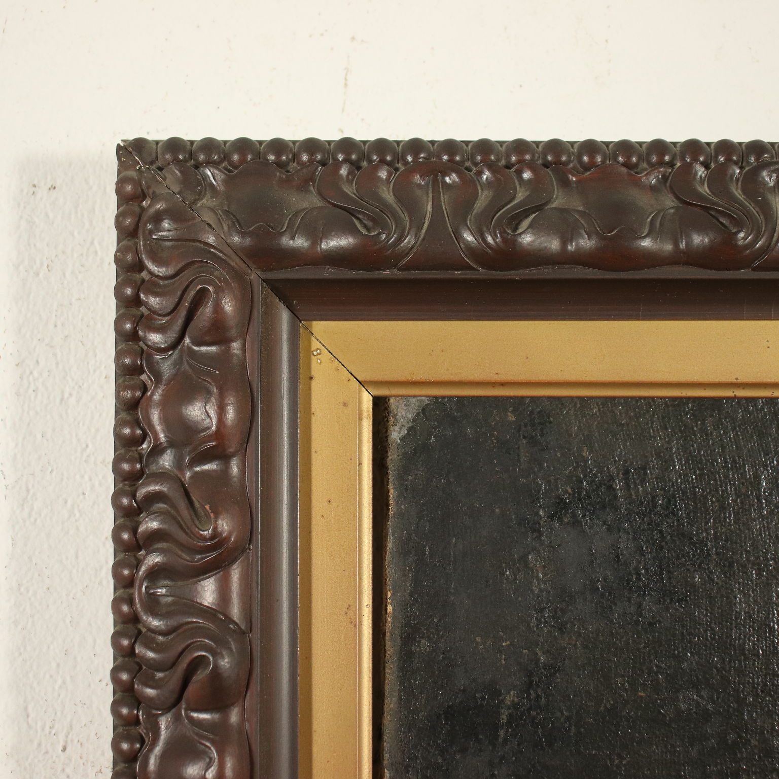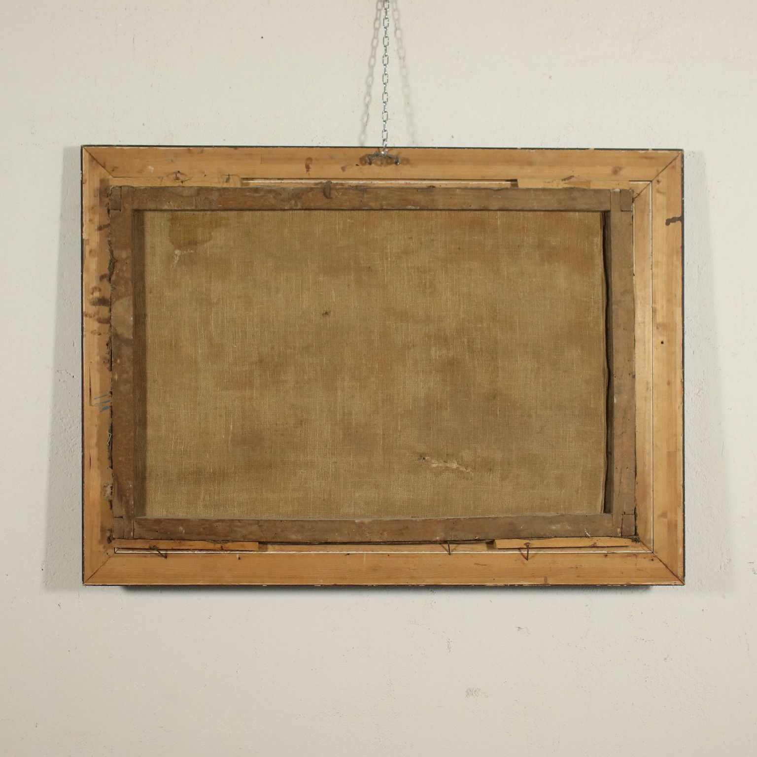 Olio su tela. Scuola italiana. La composizione presenta un insieme di frutta (anguria, pere, pesche e melograni) e verdura (una grande zucca e dei cavolfiori a sinistra) poggiati liberamente su un ripiano; a destra, probabilmente in piedi sulla scaletta del pollaio che si intuisce appena, spicca una fiera gallinella. La composizione, già ritelata e restaurata, necessita di pulizia e restauro per lievi cadute di colore. E' presentata in cornice in stile.