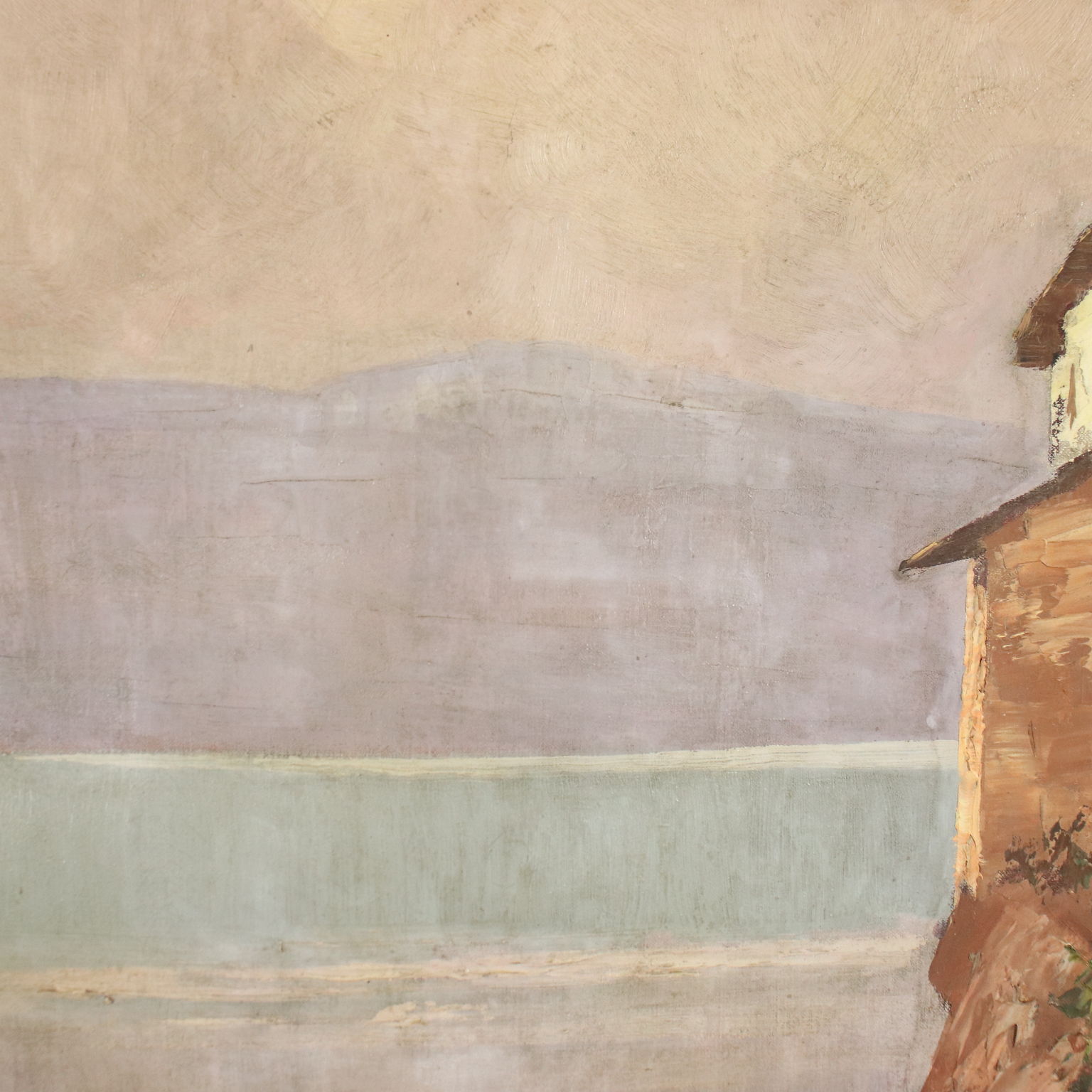 Olio su tela. Firmato A. Mantovani in basso a destra. Scorcio del famoso eremo arroccato sulla sponda orientale del Lago Maggiore, fondato nel XIV secolo e sede di un monastero in cui si sono succeduti differenti ordini religiosi. Il dipinto è realizzato con un utilizzo fortemente materico del colore, che aumenta il rigoglio della vegetazione in primo piano. La tela è stata restaurata e ritensionata. E' presentata in cornice coeva.