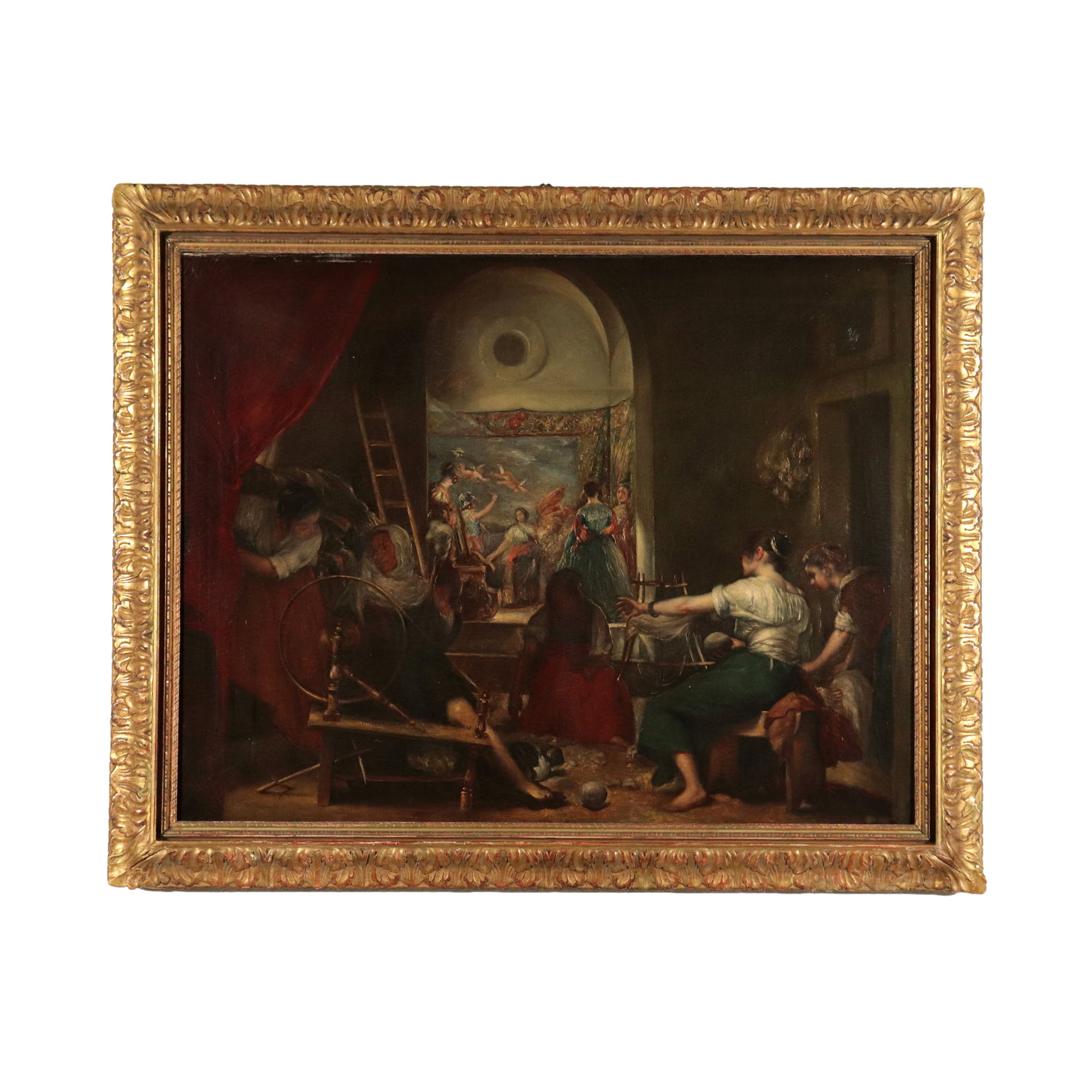 Olio su tela. Si tratta di una bella copia del celebre capolavoro di Diego Velazquez, realizzato nel 1657 circa e conservato al Museo del Prado. Fino alla metà del XX secolo il dipinto era intitolato "La fabbrica di arazzi di Santa Isabella in Madrid": solo nel 1948, infatti, gli studi dello storico e critico d'arte Diego Angulo Íñiguez permisero di ravvisare una relazione tra il dipinto e l'antico mito greco di Aracne. Nella scena, in primo piano alcune filatrici lavorano in una stanza disadorna e mal illuminata da una luce soffusa e riflessa dall'ambiente retrostante. Cinque sono le donne: a sinistra, in penombra, la più anziana che aziona la ruota della spoliatrice; di fronte a lei, sulla destra, in piena luce, una giovane ragazza che raccoglie il filo nell'aspa; esse sarebbero le raffigurazioni di Atena, ancora celata sotto false sembianze, e l'umana Aracne, durante la loro gara. Le altre tre donne fanno semplicemente da contorno, quella centrale è solo una sagoma statica. In secondo piano, centrale e illuminata da un potente fascio di luce che emerge da sinistra, nonchè ravvivata dai colori accesi dell'arazzo e dalle vesti, la scena della rivelazione della dea alla donna. La copia qui proposta presenta al retro etichetta di inventario e di spedizioniere di Parigi. E' stata sottoposta a restauro per strappo della tela. L'opera è presentata in cornice dorata coeva.