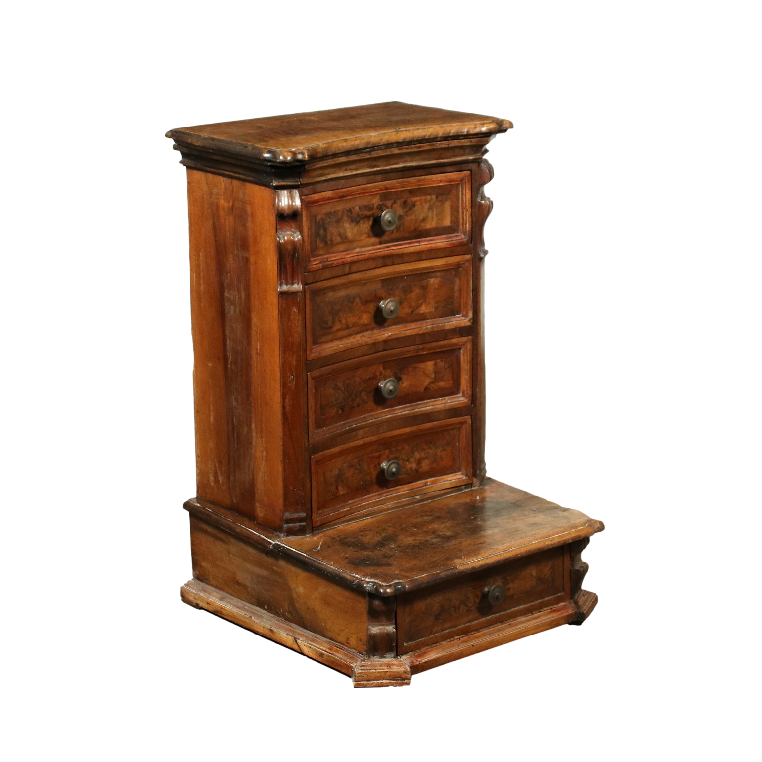 Inginocchiatoio barocco lombardo, sul fronte presenta quattro cassetti, i montanti presentano mensole sagomate poste nella parte superiore. In noce, la parte interna è stata ricostruita successivamente.