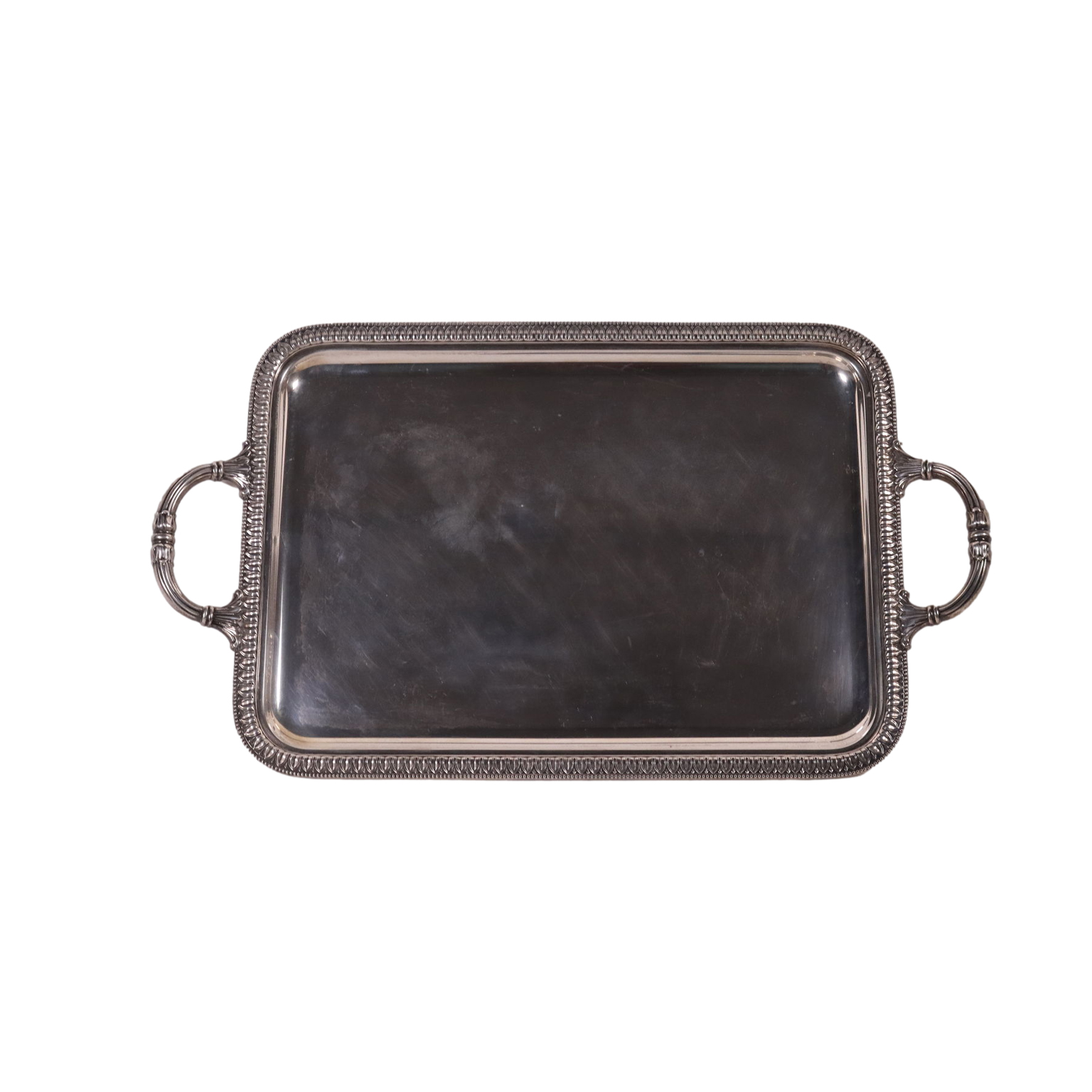 Vassoio in argento a forma rettangolare con decori sul bordo a motivi ripetuti. Marchio dell'argento e dell'argentiere incussi sul bordo. Gr. 1615.