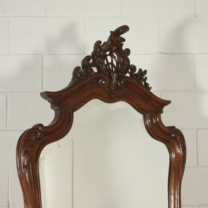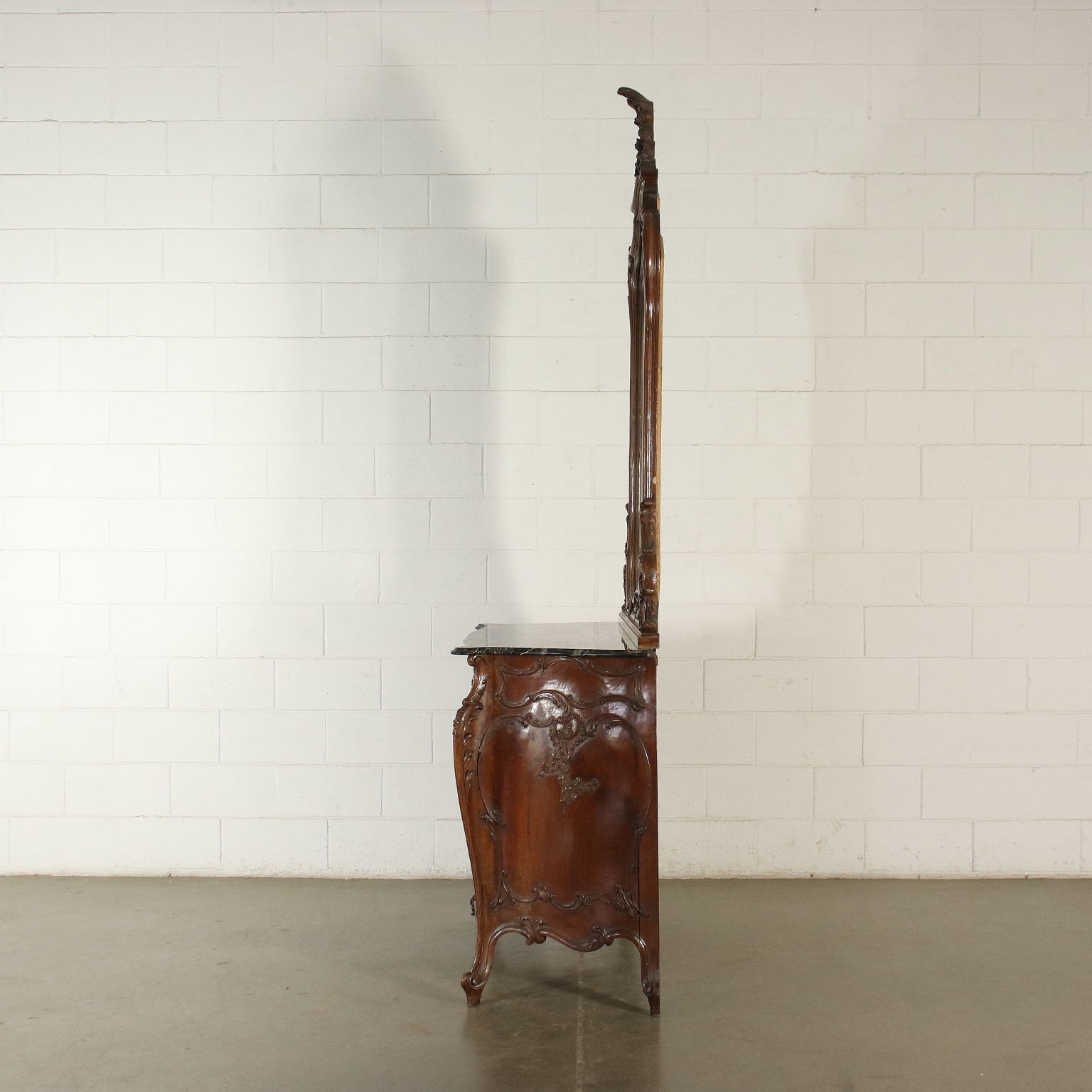 Comò con specchiera in stile barocchetto, mosso in tutte le sue parti e intagliato a motivi fitomorfi. Specchiera con vetro bisellato, piano in marmo Portoro, 4 cassetti di cui 1 di minori dimensioni nella fascia sottopiano e bocchette e maniglie in bronzo dorato. Realizzato in noce, interni in castagno. Rotture come da foto sul fronte di uno dei cassetti.