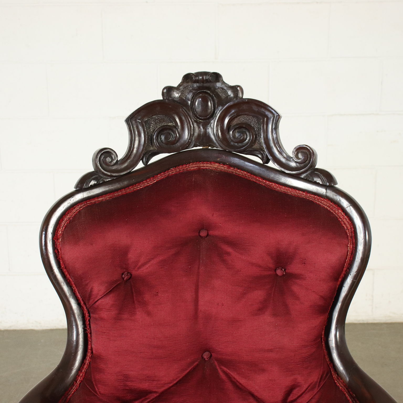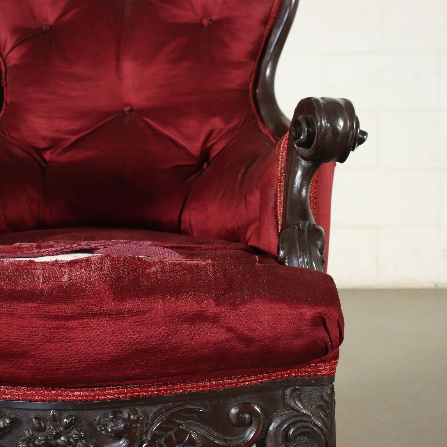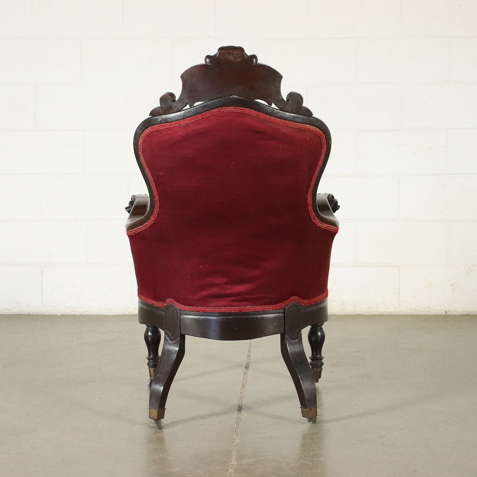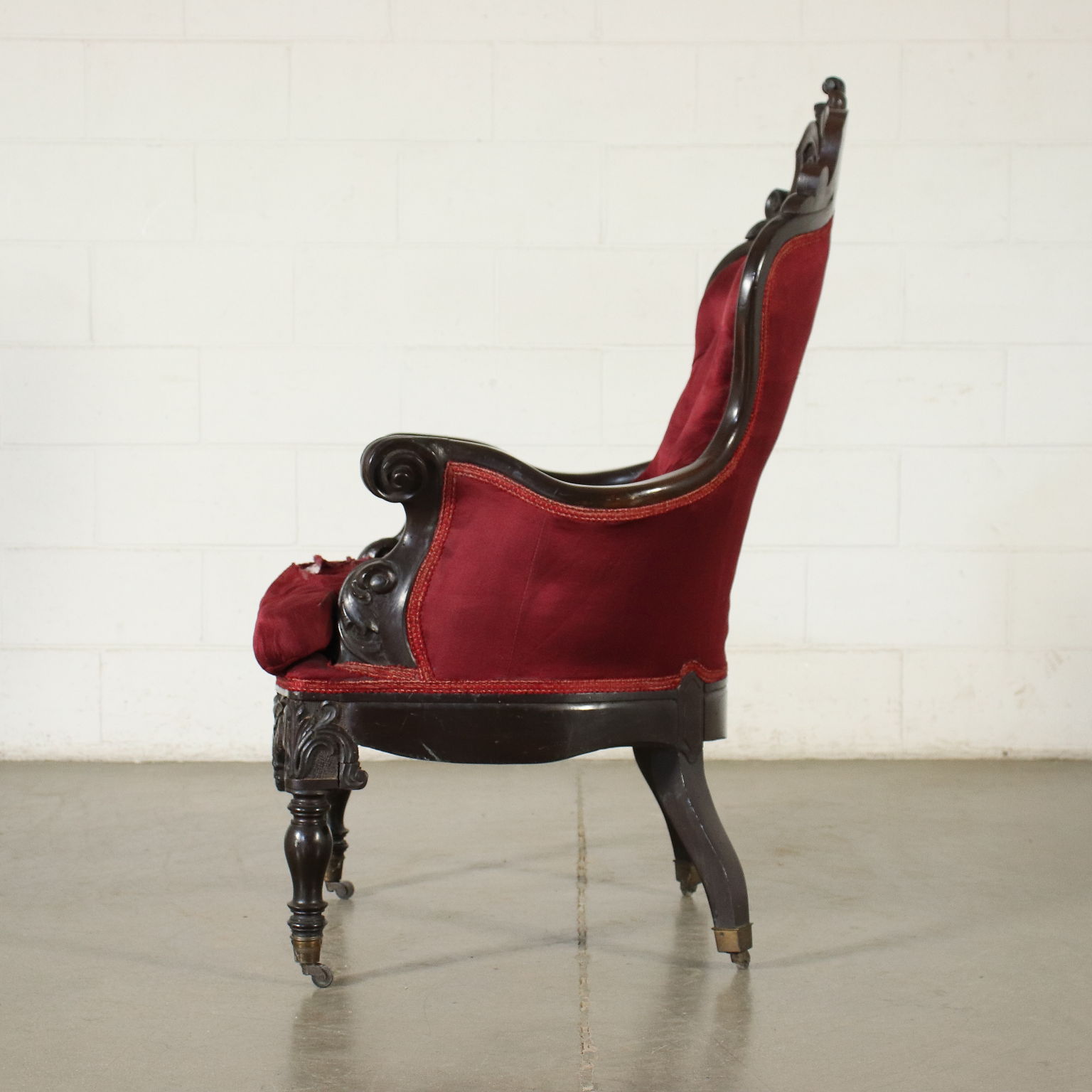 Poltrona Luigi Filippo in noce dotata di cimasa intagliata, braccioli intagliati a ricciolo, schienale imbottito a capitonné rivestito con stoffa bordeaux, seduta con cuscino amovibile celante commoda, grembiale intagliato e gambe anteriori tornite. Seta del cuscino amovibile lisa. Rotelline sui piedi.