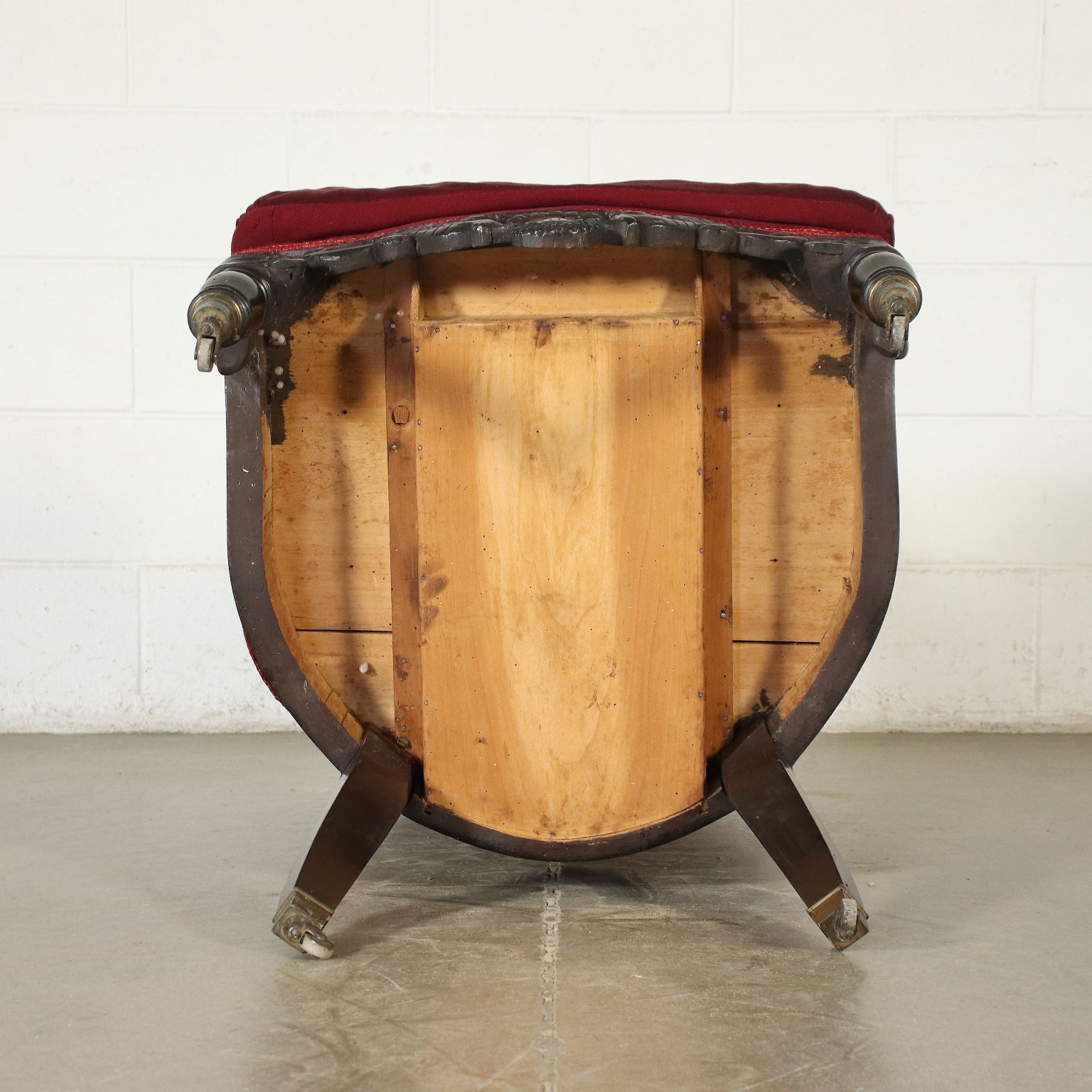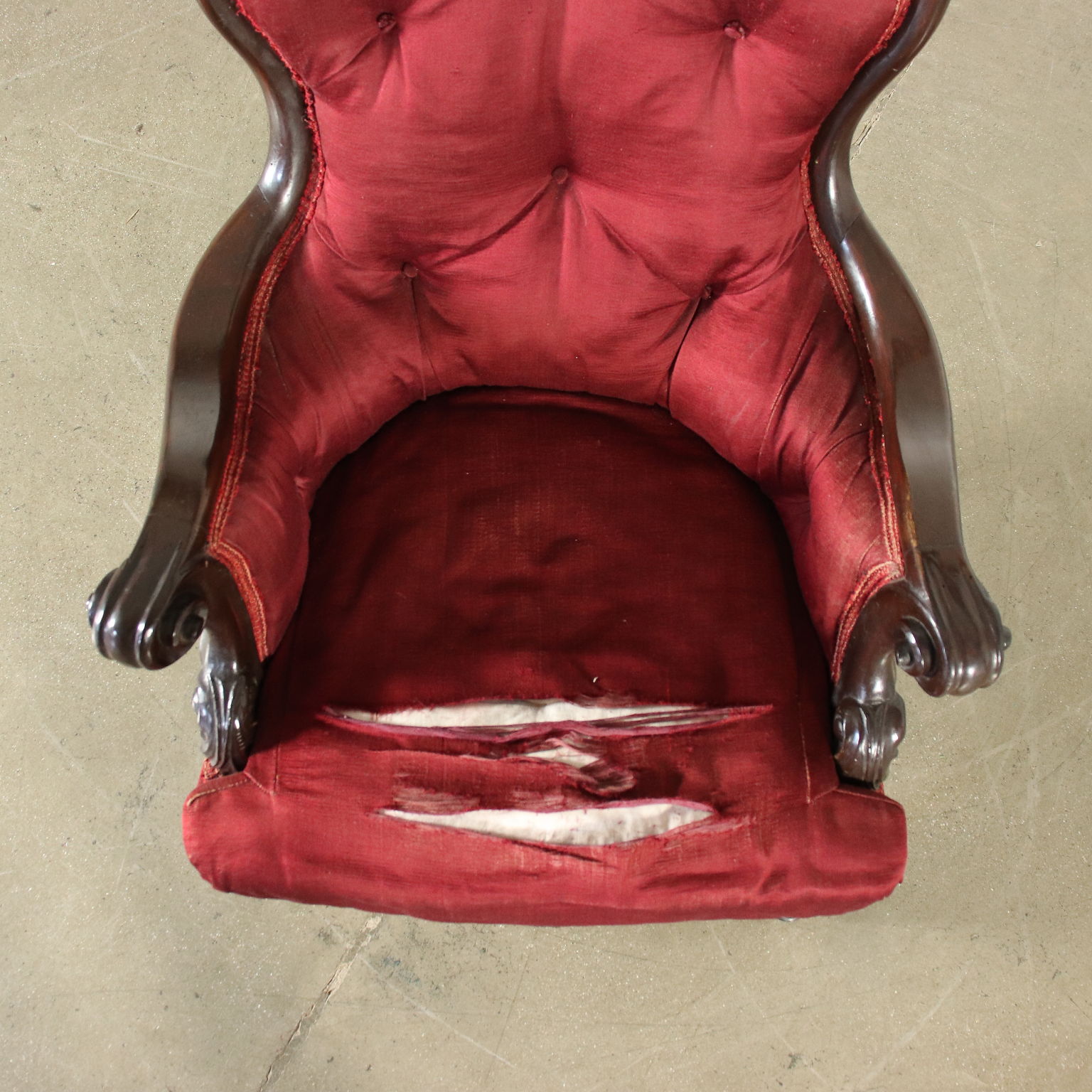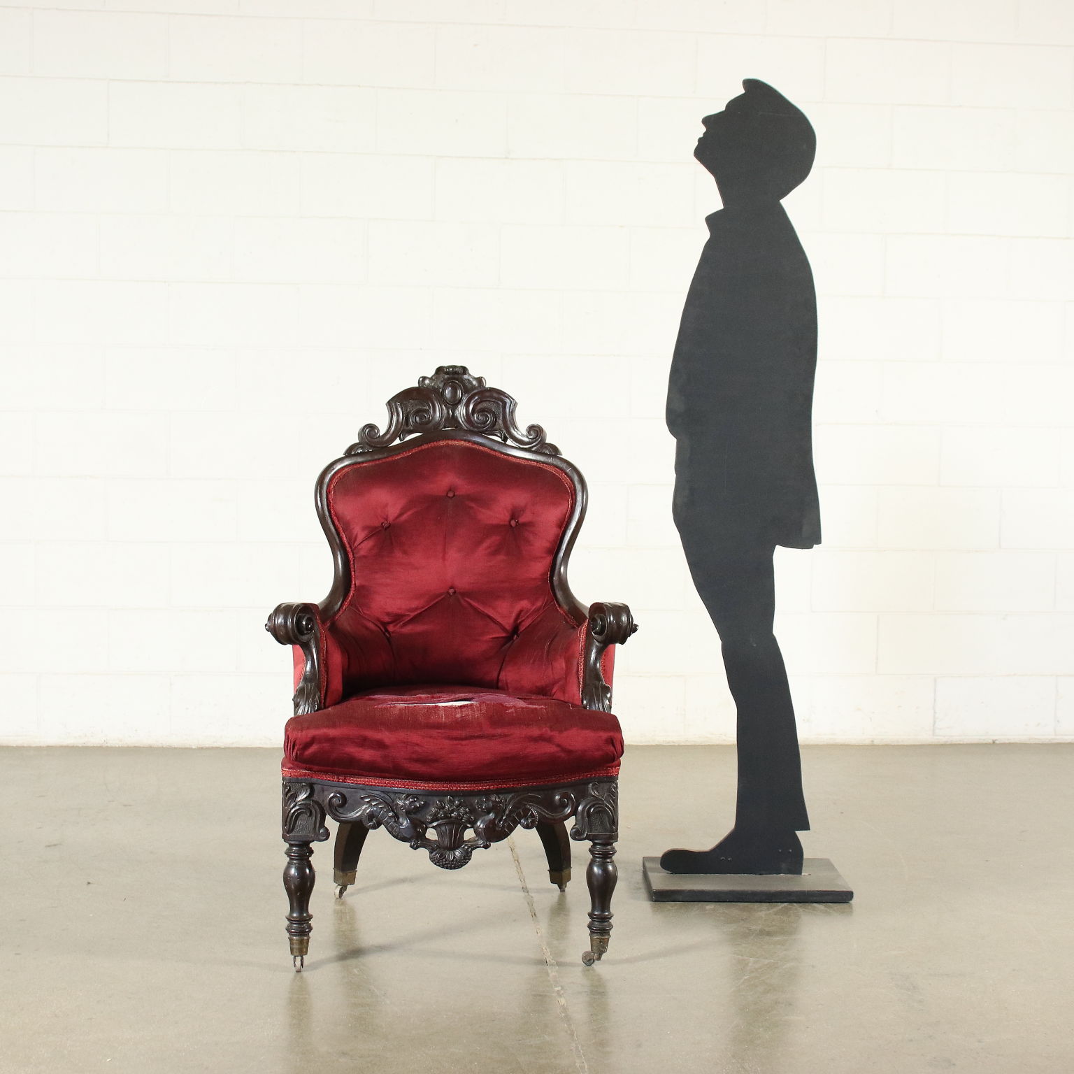 Poltrona Luigi Filippo in noce dotata di cimasa intagliata, braccioli intagliati a ricciolo, schienale imbottito a capitonné rivestito con stoffa bordeaux, seduta con cuscino amovibile celante commoda, grembiale intagliato e gambe anteriori tornite. Seta del cuscino amovibile lisa. Rotelline sui piedi.