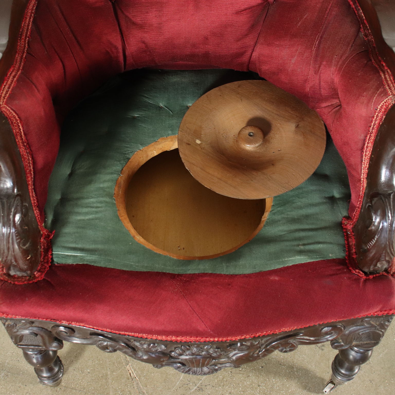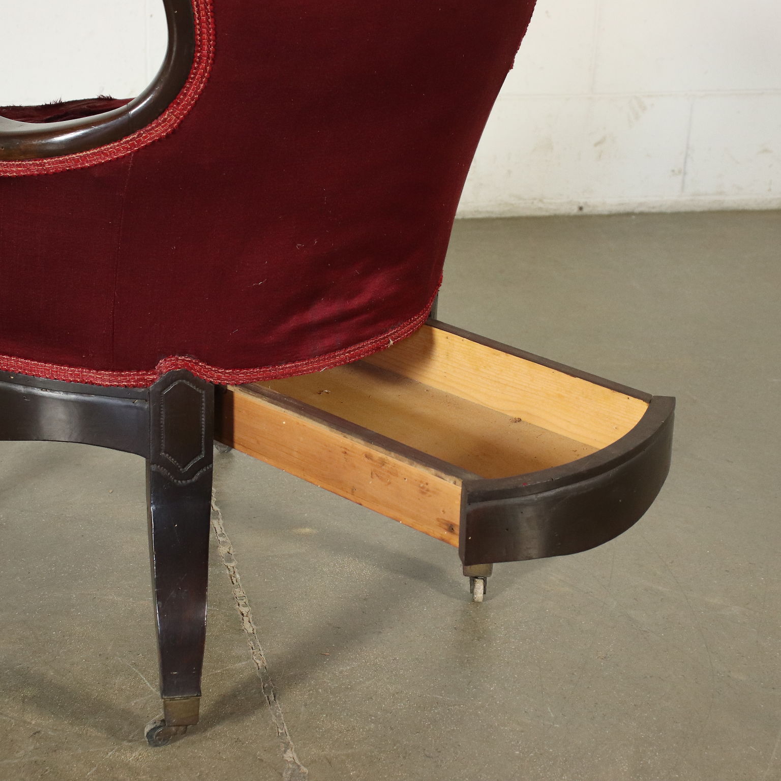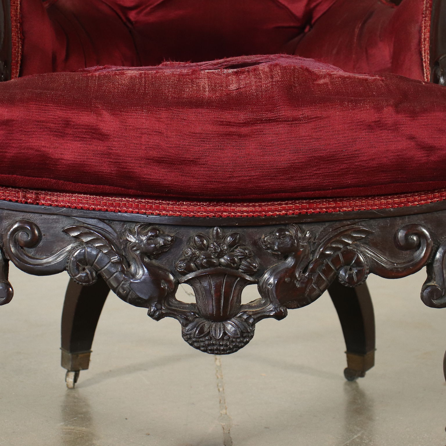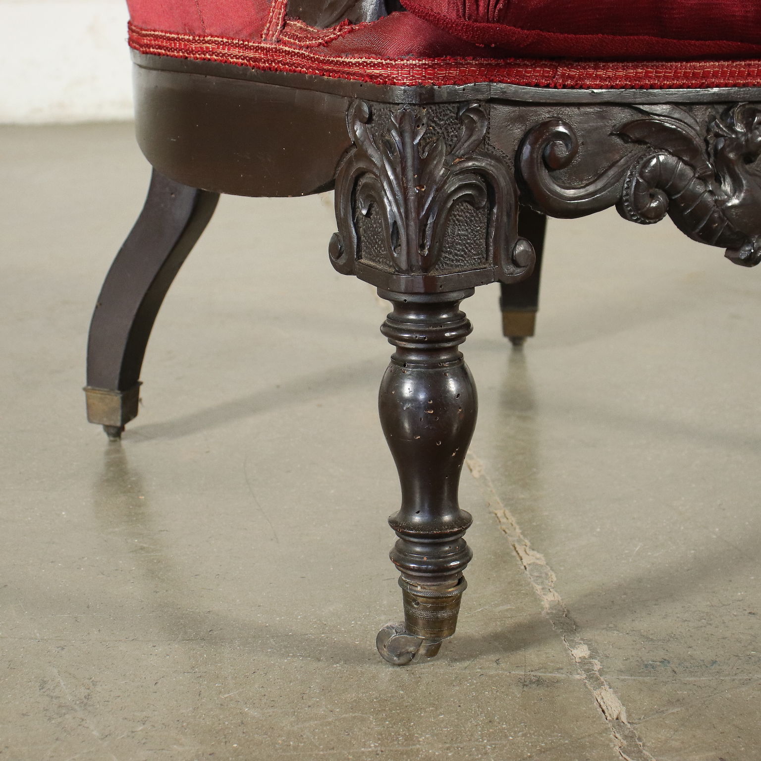 Poltrona Luigi Filippo in noce dotata di cimasa intagliata, braccioli intagliati a ricciolo, schienale imbottito a capitonné rivestito con stoffa bordeaux, seduta con cuscino amovibile celante commoda, grembiale intagliato e gambe anteriori tornite. Seta del cuscino amovibile lisa. Rotelline sui piedi.