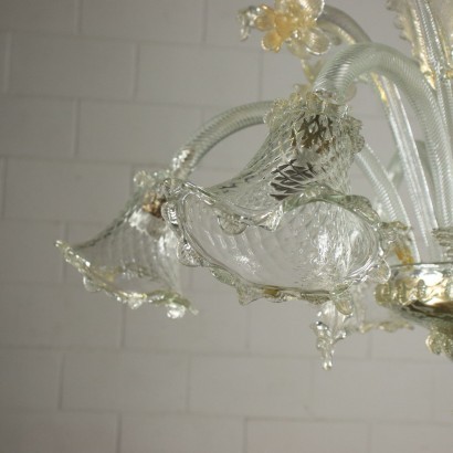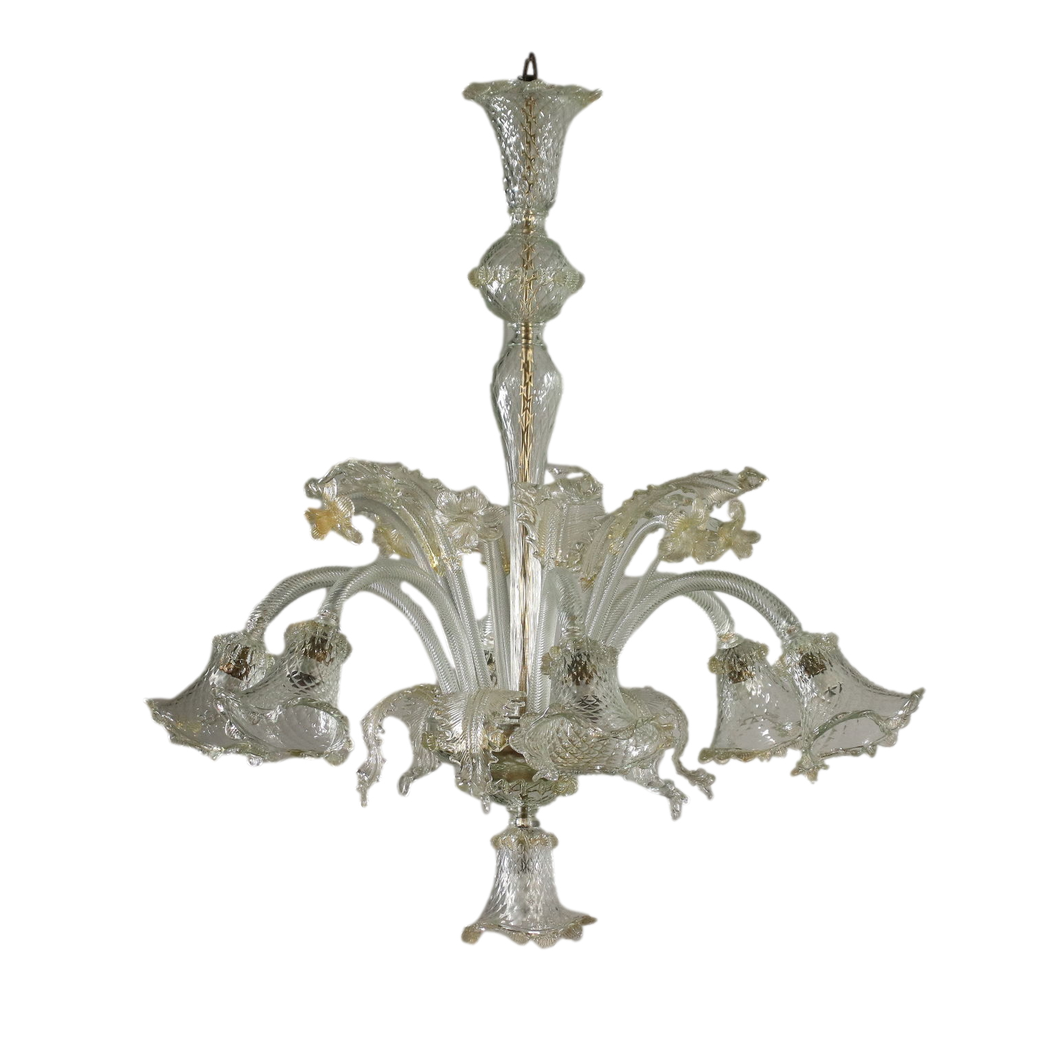 Lampadario Murano a sei luci, in vetro soffiato con inserti dorati.