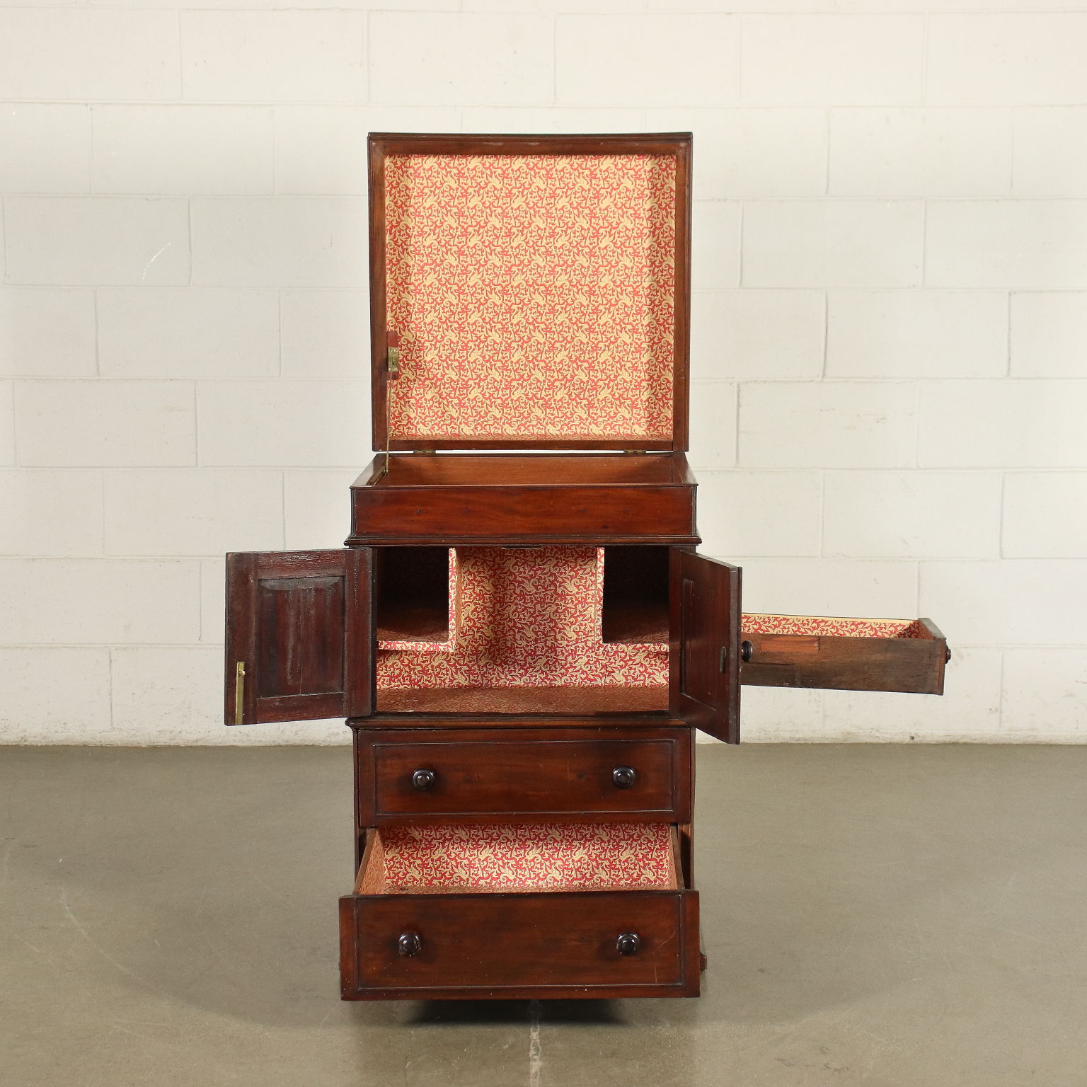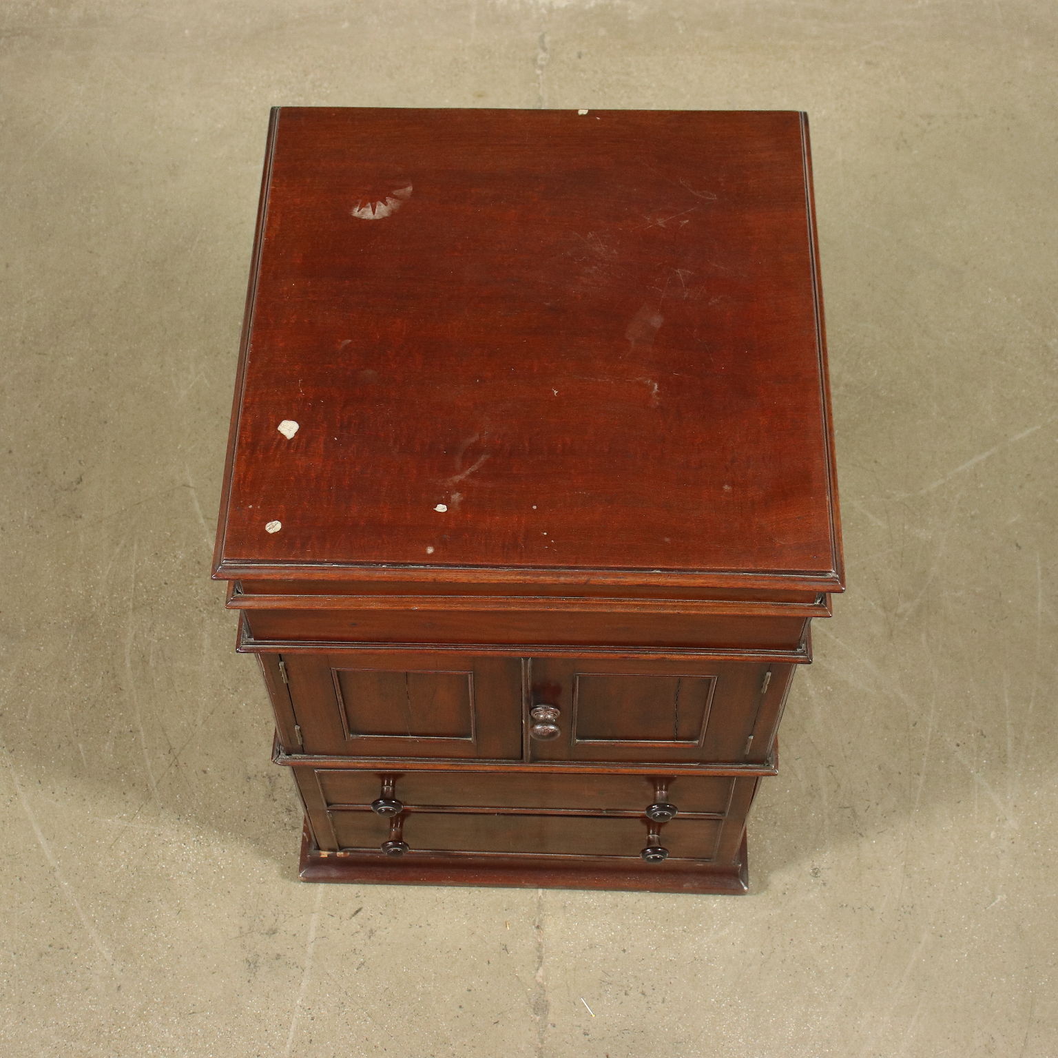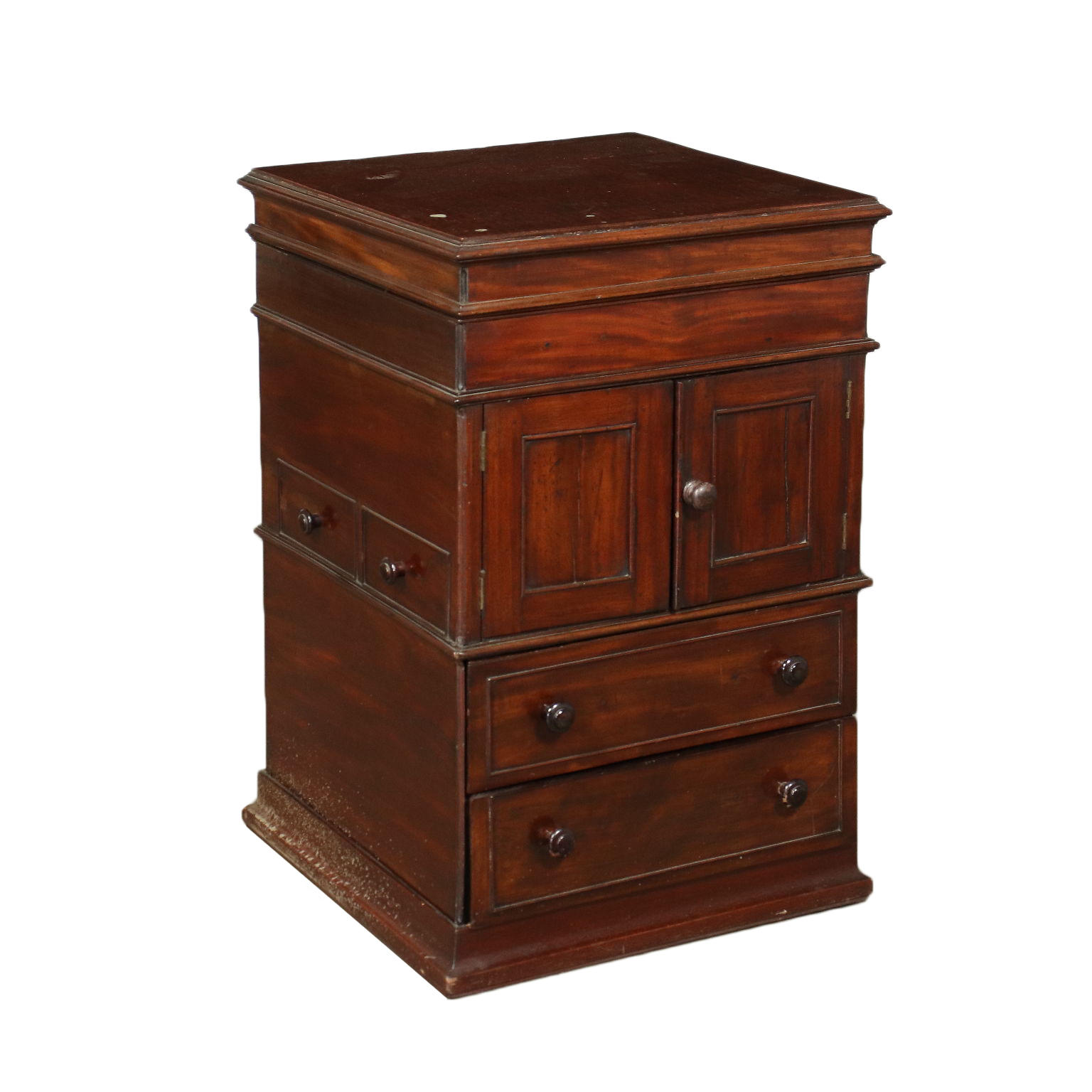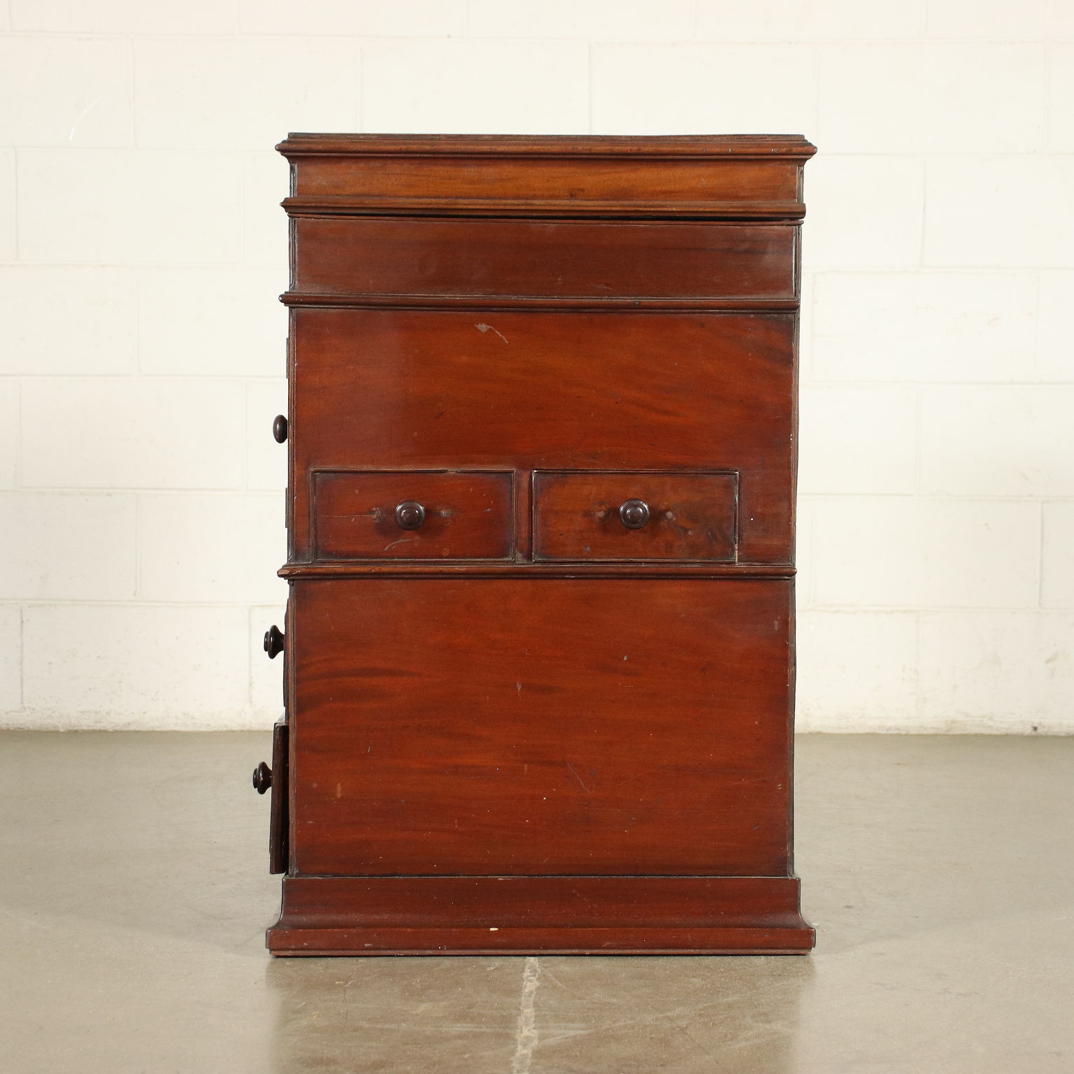 Mobile portabottiglie inglese di epoca vittoriana, con piano apribile e vano portabottiglie, 2 ante sul fronte per vasche rinfrescatoio, coppia di cassetti sia sul fronte che su uno dei due lati, pomoli in mogano e ruote. Realizzato in mogano con interni in quercia e decorato con cornici perimetrali. Sostituzioni e restauri vari.