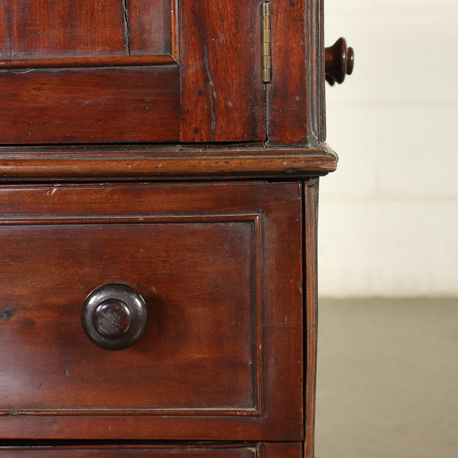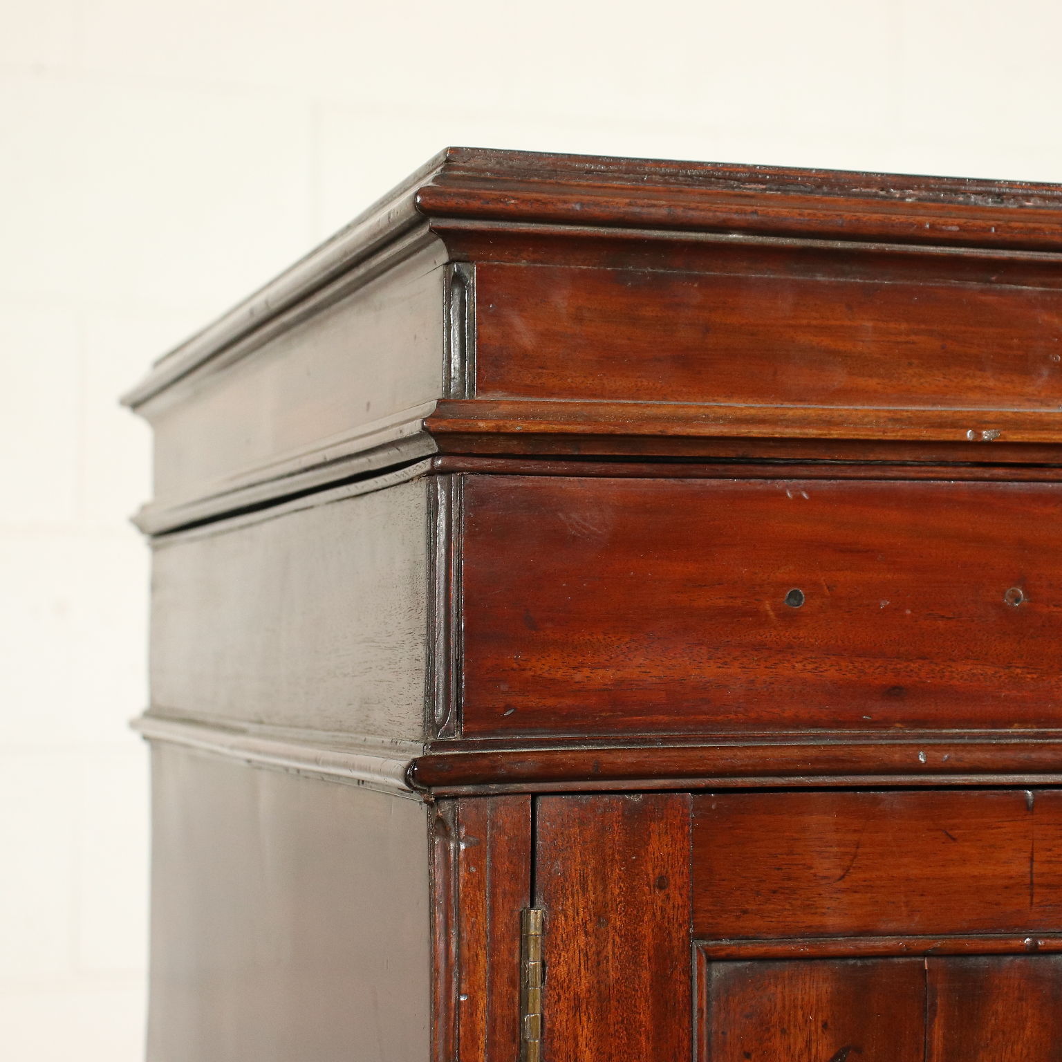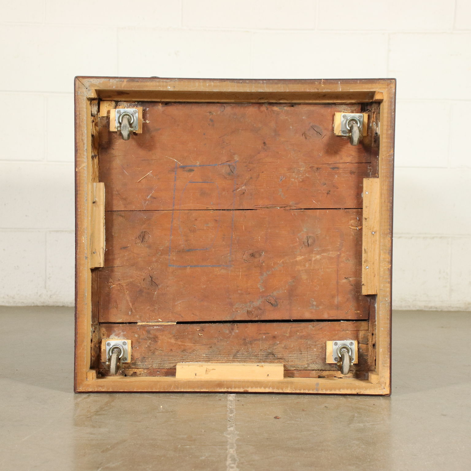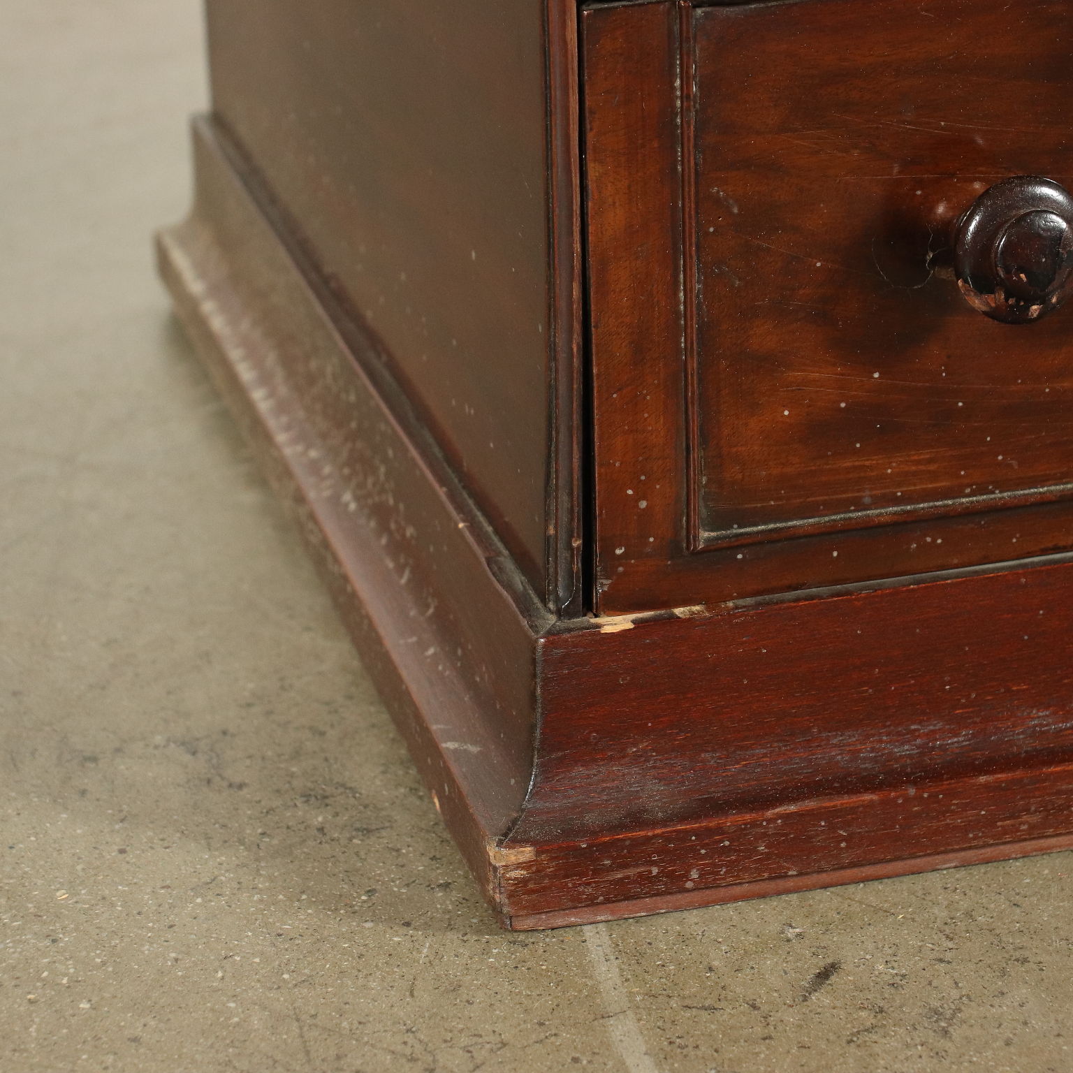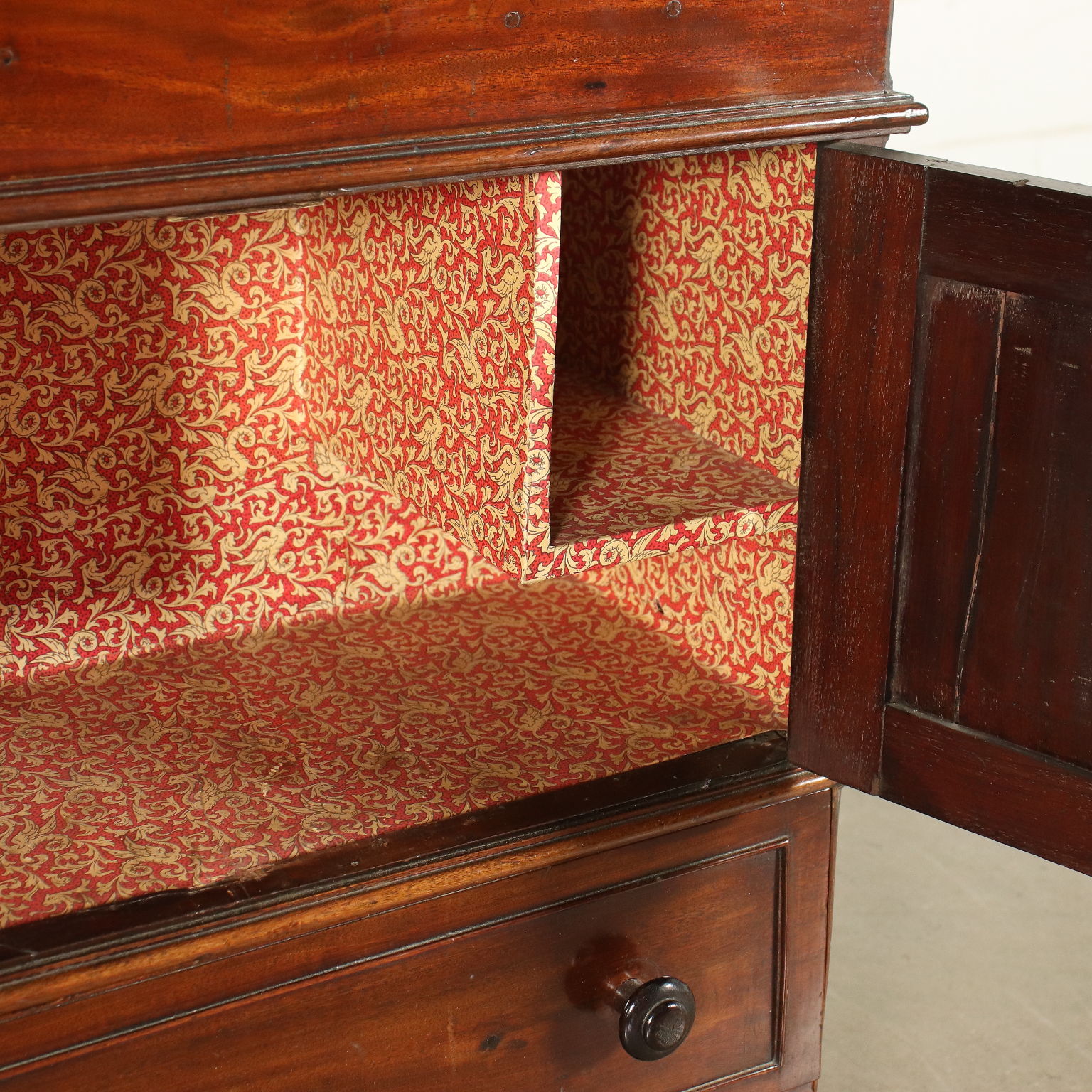 Mobile portabottiglie inglese di epoca vittoriana, con piano apribile e vano portabottiglie, 2 ante sul fronte per vasche rinfrescatoio, coppia di cassetti sia sul fronte che su uno dei due lati, pomoli in mogano e ruote. Realizzato in mogano con interni in quercia e decorato con cornici perimetrali. Sostituzioni e restauri vari.