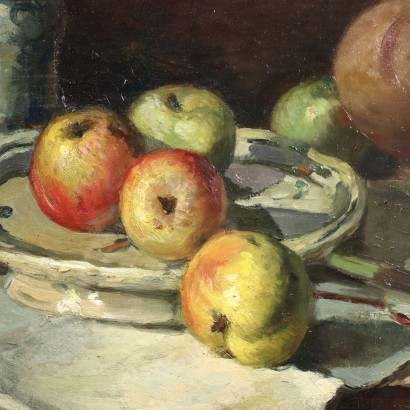 Olio su compensato Firmato e datato in alto a destra. La composizione presenta diverse mele sul tavolo sparse insieme ad altri elementi: il piatto, la brocca e il bicchiere, il calice, alcuni vasetti. L'artista toscano Luigi Bini fu pittore, ceramista e scultore, che non si sentiva legato alle tecniche tradizionali ma amava sperimentarne di nuove. Le sue opere pittoriche, tra le quali prevalgono i ritratti e gli studi di figura, furono realizzate prevalentemente a pastello e a tempera per conseguire vivaci e morbidi passaggi cromatici mediante ampi tocchi di pennello. L'opera è presentata in cornice coeva.