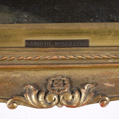 Olio su tela. Firmato in basso a destra "Morbelli". La scena è ambientata in un interno povero: in piedi girata di tre quarti, una donna, in piedi e inquadrata nel vano buio della porta retrostante, si accosta ad un tavolino su cui si trovano tre diversi fiaschi; la luce entra da una finestra che si intravvede sul lato sinistro, sotto la quale si trova una cassa portalegna. Peculiare è il gioco delle linee dei mobili e dei vani della stanza che convergono dai due lati e dall'alto verso la figura centrale, stante, buia ma ben definita nei contorni non tanto da linee, quanto dai giochi di luci e ombre. Il dipinto, di ottima mano, richiama l'opera pittorica di Angelo Morbelli (1853 -1919), uno dei grandi artisti del divisionismo, che si dedicò alla rappresentazione di figure e scene di matrice contadina e popolare, sulla scia della letteratura verista. L'opera presentata è di ottima mano, ma a nostro avviso non è sostenibile la attribuzione ad Angelo Morbelli, quanto piuttosto ad autore lombardo anonimo a lui ispirato, e si ritiene che la conformità allo stile e ai soggetti del Morbelli probabilmente abbiano indotto ad aggiungere la sua firma, per richiamarne la paternità almeno di ispirazione. L'opera è presentata in cornice in stile.