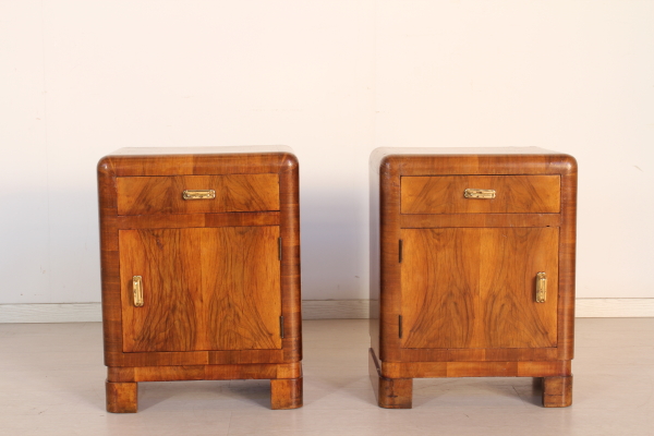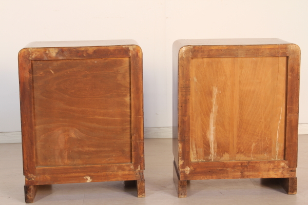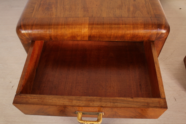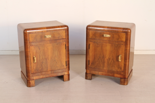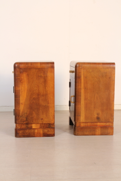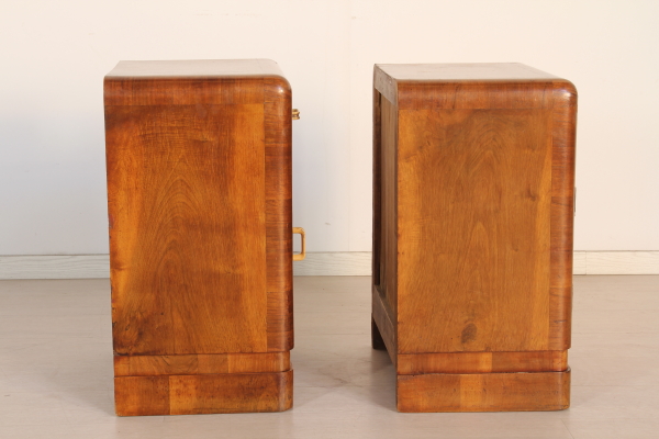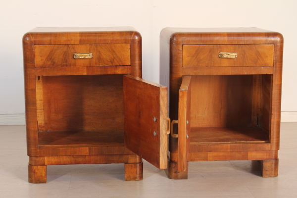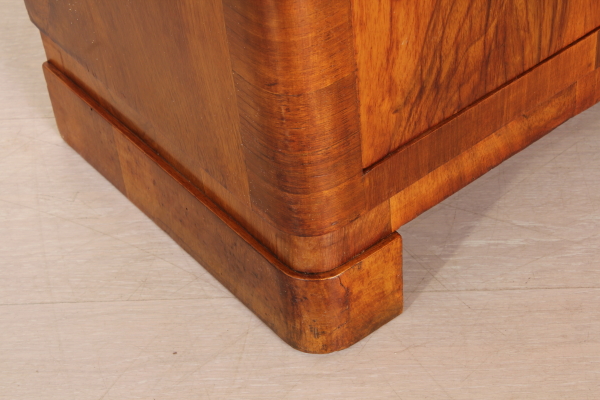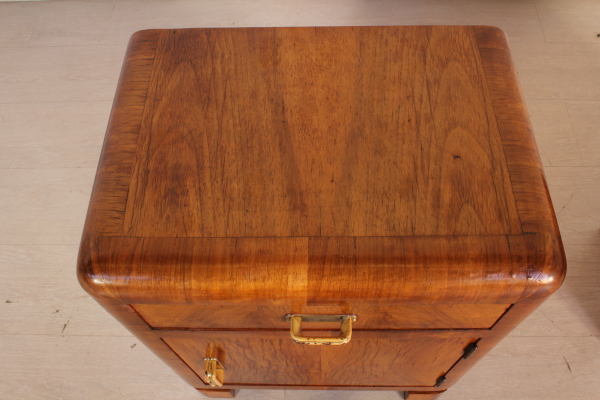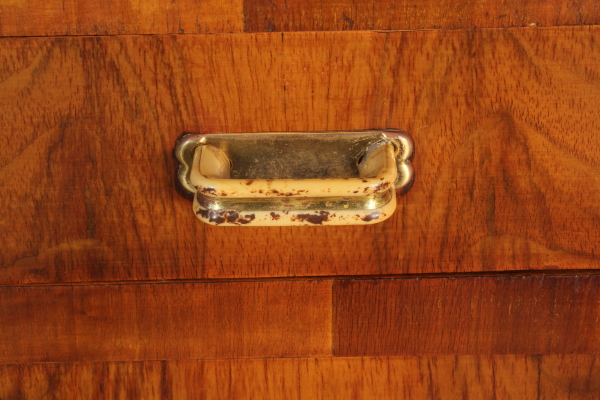 Sul fronte anta e cassetto, mobili presentano gli spigoli bombati, piedi a mensola. Maniglie in lamiera ottonata e bachelite.