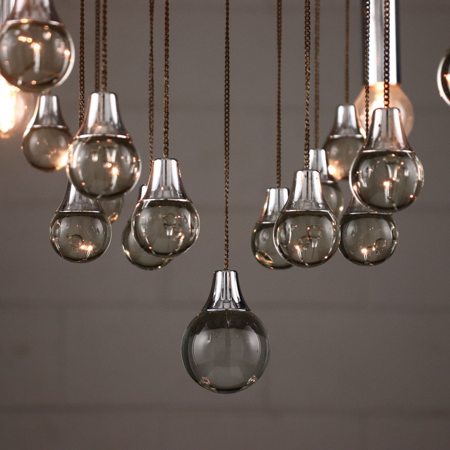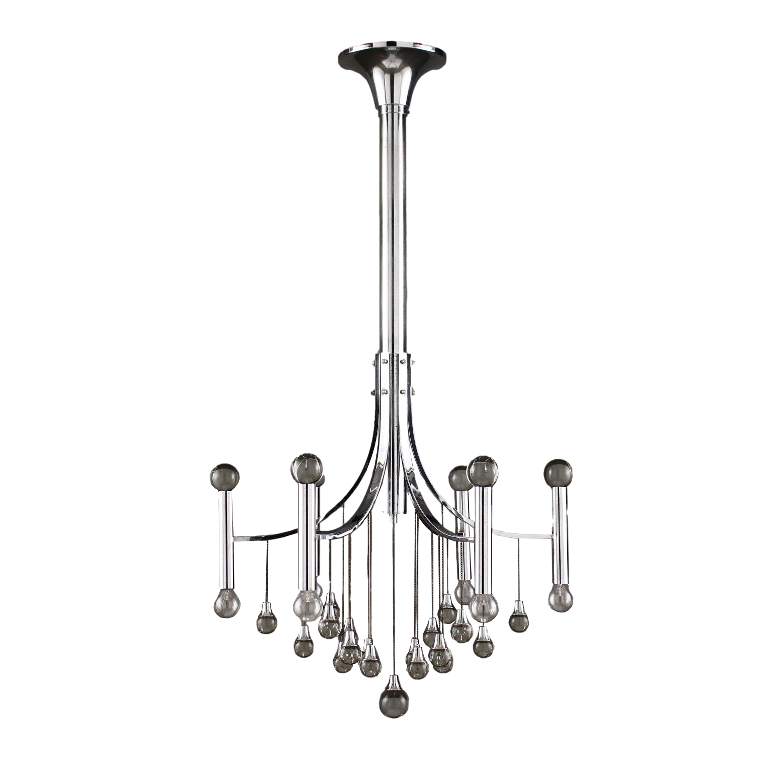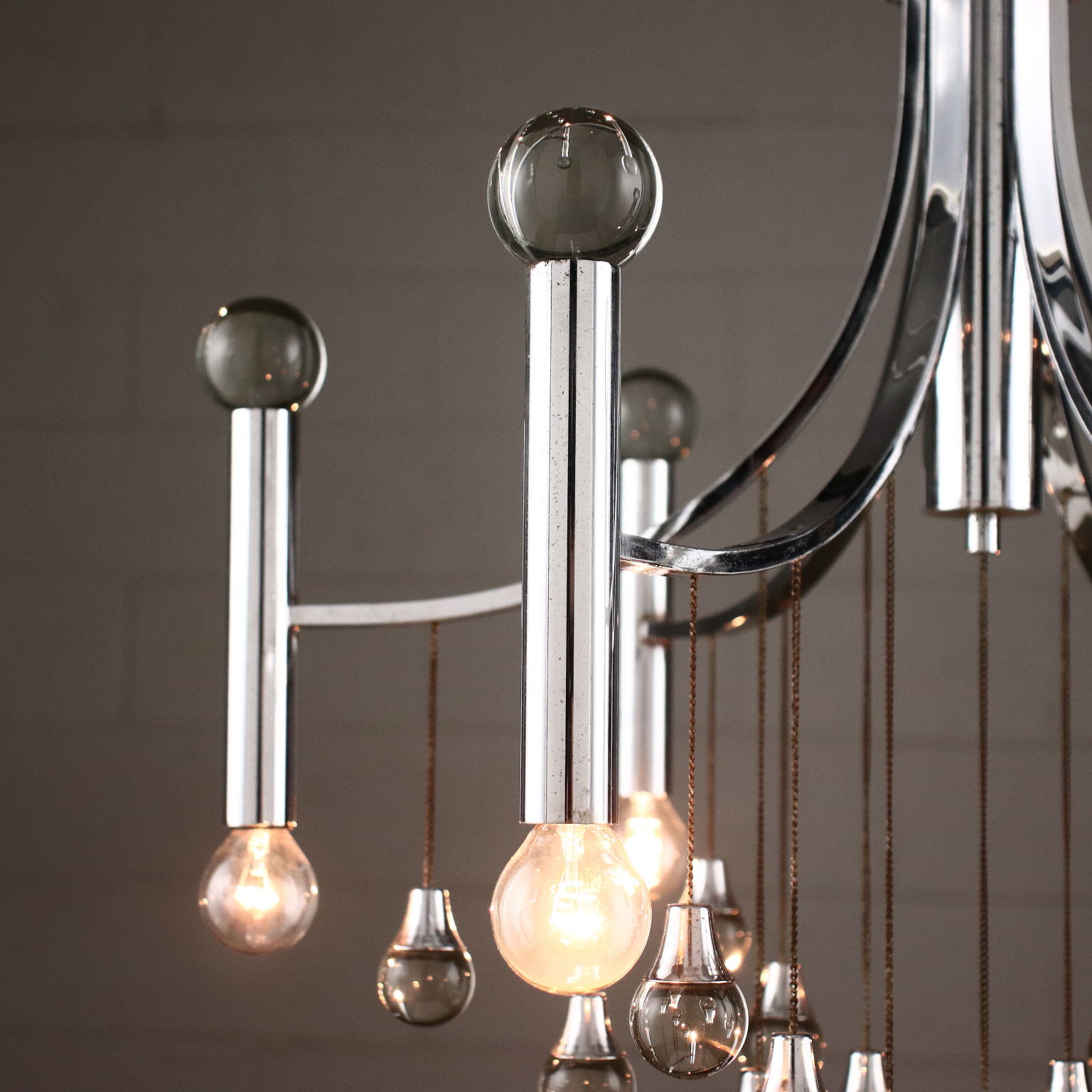 Lampada a soffitto, metallo e alluminio cromato, pendenti in vetro.