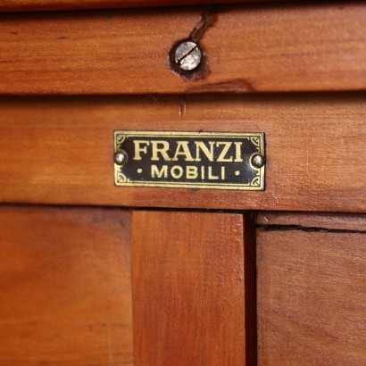 Scrivania Liberty, presenta due file di cassetti ai lati del vano per le gambe e un cassetto posto nella fascia sottopiano. Anta a coulisse cela piano scrittoio estraibile e scarabattolo con vani porta documenti e cassetti. In ciliegio.