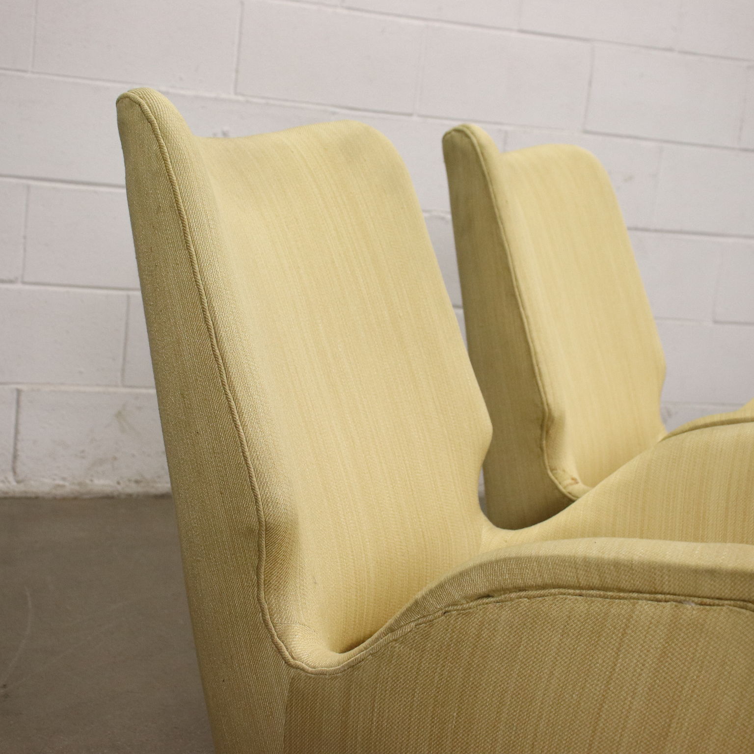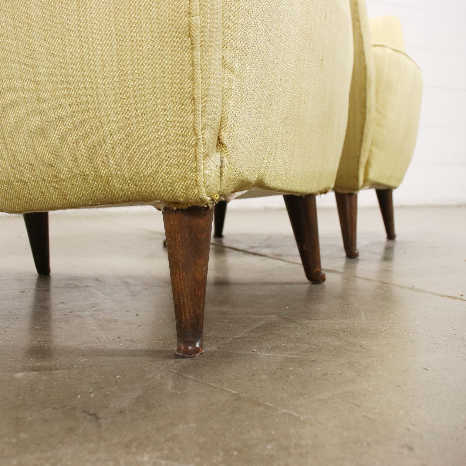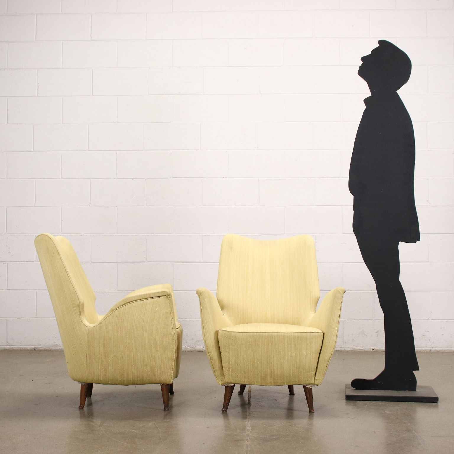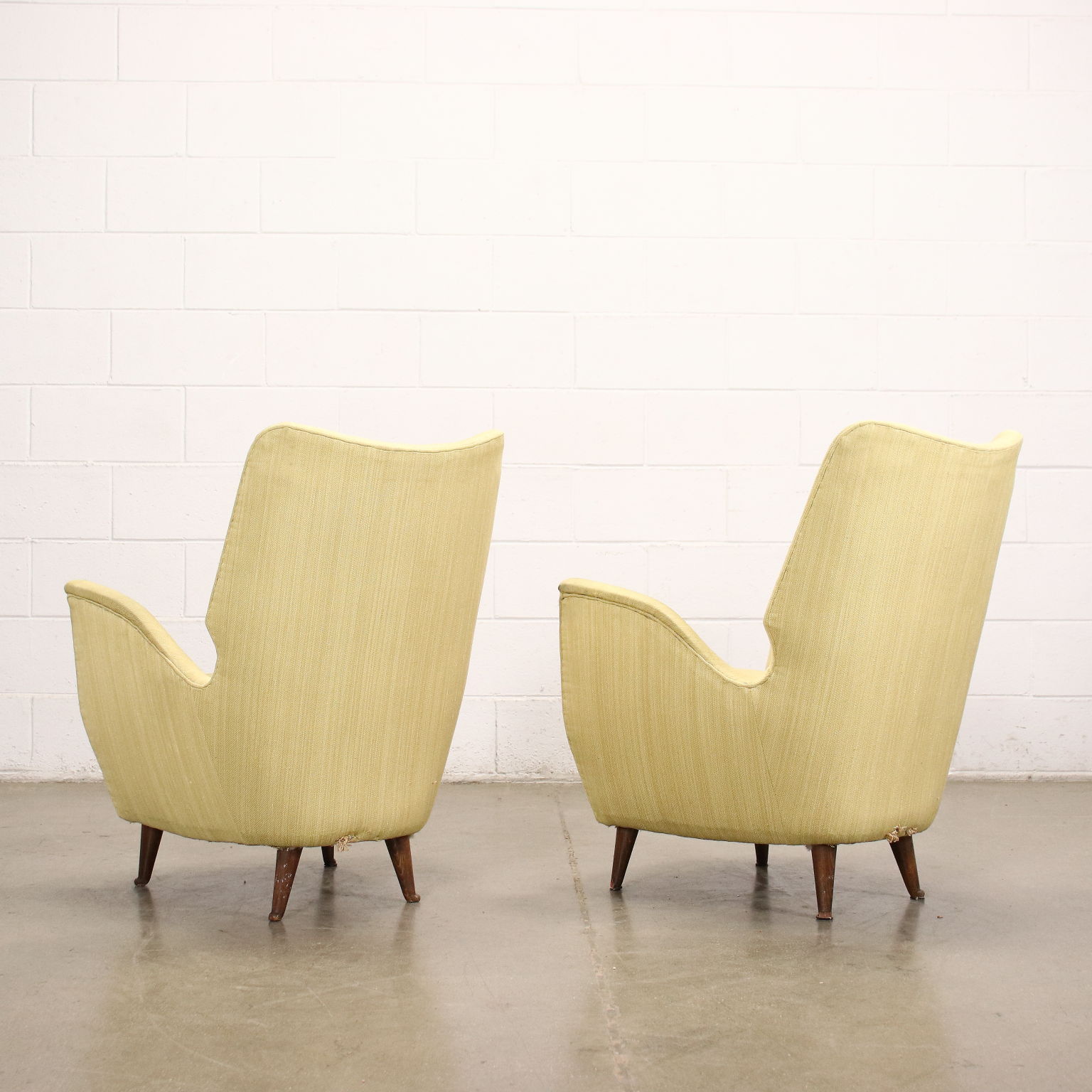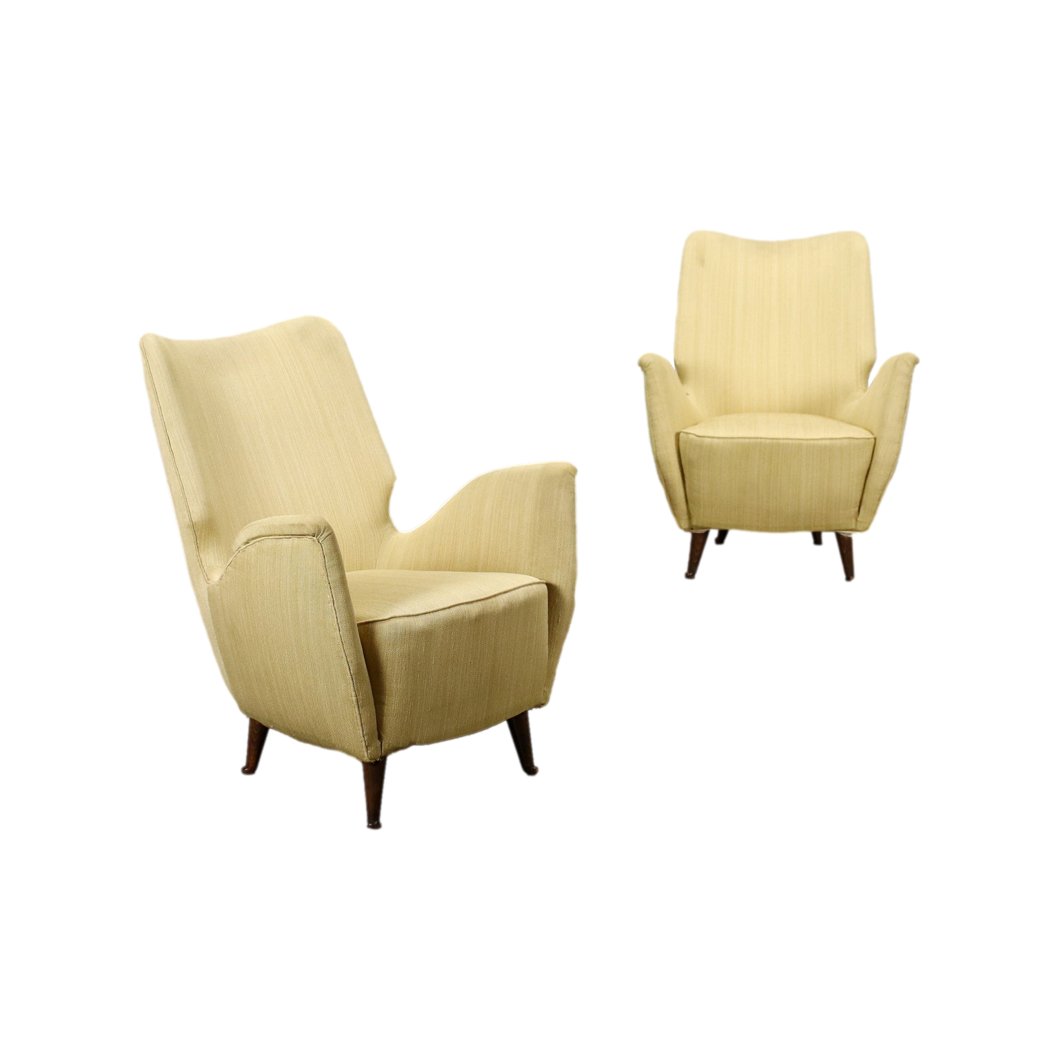 Coppia di poltrone anni 50 con imbottitura a molle, rivestimento in tessuto originale macchiato, piedini in legno.