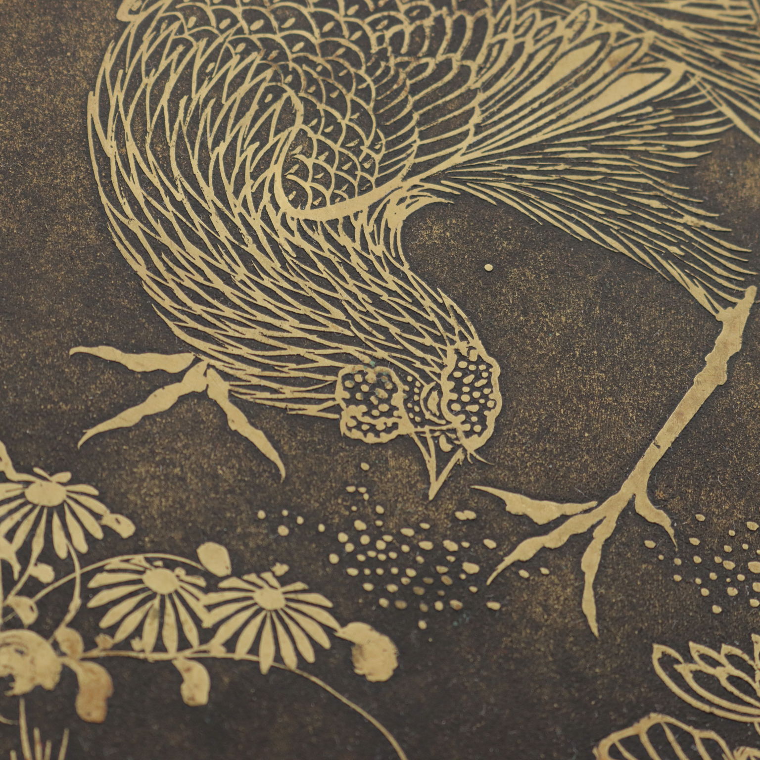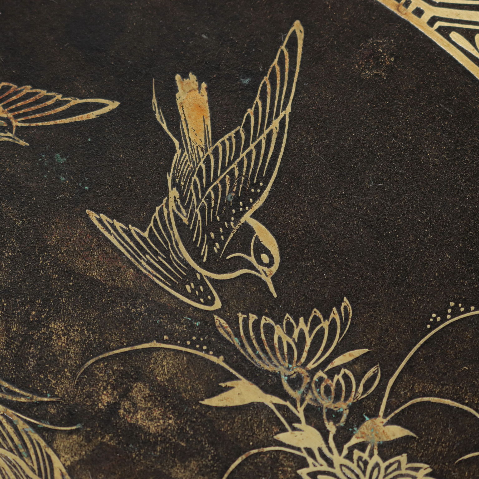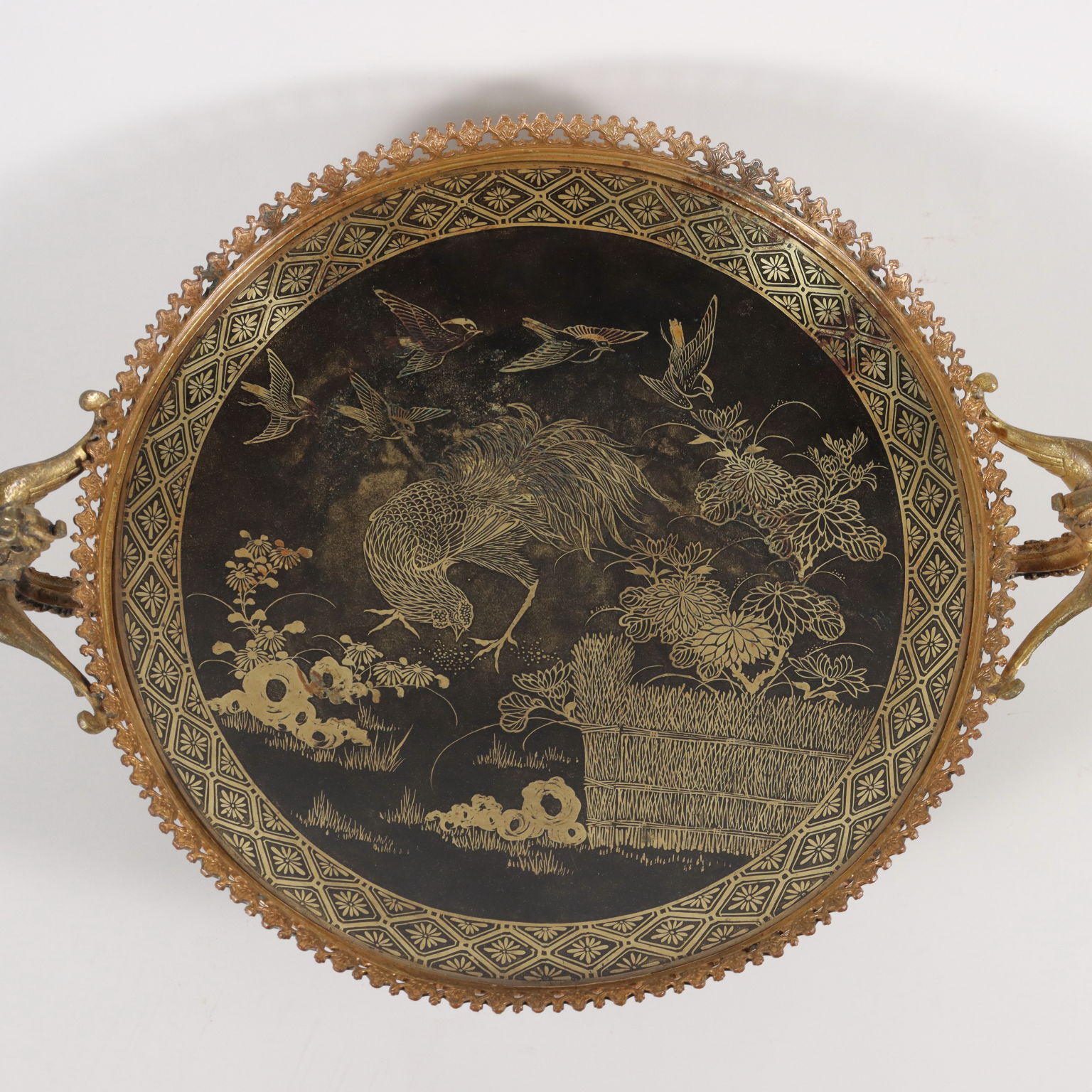 Piatto in bronzo finemente inciso e dorato a rilievo a motivi vegetali e animali. Il piatto è trattenuto da un'alzatina in bronzo dorato, traforato e cesellato. I quattro piedi sono a foggia ferina con volute fogliacee e le due anse sono a forma di draghi alati.