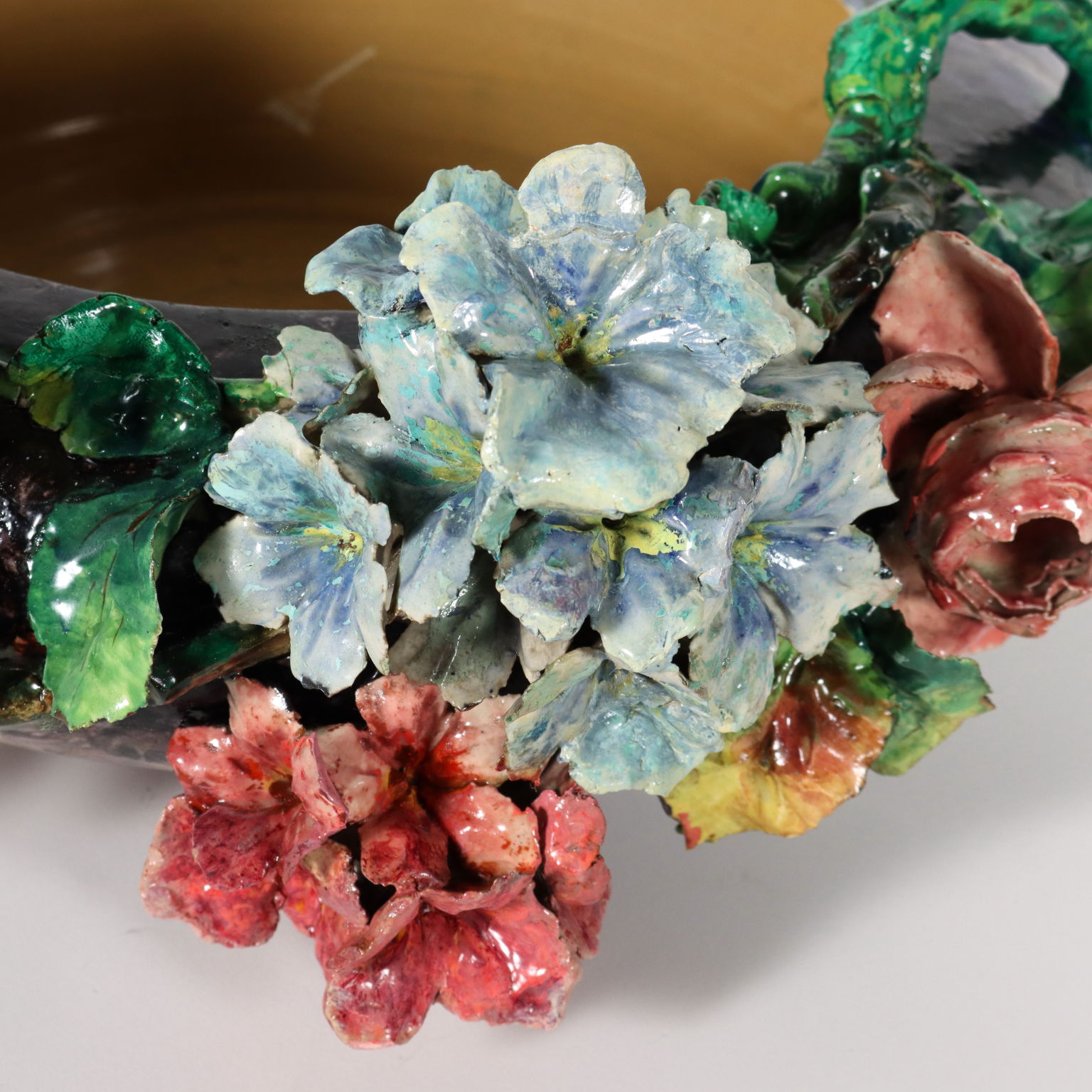 Centrotavola in terracotta policroma a forma circolare con rametti di fiori a rilievo. Manifattura italiana.