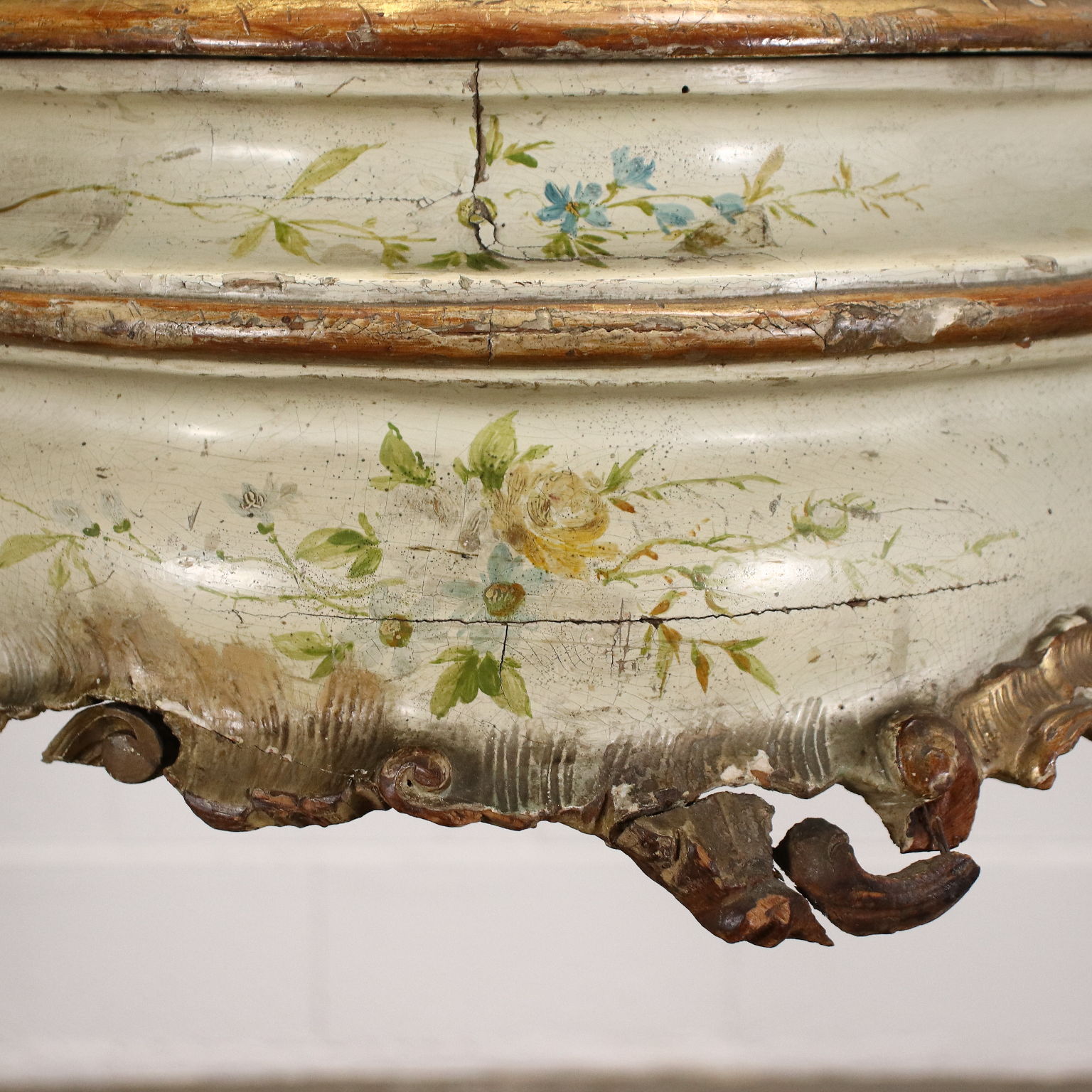 Consolle in stile barocchetto veneziano sorretta da gambe mosse terminanti con piedi a ricciolo e intagliate con motivi fitomorfi e a rocaille, riproposti anche nel grembiale. Interamente laccata, è dipinta con caratteristici motivi floreali e particolari dorati; in legno di cirmolo.