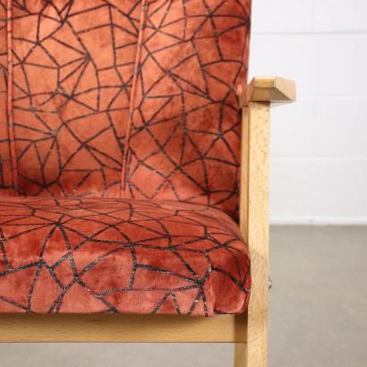 Coppia di poltroncine con imbottitura in espanso, rivestimento in velluto, struttura in legno di faggio.