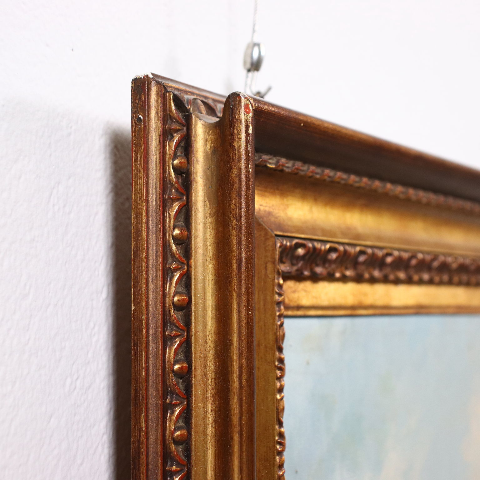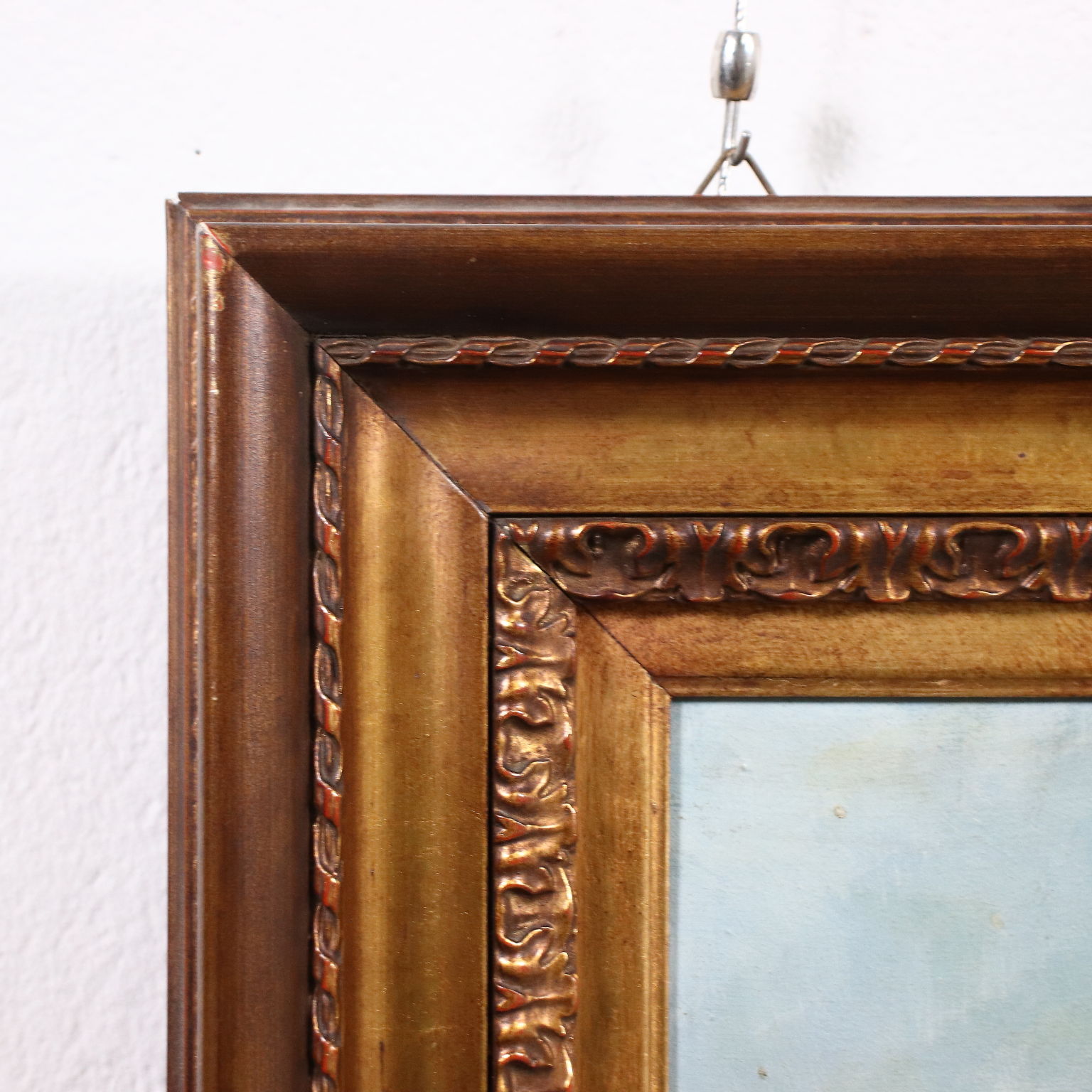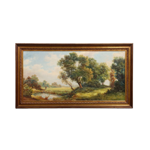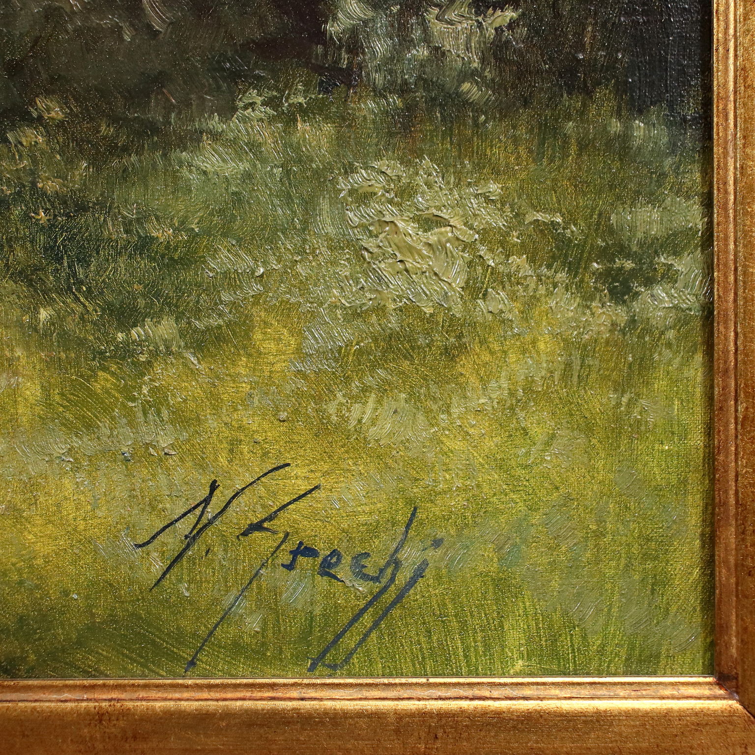 Olio su tela. Firmato in basso a destra. Omobono Grechi, detto Nino, pittore fiorentino, realizzò prevalentemente paesaggi luminosi e sereni di campagna verdeggiante, con piccoli specchi d'acqua e figurine pastorali. L'opera è presentata in cornice in stile.