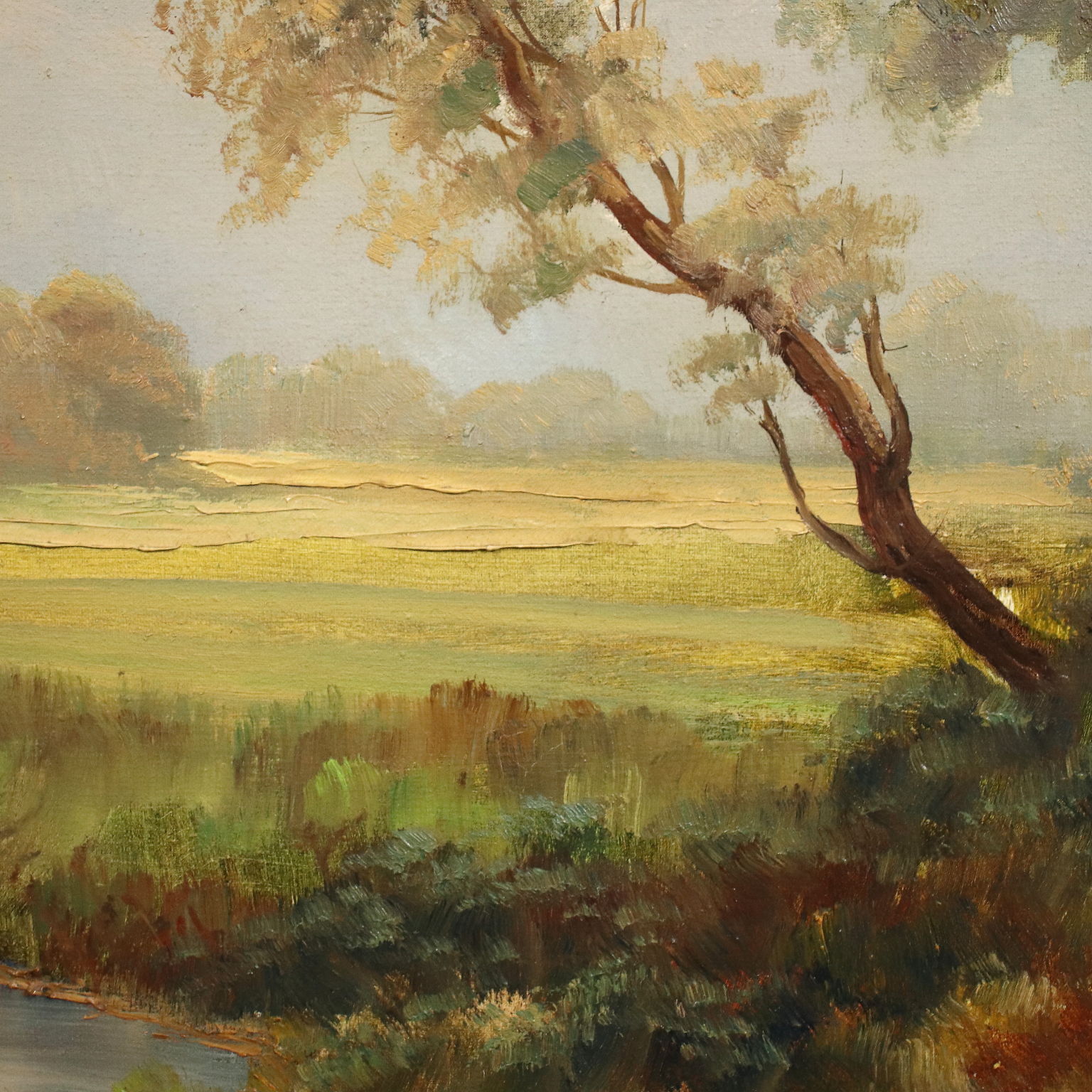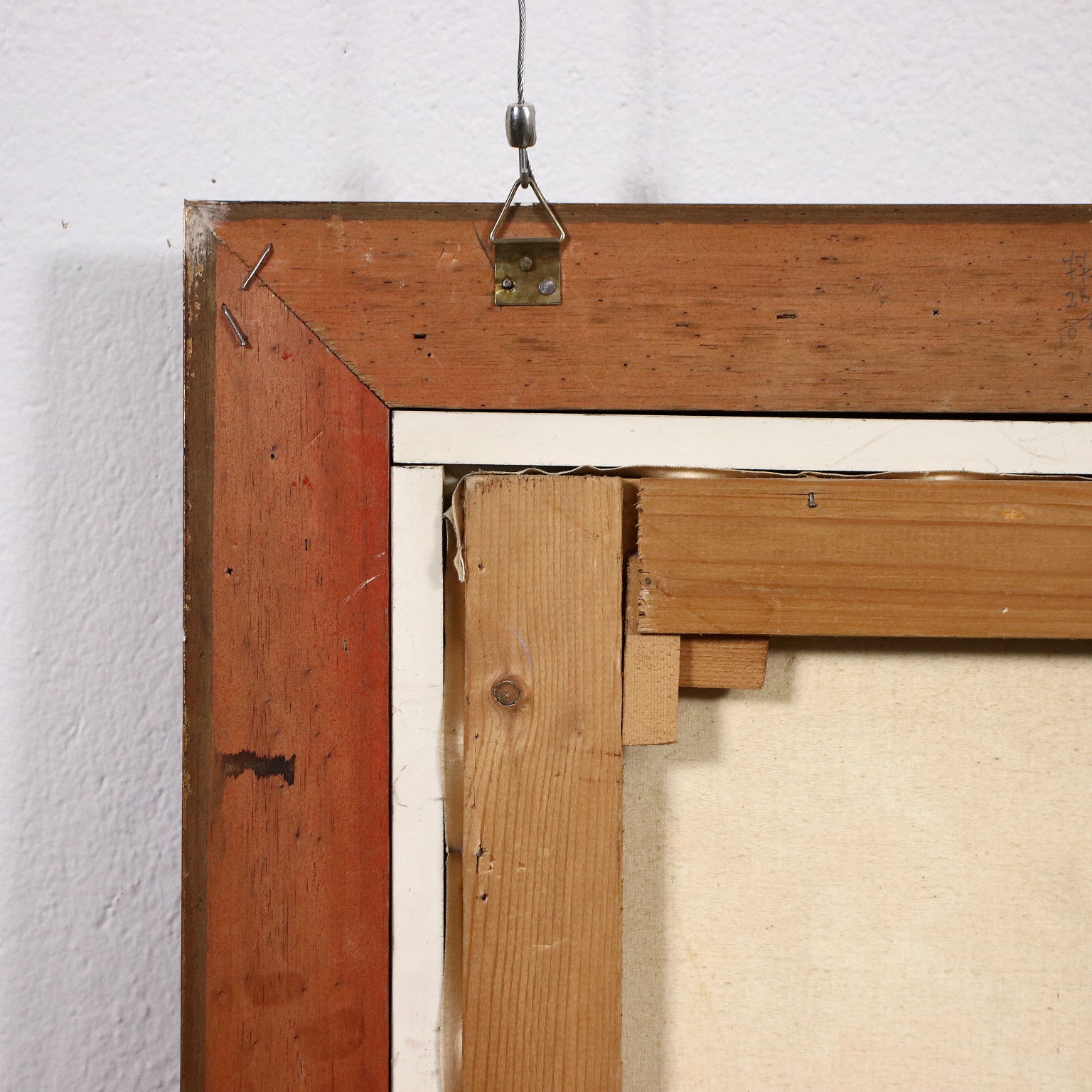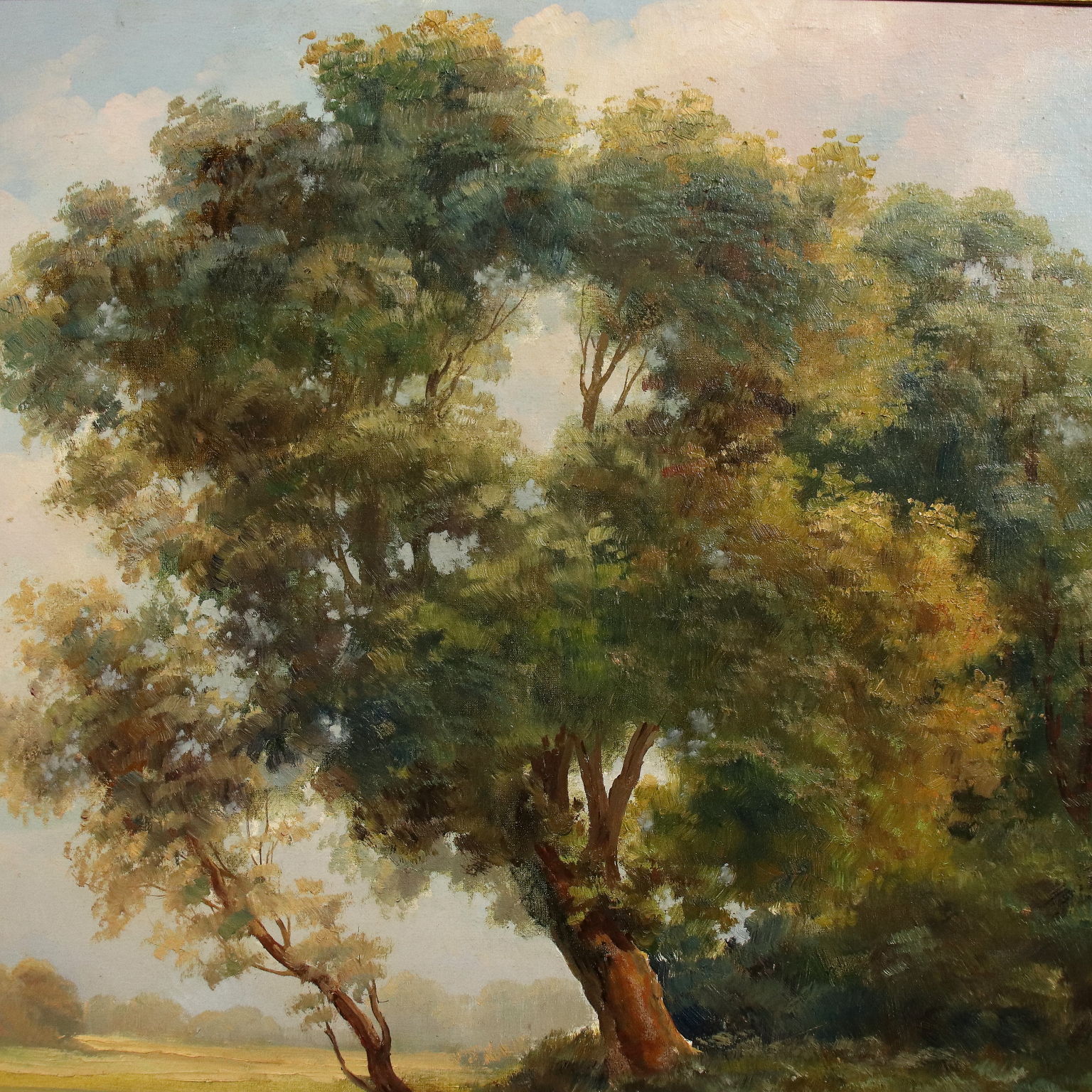 Olio su tela. Firmato in basso a destra. Omobono Grechi, detto Nino, pittore fiorentino, realizzò prevalentemente paesaggi luminosi e sereni di campagna verdeggiante, con piccoli specchi d'acqua e figurine pastorali. L'opera è presentata in cornice in stile.