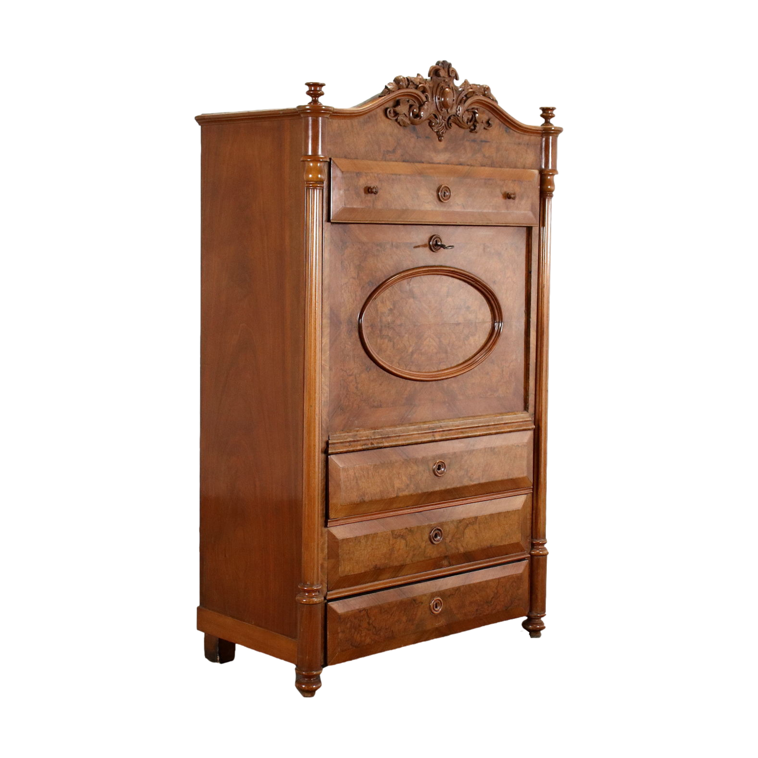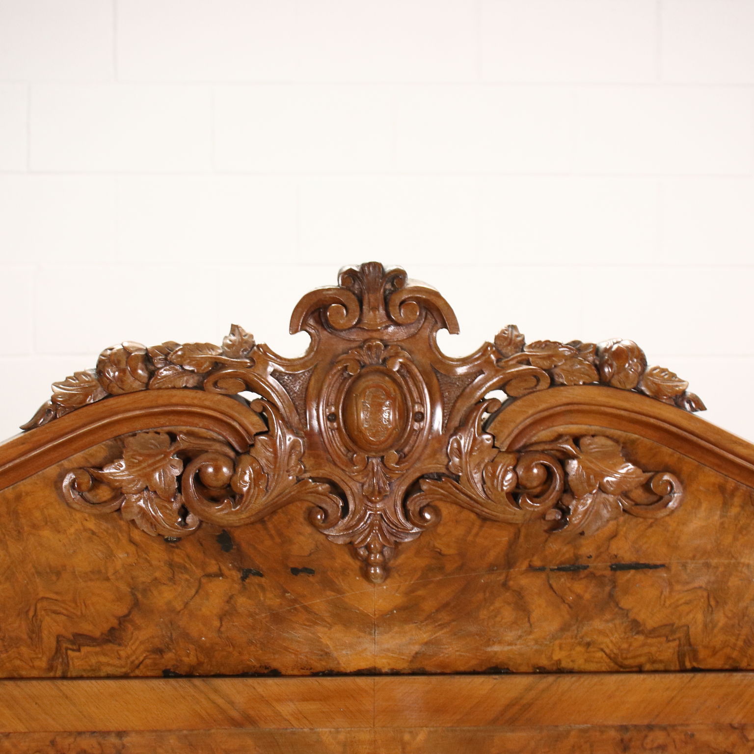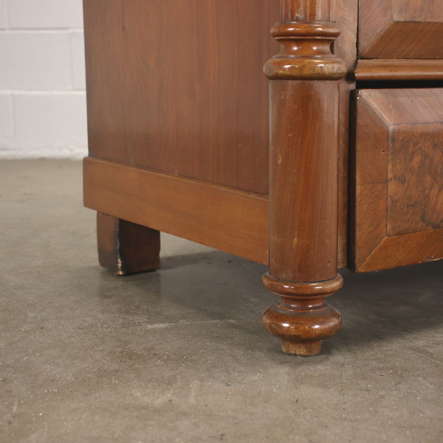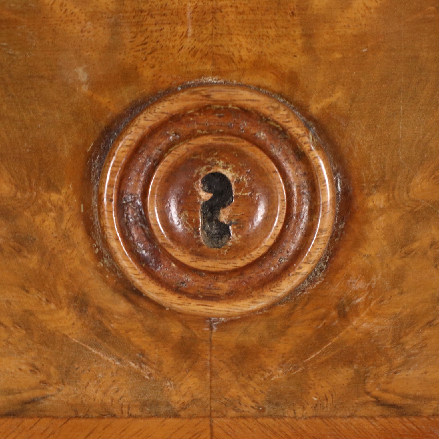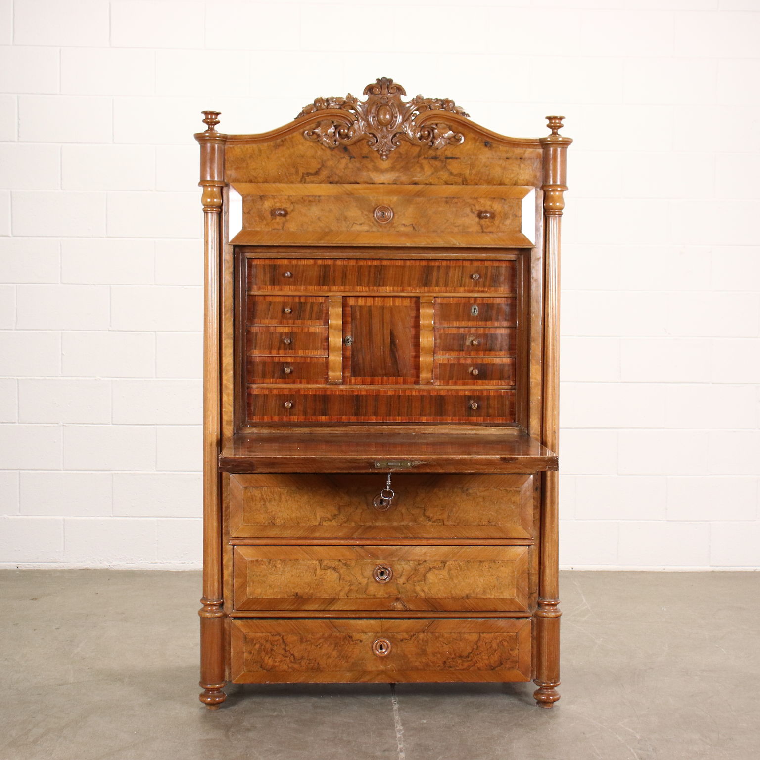 Secrétaire biedermeier con cimasa intagliata a stemma e motivi fogliacei, fronte impiallacciato in noce e radica di noce dotato di 4 cassetti e di anta a ribalta celante castello a 8 cassetti più scomparto centrale con riserve in bois de violette e cornici in bois de rose. Bocchette e maniglie in legno e lamierino, piedi a trottola. Interni in rovere e abete.