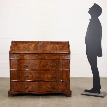 Ribalta barocca emiliana, sorretta da piedi a mensola, sul fronte mosso presenta tre cassetti sormontati da un'anta apribile a ribalta, celante scarabattolo con vano centrale e cassetti. Impiallacciata in noce e radica di noce, gli interni sono in pioppo; le maniglie sono state sostituite.