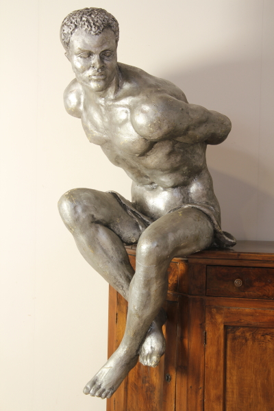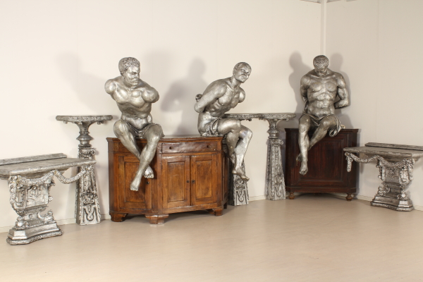 Uno di tre more di scenografia composta da tre mori argentati ripresi dai famosi mori dell'orologio di Piazza San Marco a Venezia una coppia di consolle e tre reggivaso realizzati in vetroresina legno e gesso e completamente argentati. Dai dati che si possono leggere sul retro delle consolles, possiamo risalire al contesto a cui fanno riferimento questi straordinari pezzi: si tratta di un allestimento dell'opera "Armide" di Christoph Willibald Gluck, rappresentata la prima volta a Parigi nel 1777 e qualche anno fa riproposta nella splendida esecuzione del Maestro Muti con le scenografie e la regia di Pier Luigi Pizzi. I pezzi proposti fanno parte della scenografia del IV atto e ben rievocano l'atmosfera di magia che permea tutto il libretto dell'opera, tratto da un episodio della Gerusalemme Liberata del Tasso.