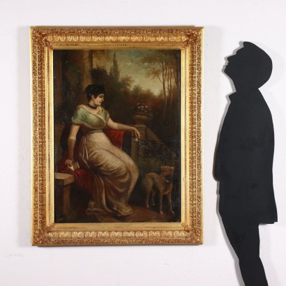 Olio su tela. Il ritratto propone una giovane donna, in abito elegante, seduta languidamente su una panchina in marmo a ridosso della villa che si affaccia sul giardino, con un libro appoggiato di fianco ma intenta a guardare il cane ai suoi piedi. Spiccano i toni chiari del suo incarnato e delle sue vesti sul rosso vivace del tela su cui è seduta; tutti gli elementi di contorno, il cane, la villa, il giardino, sono invece proposti in gamme del beige e dei bruni, che sfumano e diventano meno dettagliati man mano che si allontanano dalla figura. Il ritratto risulta ancora di sapore romantico e venato di malinconia. Ritelato, è presentato in cornice in stile.
