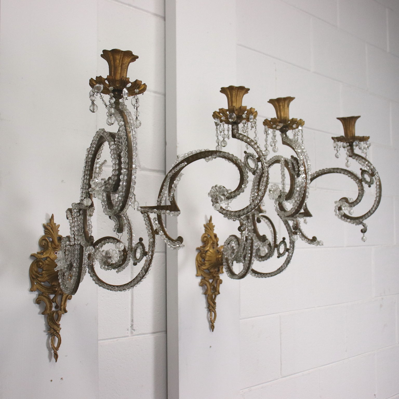 Coppia di applique in stile barocchetto a 2 luci. Struttura in bronzo dorato; collane e pendenti in vetro.