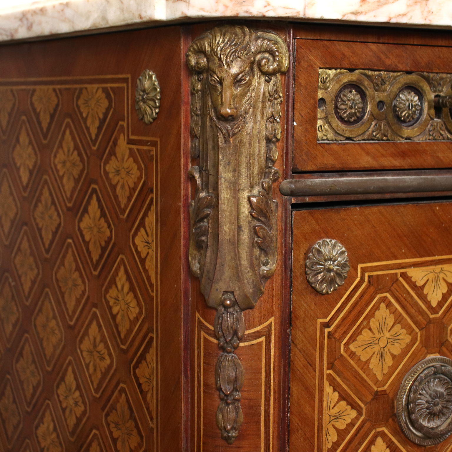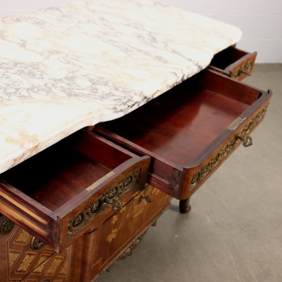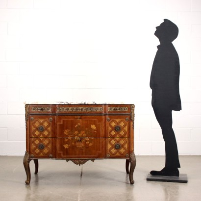 Commode in stile, sorretta da gambe mosse rivestite in bronzo, sul fronte spezzato presenta due cassetti, sormontati da altri tre posti nella fascia sottopiano. Al centro del fronte presenta riserva con intarsio floreale, mentre ai lati riserve a marquetterie, riproposte anche sui fianchi. Ornato con applicazioni bronzee, il piano è in marmo.
