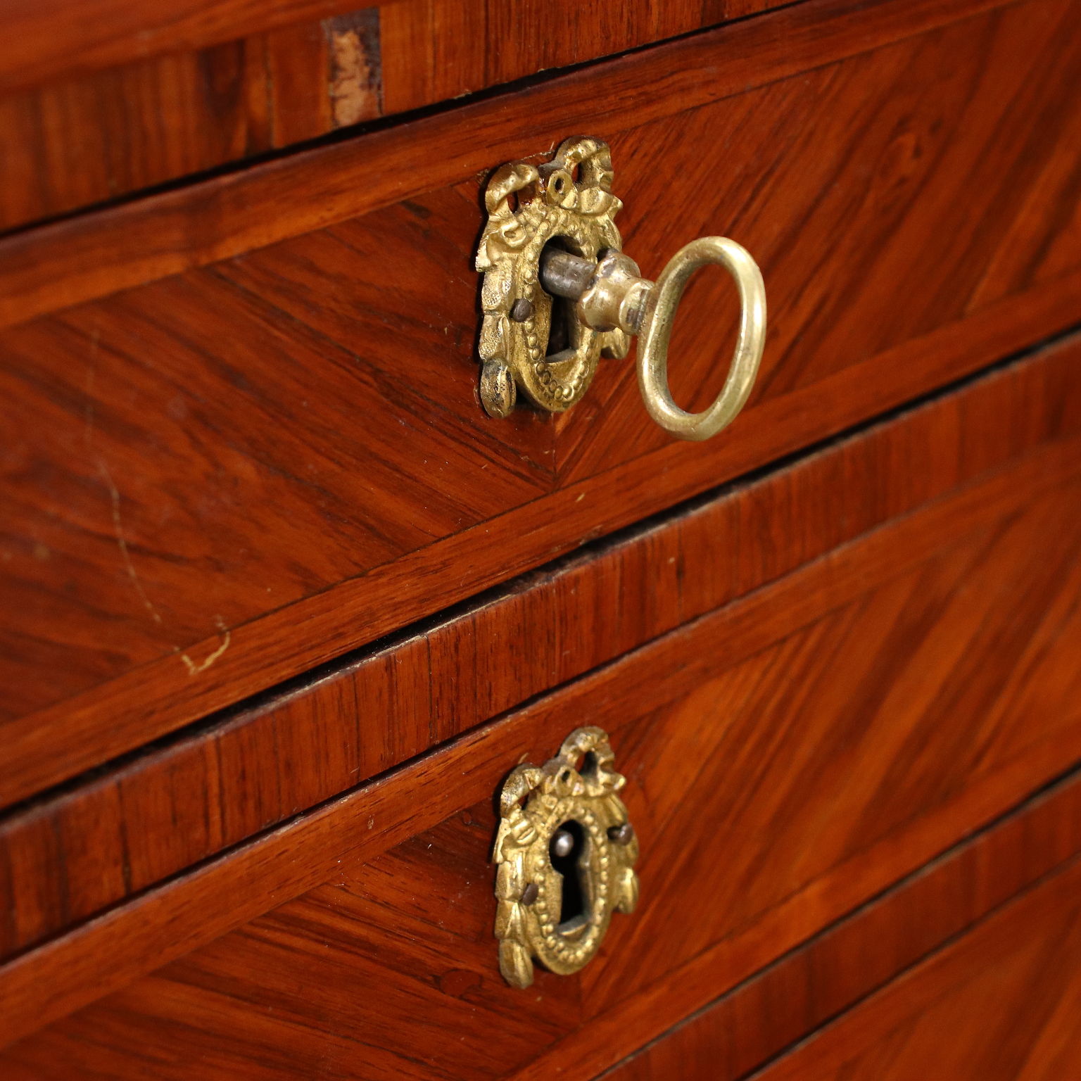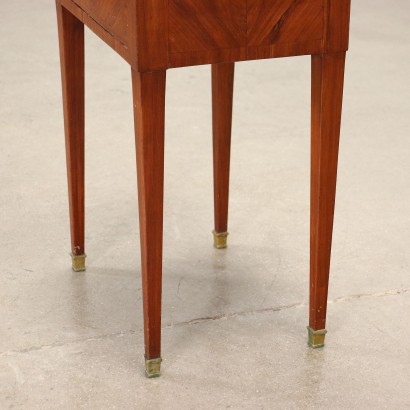 Comodino direttorio francese finito a giorno con piano a vassoio, 3 cassetti sul fronte, bocchette di gusto neoclassico in bronzo dorato, gambe troncopiramidali e piedi in bronzo dorato. Lastronato in bois de violette, sul piano steso in una riserva quadripartita. Interni in rovere. Preserva ancora l'etichetta di un antiquario parigino di inizio 900. Chiave mancante.