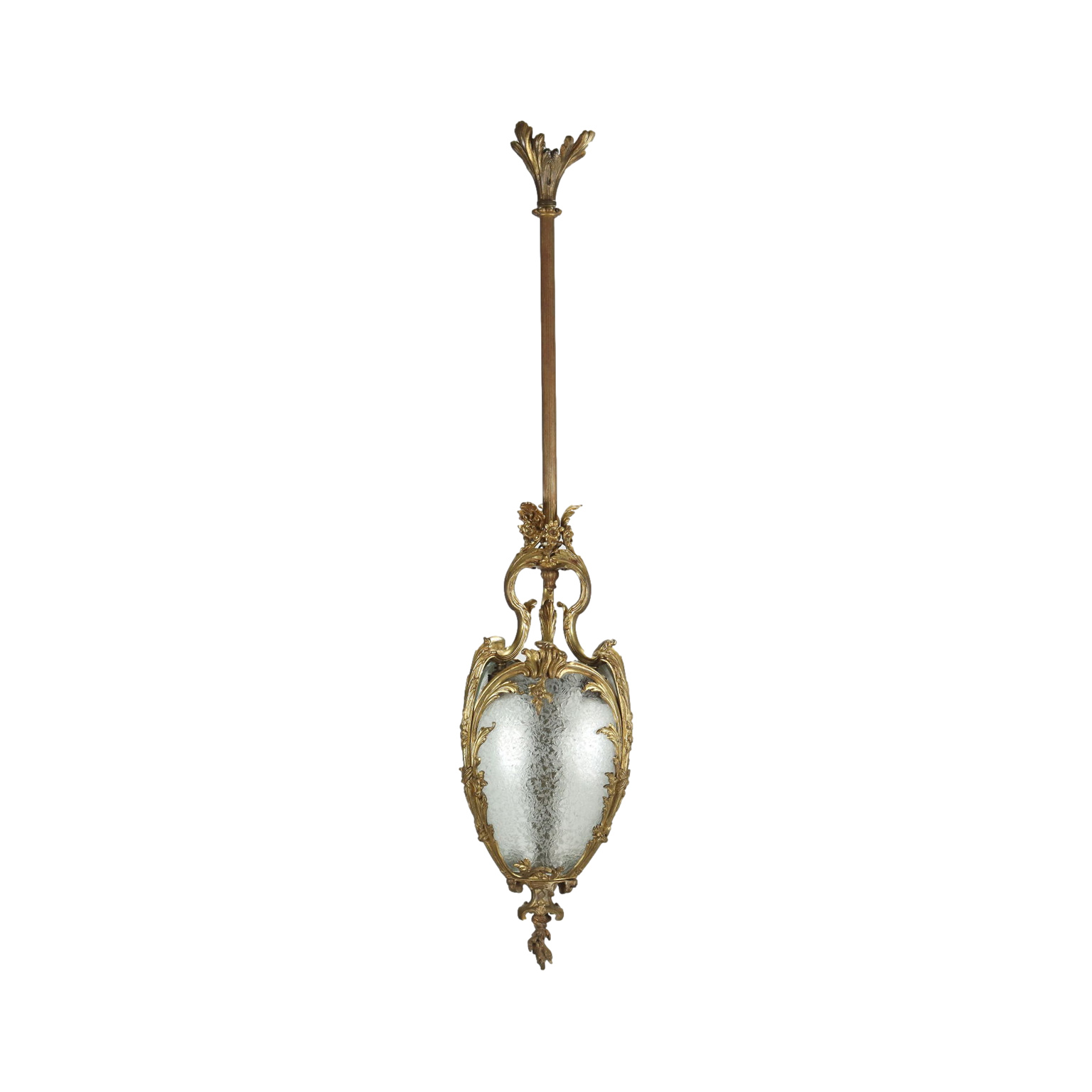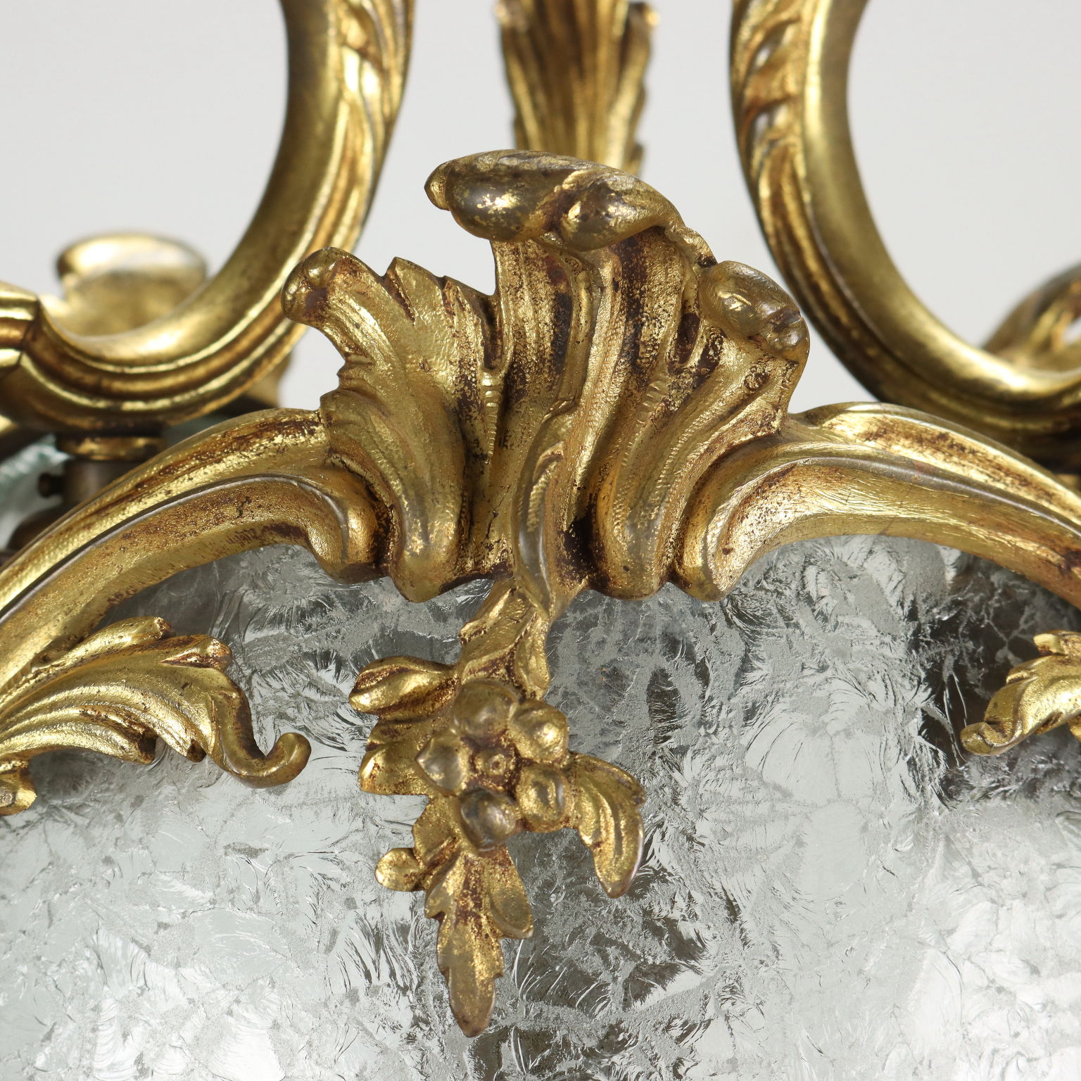 Lampadario Liberty in bronzo dorato lavorato a motivi fogliacei, boccia in vetro.