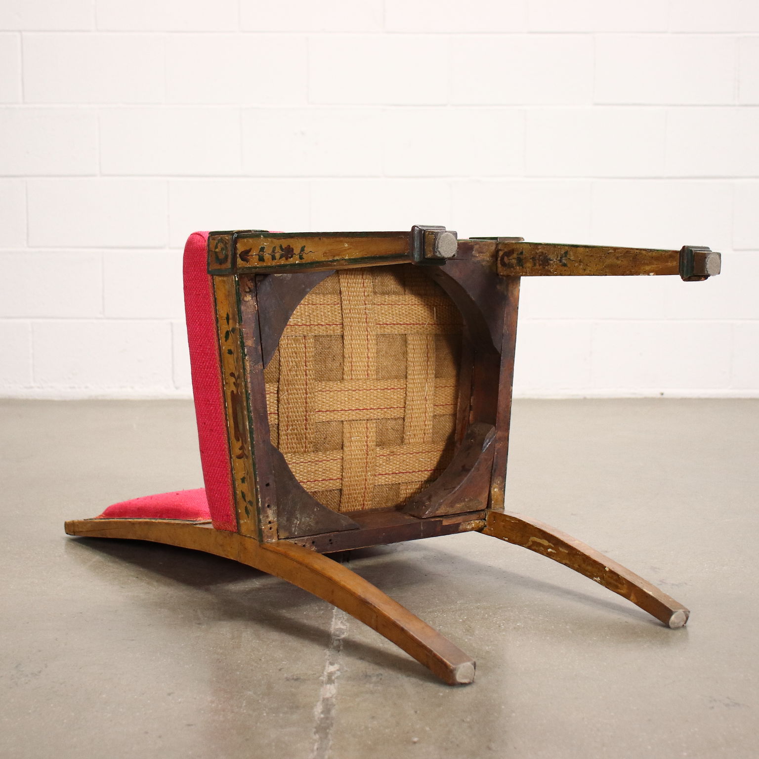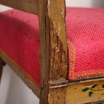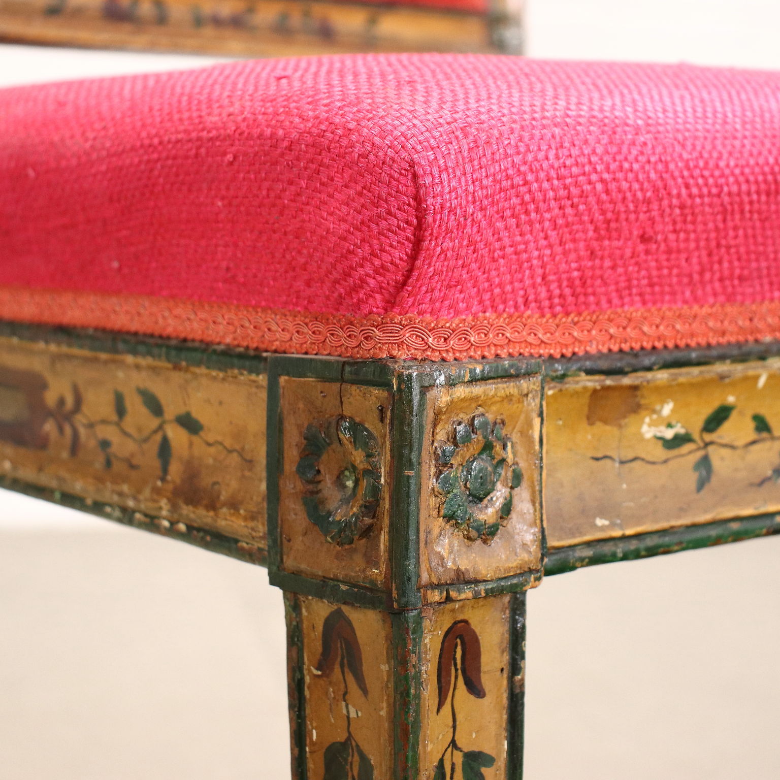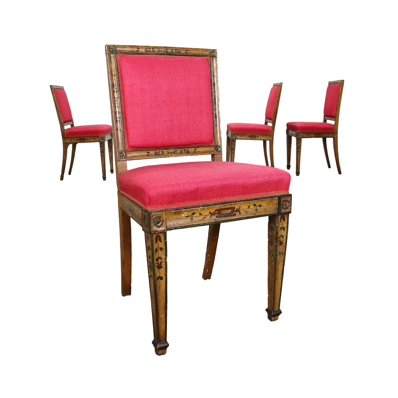 Gruppo di 4 sedie neoclassiche veneziane in legno laccato e dipinto, con schienale e seduta imbottiti e gambe anteriori troncopiramidali. Apparato decorativo composto da campanelle e roselline dipinte e da rosette intagliate nei punti di intersezione.