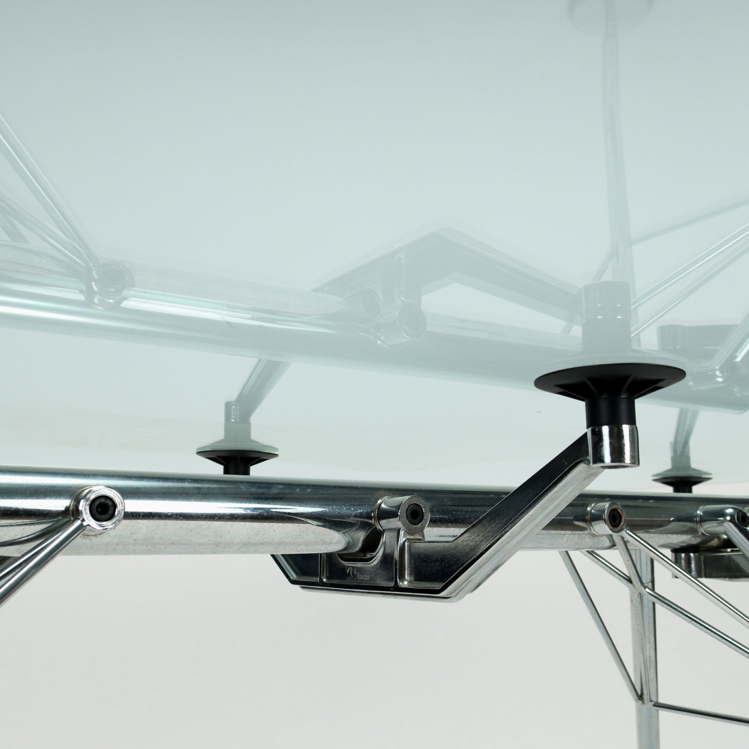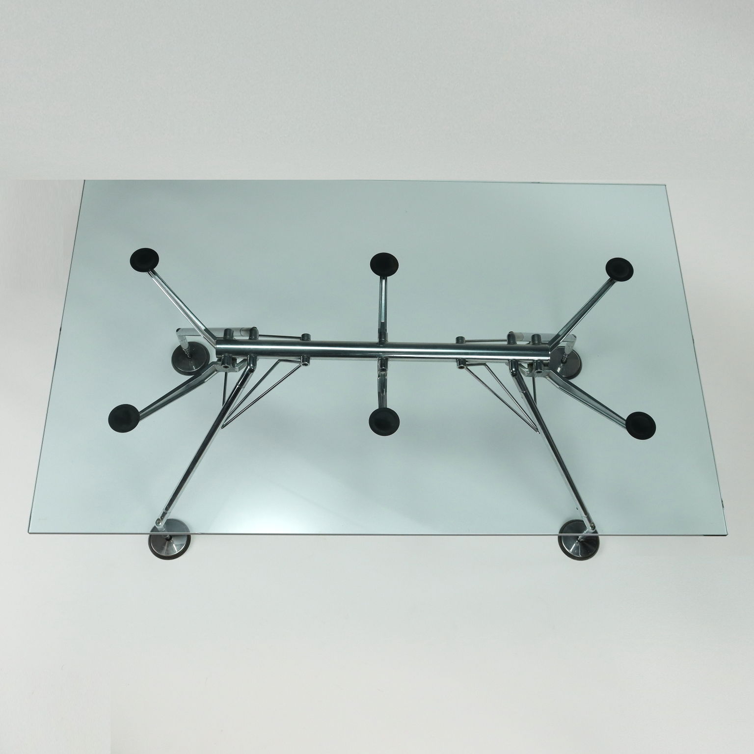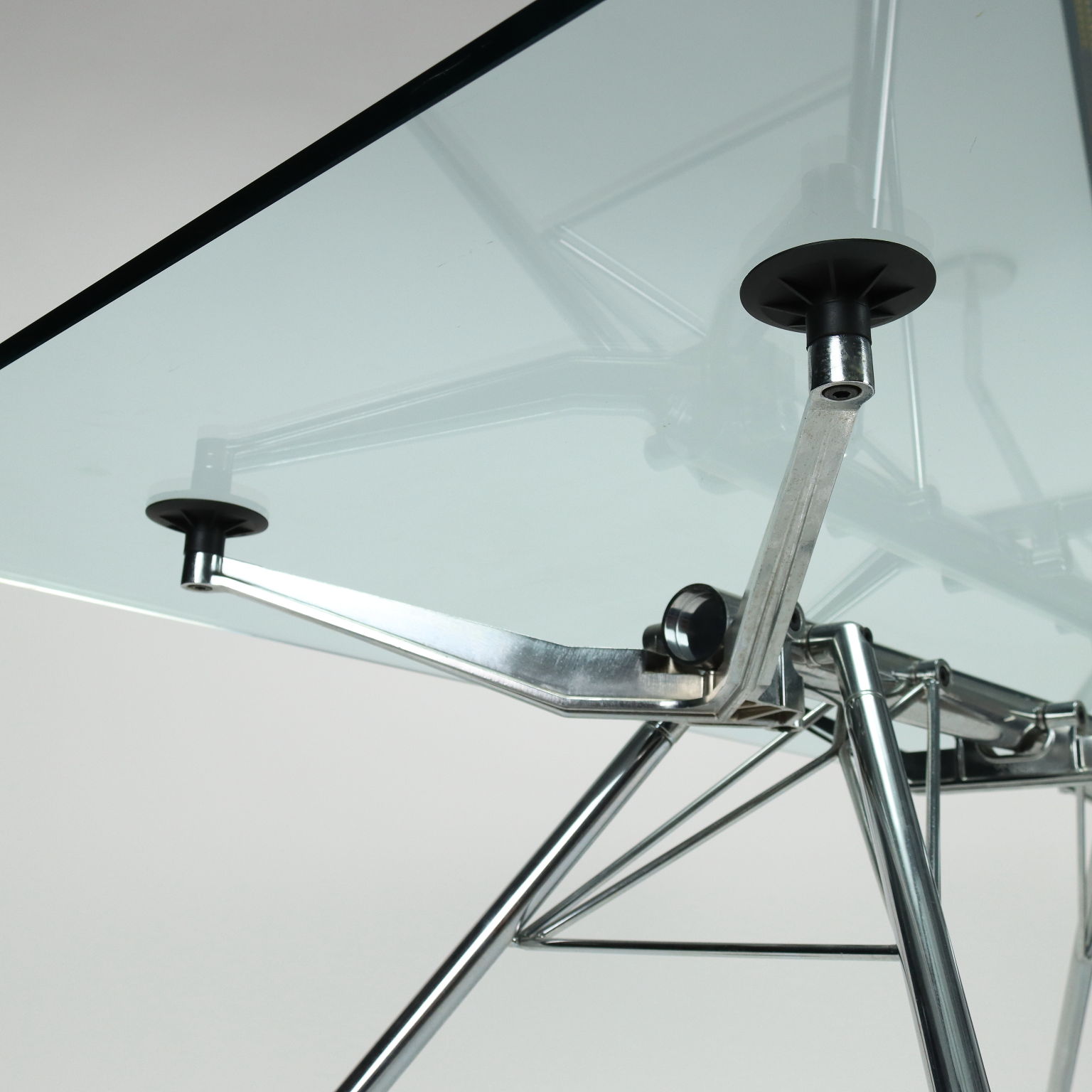 Tavolo con base in metallo cromato e piano in vetro.