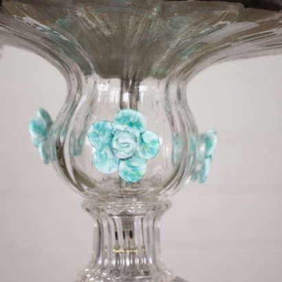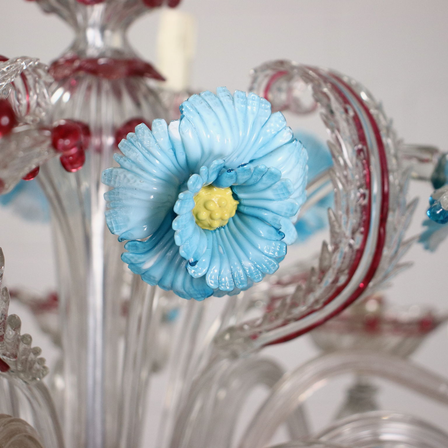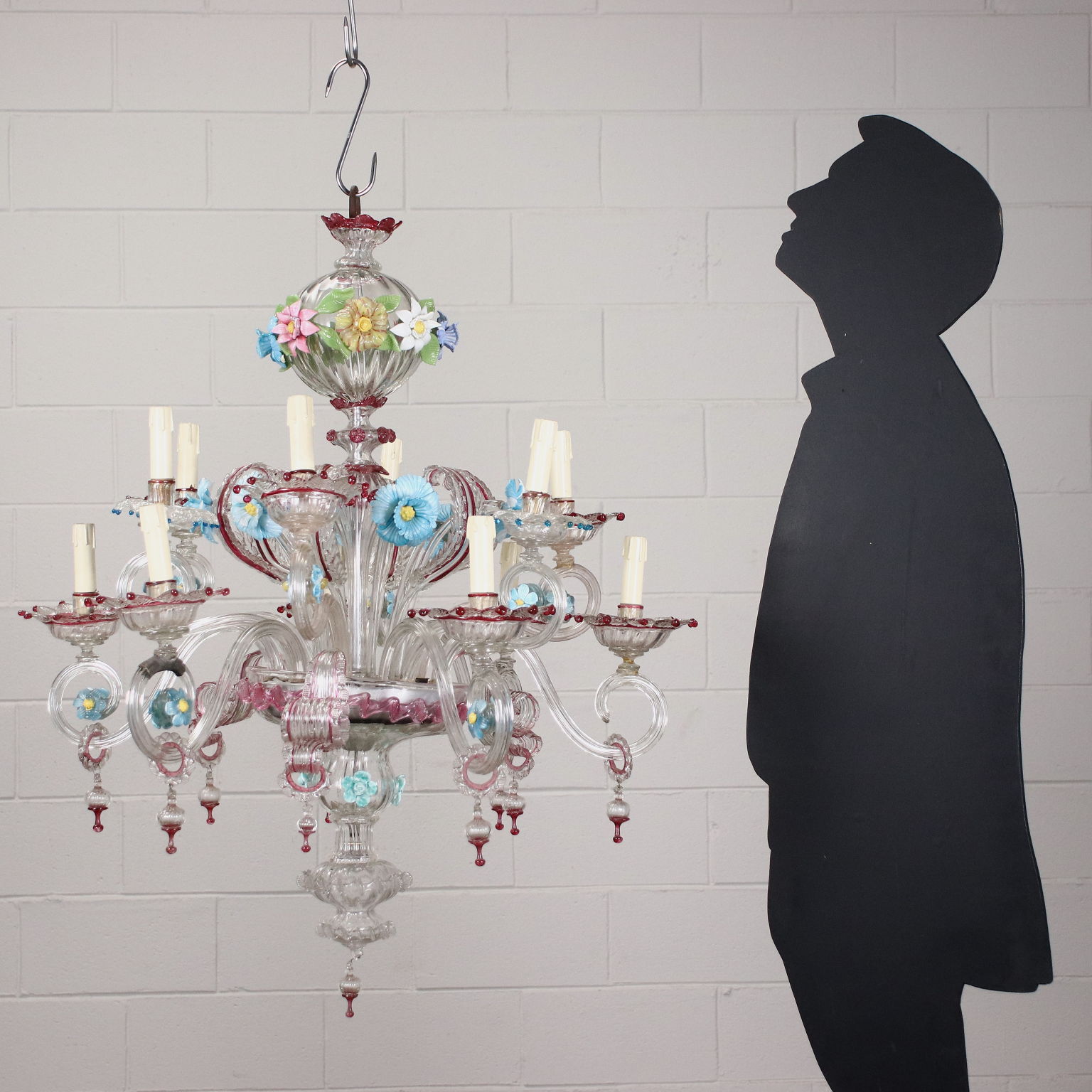 Lampadario Murano in vetro soffiato e vetro soffiato colorato, a 12 luci su doppio palco; presenta rotture e restauri.
