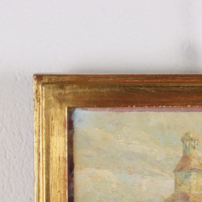 Olio su cartone. Firmato in basso a sinistra. Al retro presente il nome con il titolo, che ubica il piccolo scorcio in Albania nel 1916, durante la I guerra mondiale. Presente timbro di provenienza da collezione privata. Alfonso Corradi, nato in Emilia ma formatosi e vissuto poi a Milano, fu studente di ornato all'Accademia di Brera e per alcuni anni si dedicò anche alla scenografia. Si specializzò nel paesaggio e intraprese una carriera espositiva concentrata soprattutto a Milano. Il soggetto qui proposto, benchè a carattere paesaggistico, rientra in una produzione rara di una serie di piccoli quadretti, quasi bozzetti, che riconduce alla prima guerra mondiale, in particolare alla spedizione militare di un corpo italiano in Macedonia nel 1916, inviata dal governo allo scopo di contrastare le forze austro-ungariche e bulgare nel corso della prima guerra mondiale e di controllare quel territorio. Non si ha peraltro ha documentazione della partecipazione diretta del pittore a tale campagna bellica. Il dipinto è in cornice.