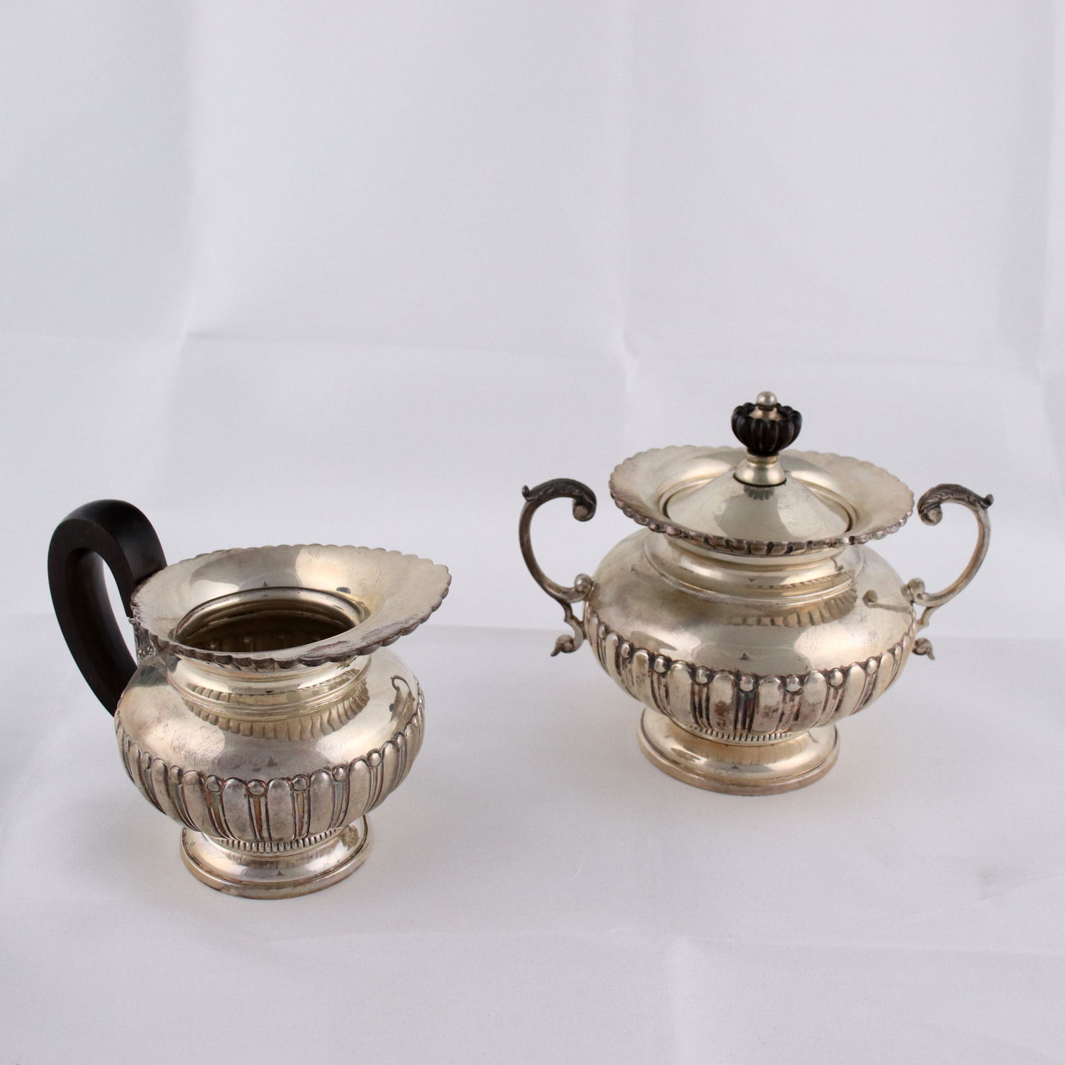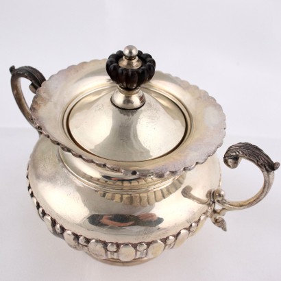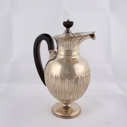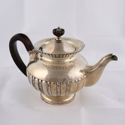 Servizio in argento sbalzato e baccellato con prese in legno. Servizio composto da teiera, caffettiera, zuccheriera e lattiera. Marchio dell'argento incusso, quello dell'argentiere poco decifrabile. Grammi 2200 ca.