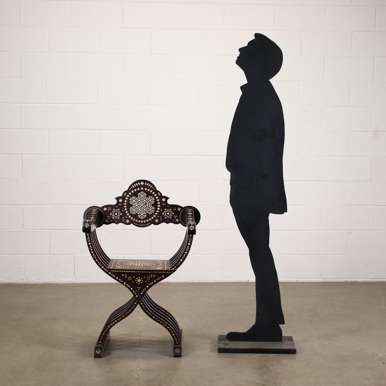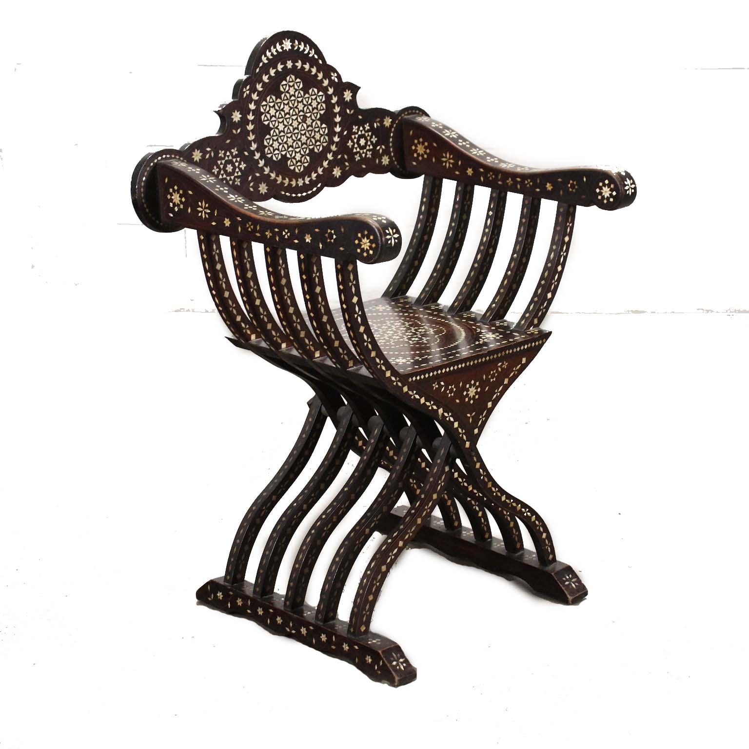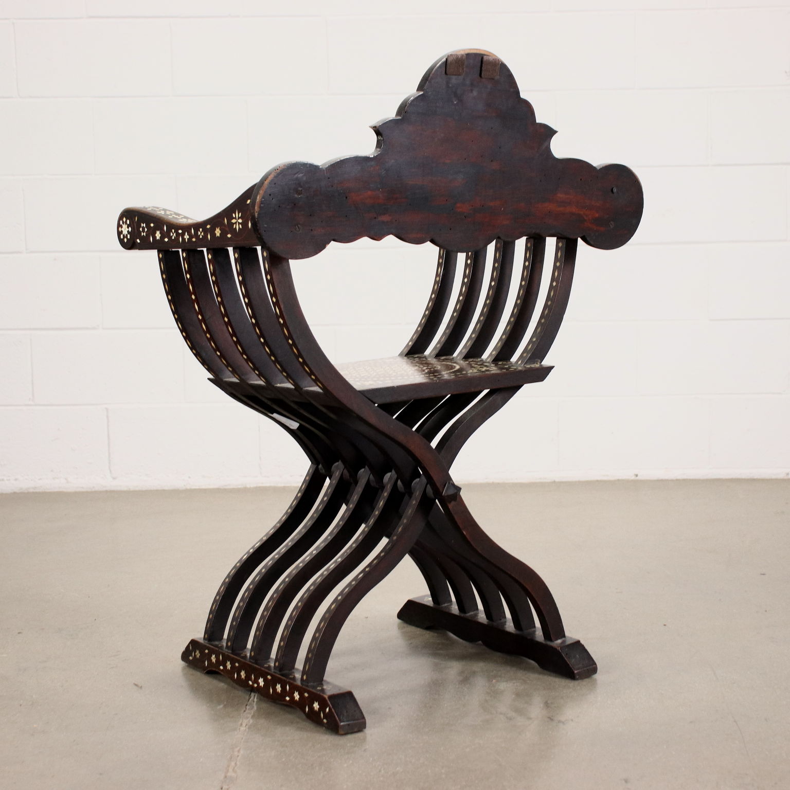 Sedia modello Savonarola, seconda metà XIX secolo. In noce, la sedia è interamente intarsiata alla certosina, alla maniera di Adriano Brambilla, noto intarsiatore attivo a Milano nel XIX secolo.