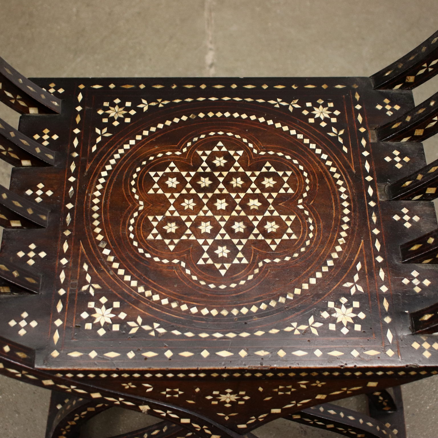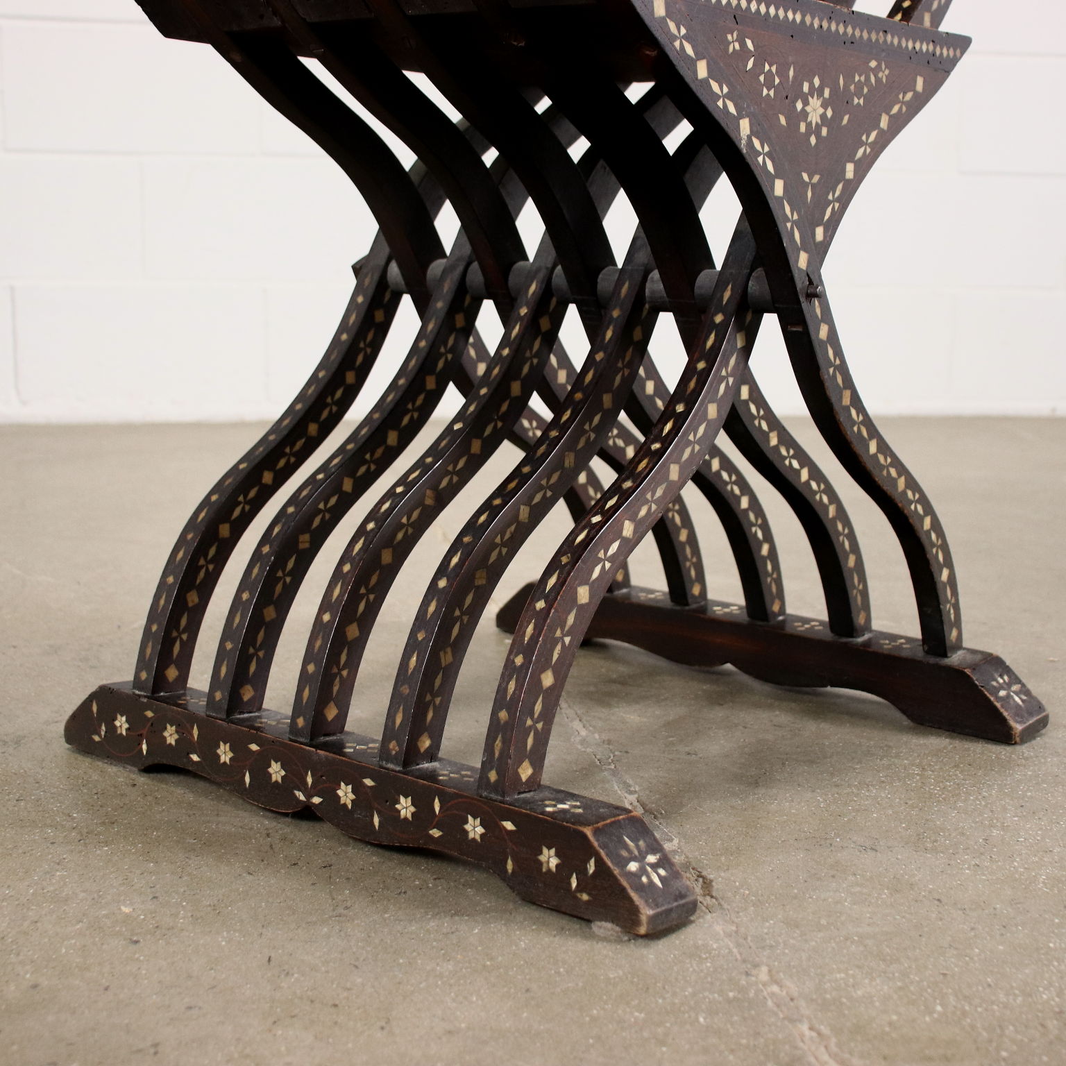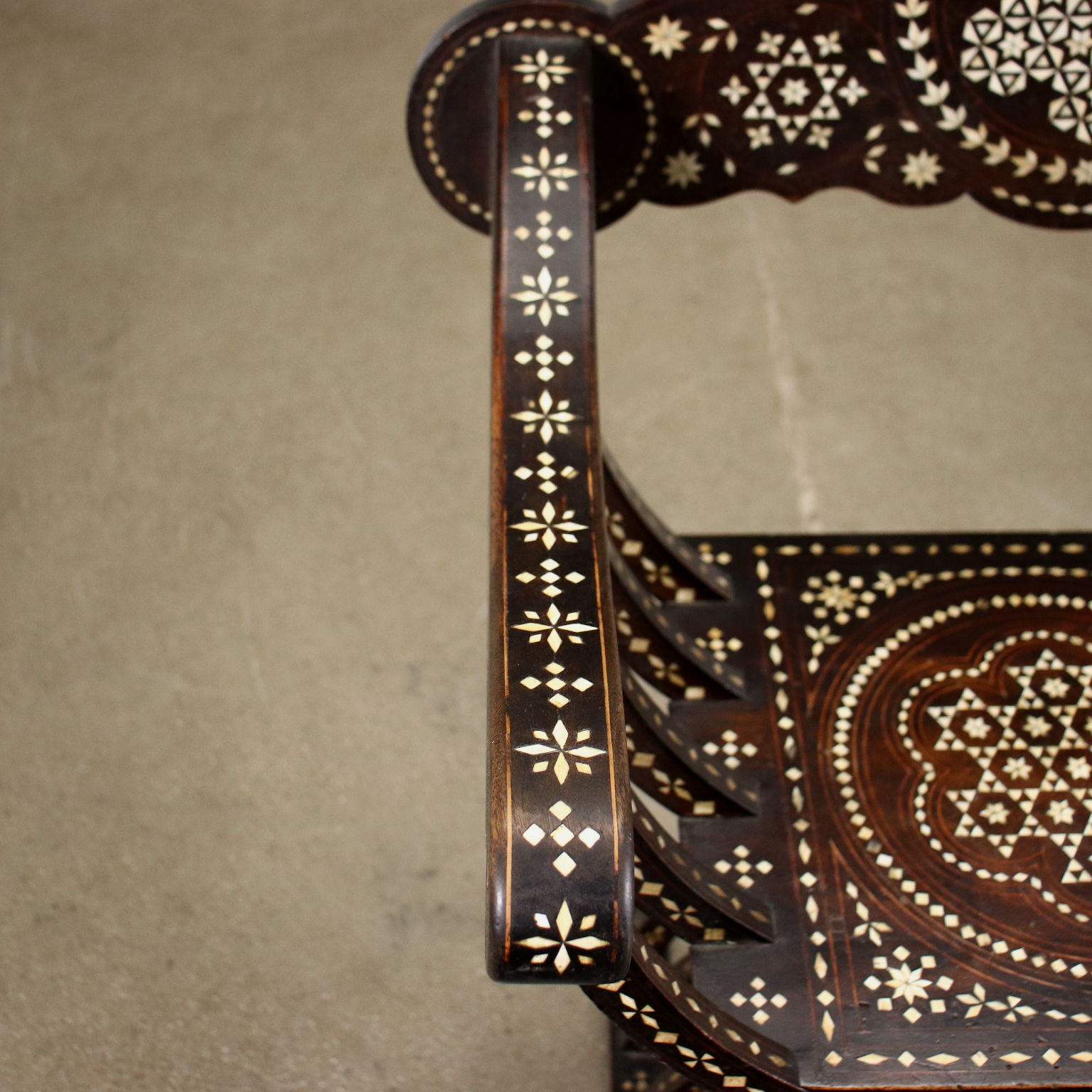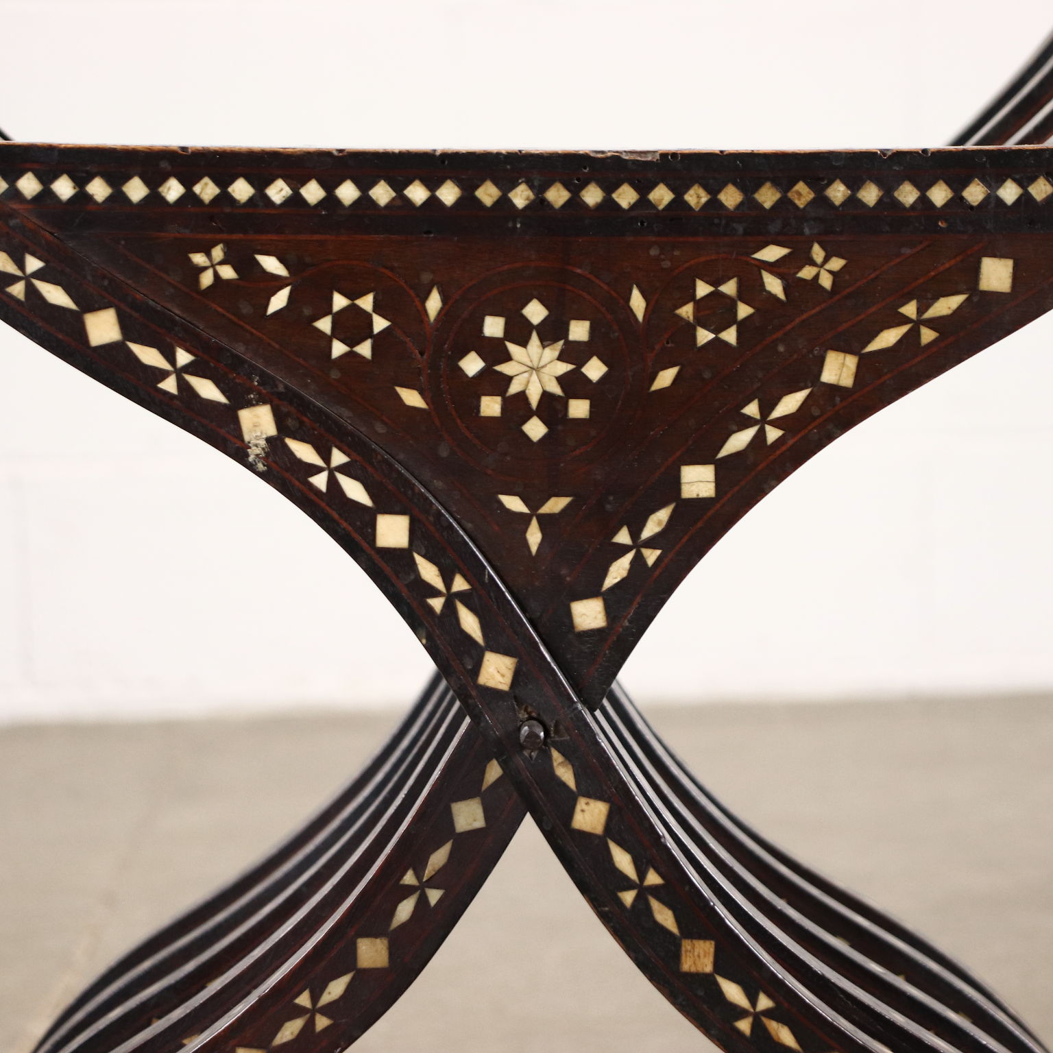 Sedia modello Savonarola, seconda metà XIX secolo. In noce, la sedia è interamente intarsiata alla certosina, alla maniera di Adriano Brambilla, noto intarsiatore attivo a Milano nel XIX secolo.