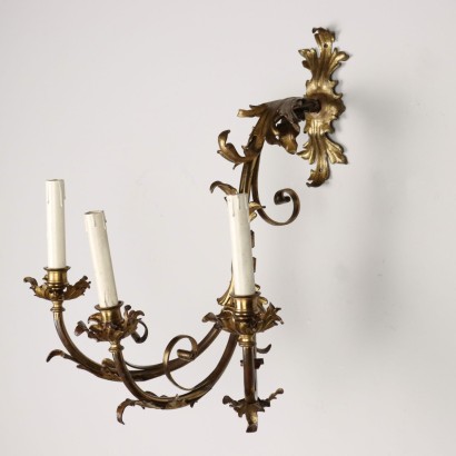 Applique in stile a 3 luci in ottone e bronzo dorati, Italia XX secolo. Decorata a motivi fogliacei.