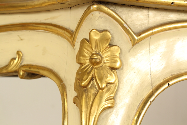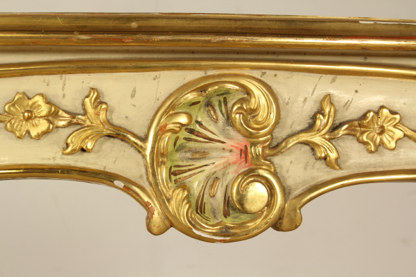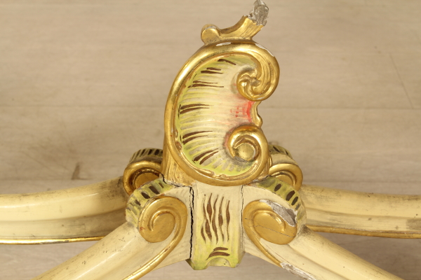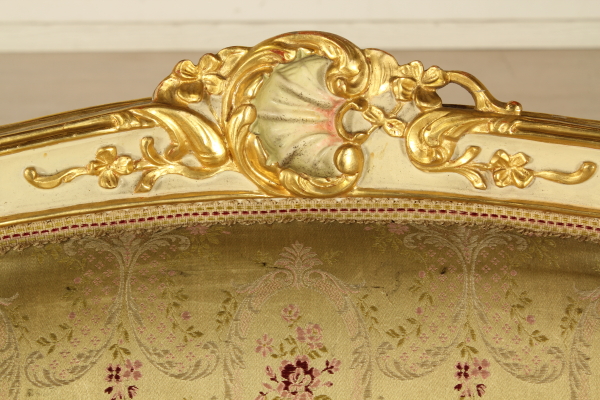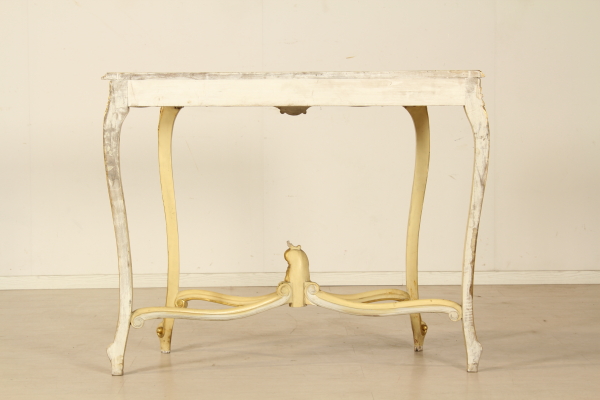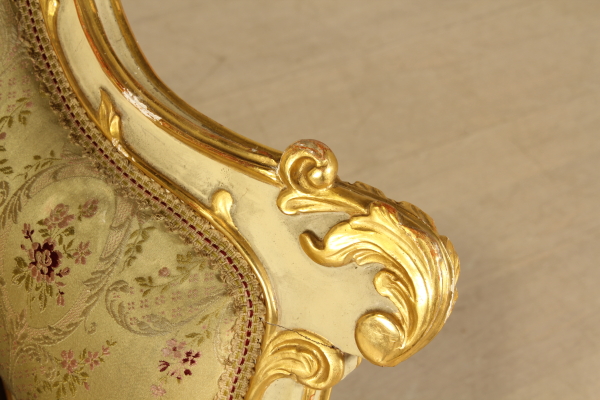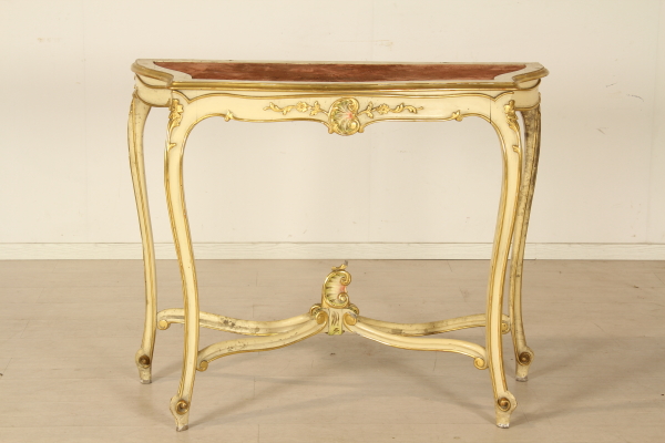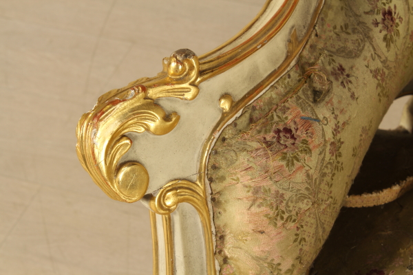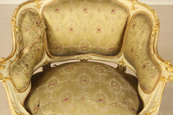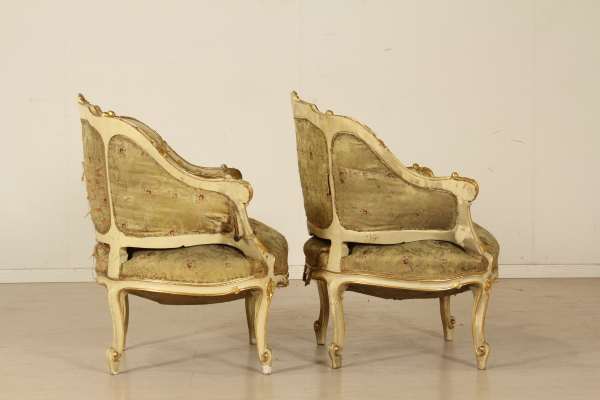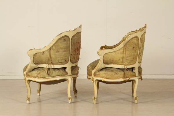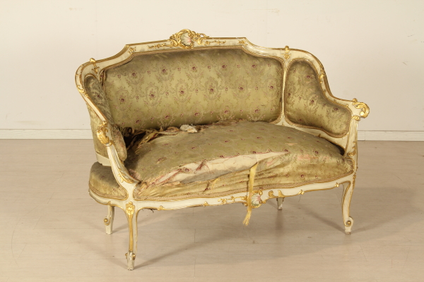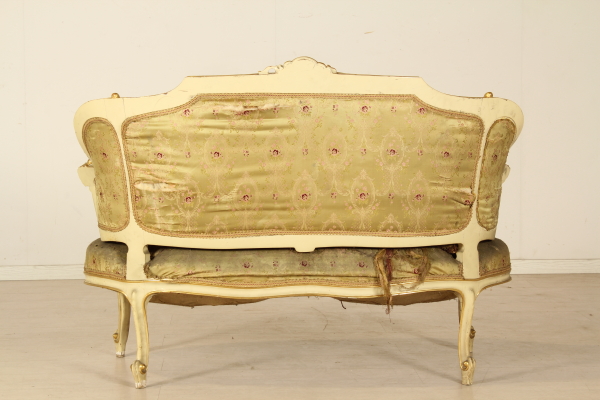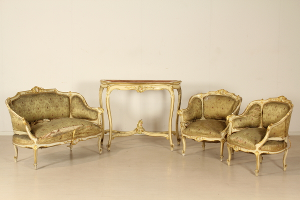 Salotto composto da Divano: 85x122x66, Coppia di poltrone: 85x75x66 e Console. 88x109x50. Le sedute sono realizzate a Corbeille secondo il gusto Luigi XV francese. Laccati in avorio con rilievi intagliati e dorati a guazzo.