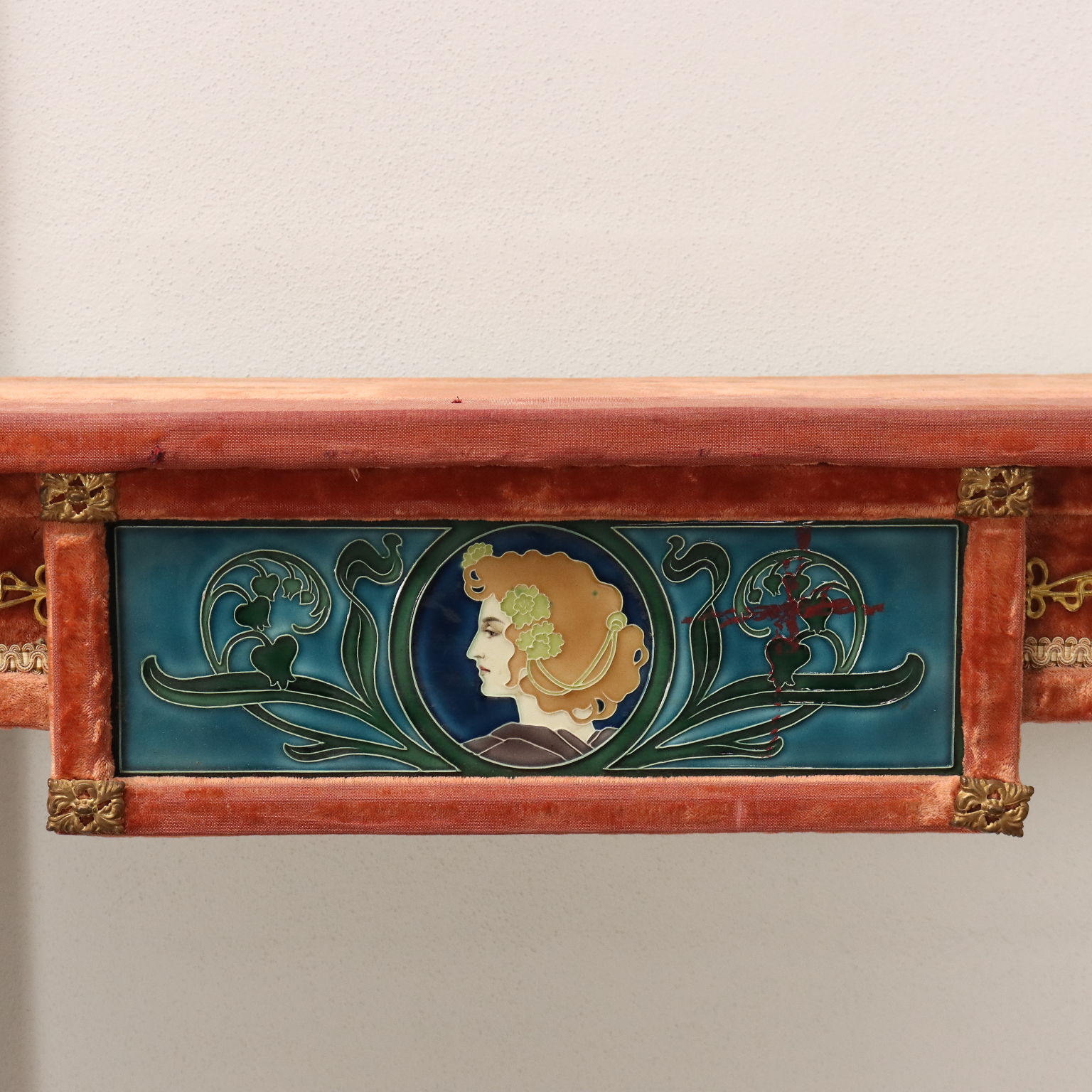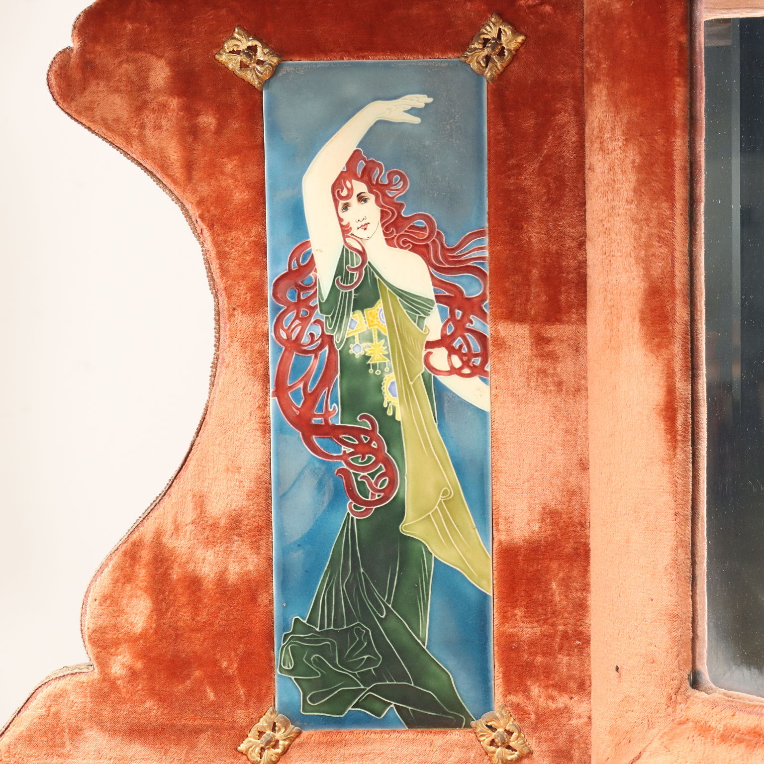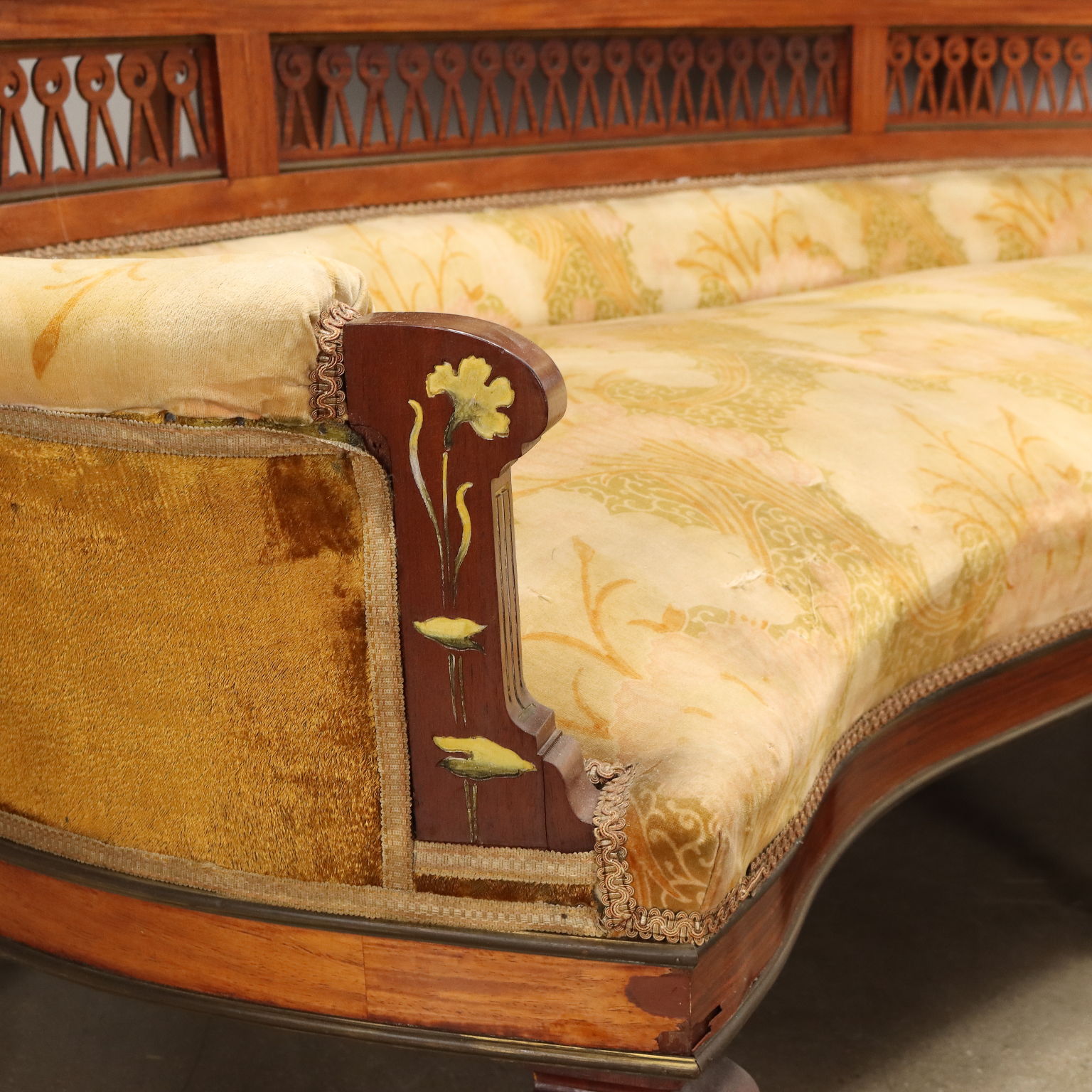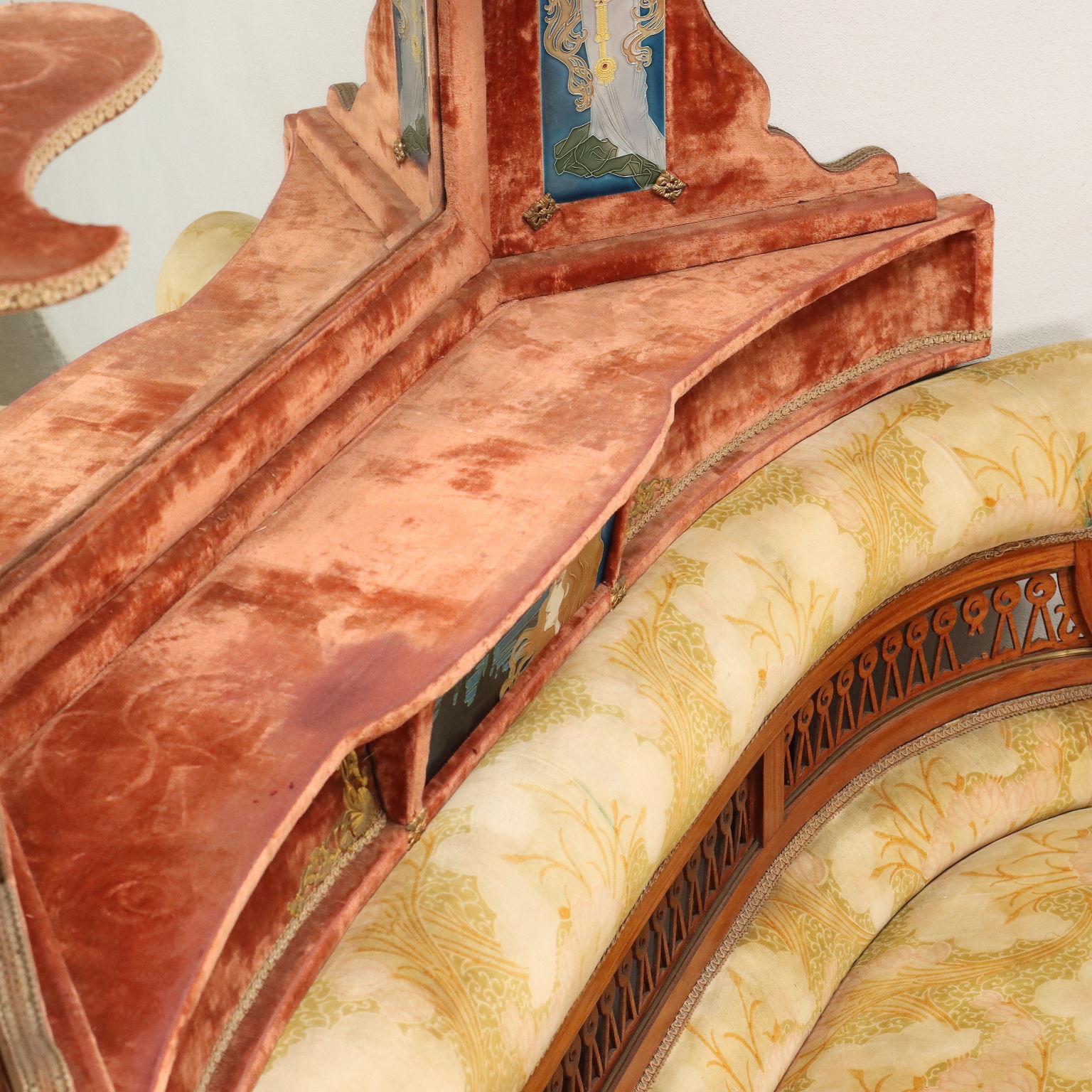 Divano d'angolo curvo con alzata con mensola e specchio. Il divano realizzato in mogano presenta piedi mossi e braccioli con intagli a "colpi di frusta" e fiori tipici rimarcati da doratura, nello schienale motivo traforato. Stoffa originale di gusto floreale. L'alzata rivestita in velluto rosso, cin specchio centrale, presenta delle formelle in ceramica viennese liberty con le tipiche figure femminili con riferimenti alla danza e musica. Decorazioni in bronzo dorato. Piccoli danni e mancanze