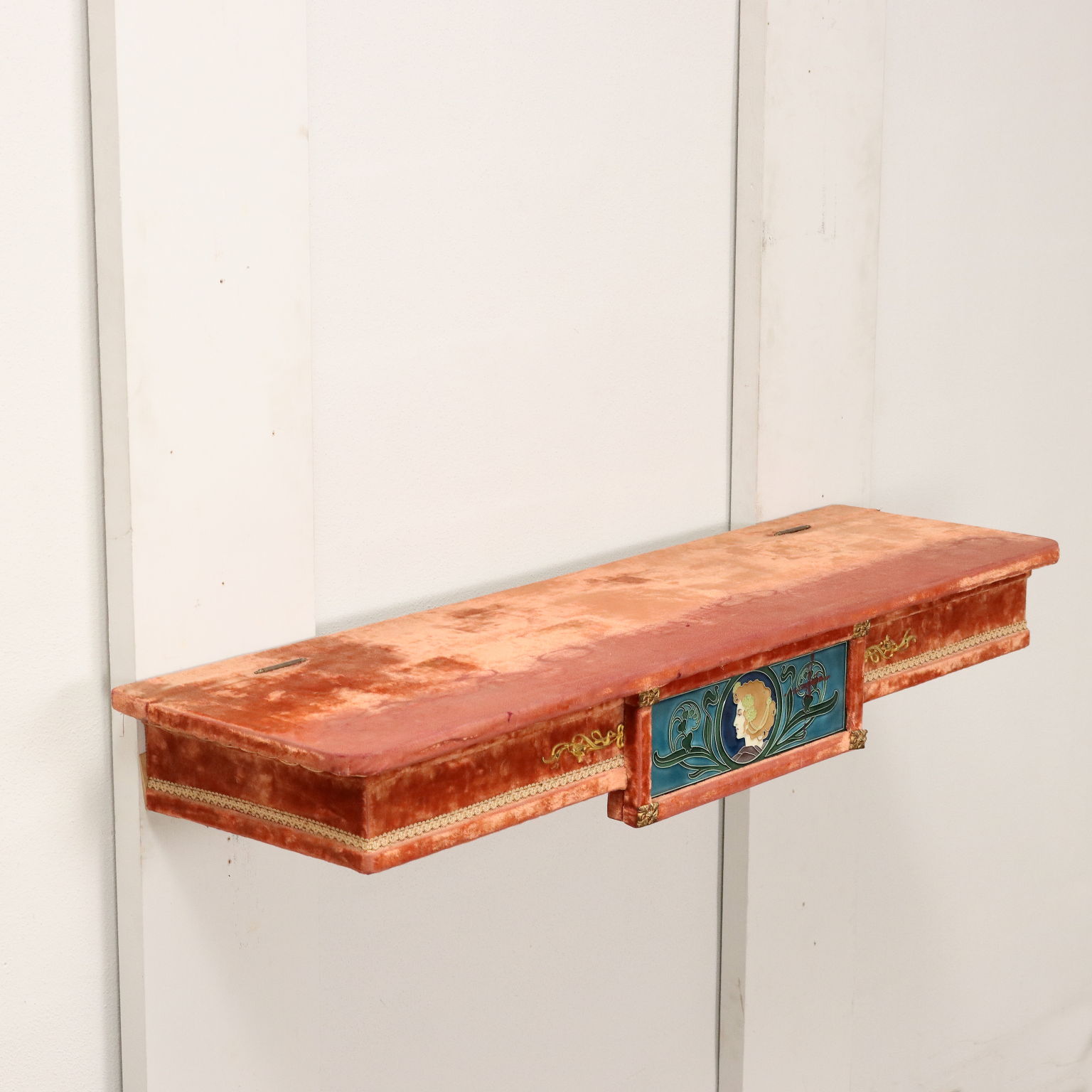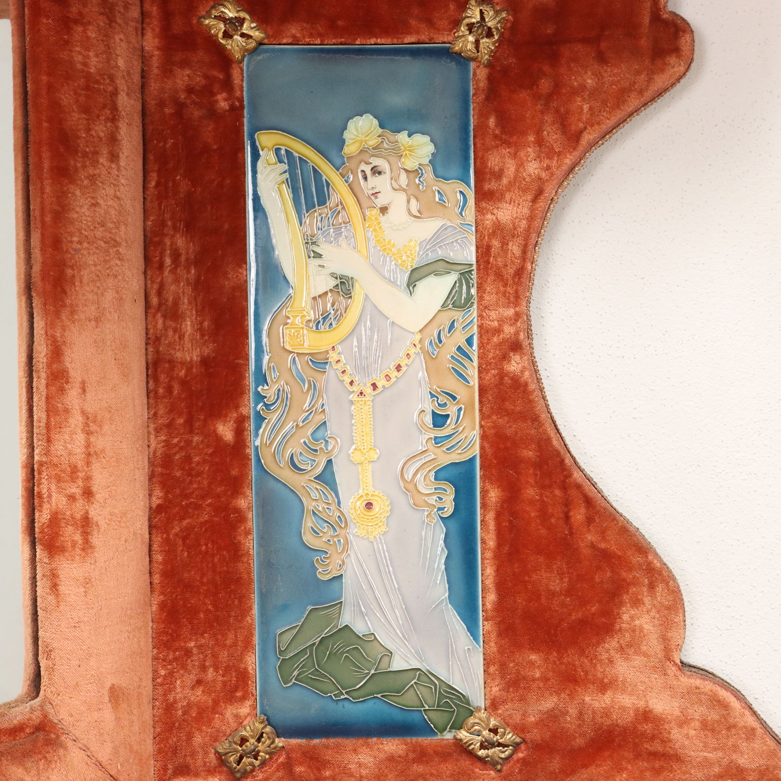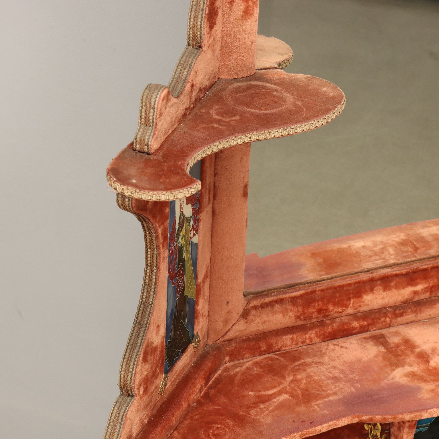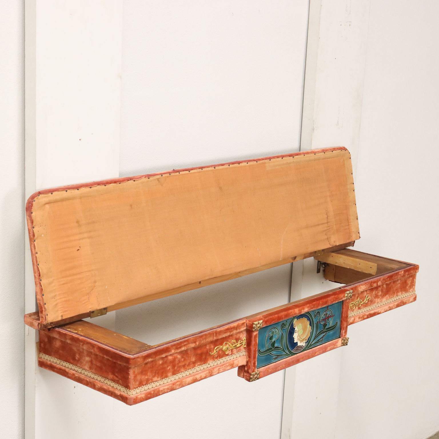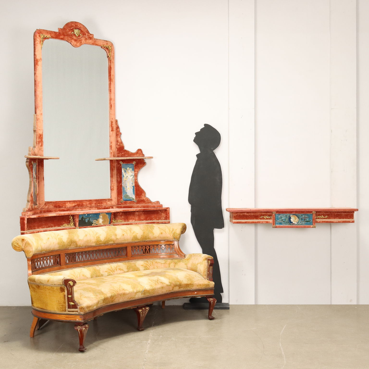 Divano d'angolo curvo con alzata con mensola e specchio. Il divano realizzato in mogano presenta piedi mossi e braccioli con intagli a "colpi di frusta" e fiori tipici rimarcati da doratura, nello schienale motivo traforato. Stoffa originale di gusto floreale. L'alzata rivestita in velluto rosso, cin specchio centrale, presenta delle formelle in ceramica viennese liberty con le tipiche figure femminili con riferimenti alla danza e musica. Decorazioni in bronzo dorato. Piccoli danni e mancanze